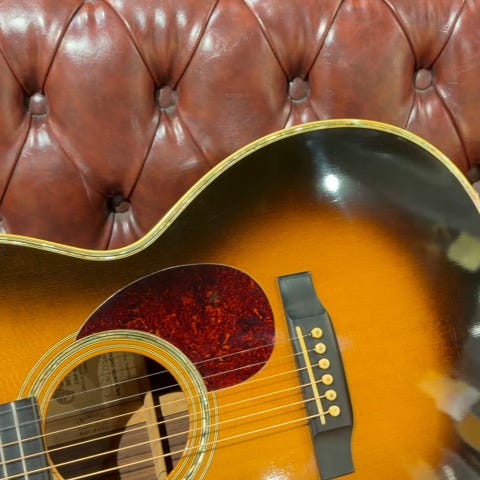1984年から1990年代前半にかけて実施されたギターオブザマンス(Guitar of the Month)。既存のスタイルをベースに特別仕様化したモデルが毎年数種類、製作されました。本器は1994年ギターオブザマンスの1本”OM-40LE サンバースト”。こちらはナチュラルフィニッシュが57本、サンバーストが29本のみ生産されました。スプルーストップ、ローズウッドサイド&バック、マホガニーネック、エボニー指板&ブリッジ、オリジナルインレイ入りエボニーボタンマーチンゴールドペグ。トップのトリムとロゼッタはソリッドアバロンを二重に重ねる贅沢仕様。ヘッドロゴ、ペグボタンにまで貝を使用した何ともゴージャスな1本です。過去にダブルピックガード仕様になされた痕跡があり、現在は追加のピックガードは外されていますが薄っすらとトップの日焼け感の違いが確認出来ます。また、トラスロッドはすでに限界まで締めておりますが現状のネックコンディションは良好で弦高も標準的な設定です。トップ下部にやや目立つ打痕があるものの割れなどの大きなダメージはなく、OMらしい張りのあるトーンと艶やかなサウンドを存分にお楽しみいただけます。中々市場に出回らない1994年度ギターオブザマンス、”OM-40LE” のサンバーストフィニッシュ。ぜひご検討くださいませ。