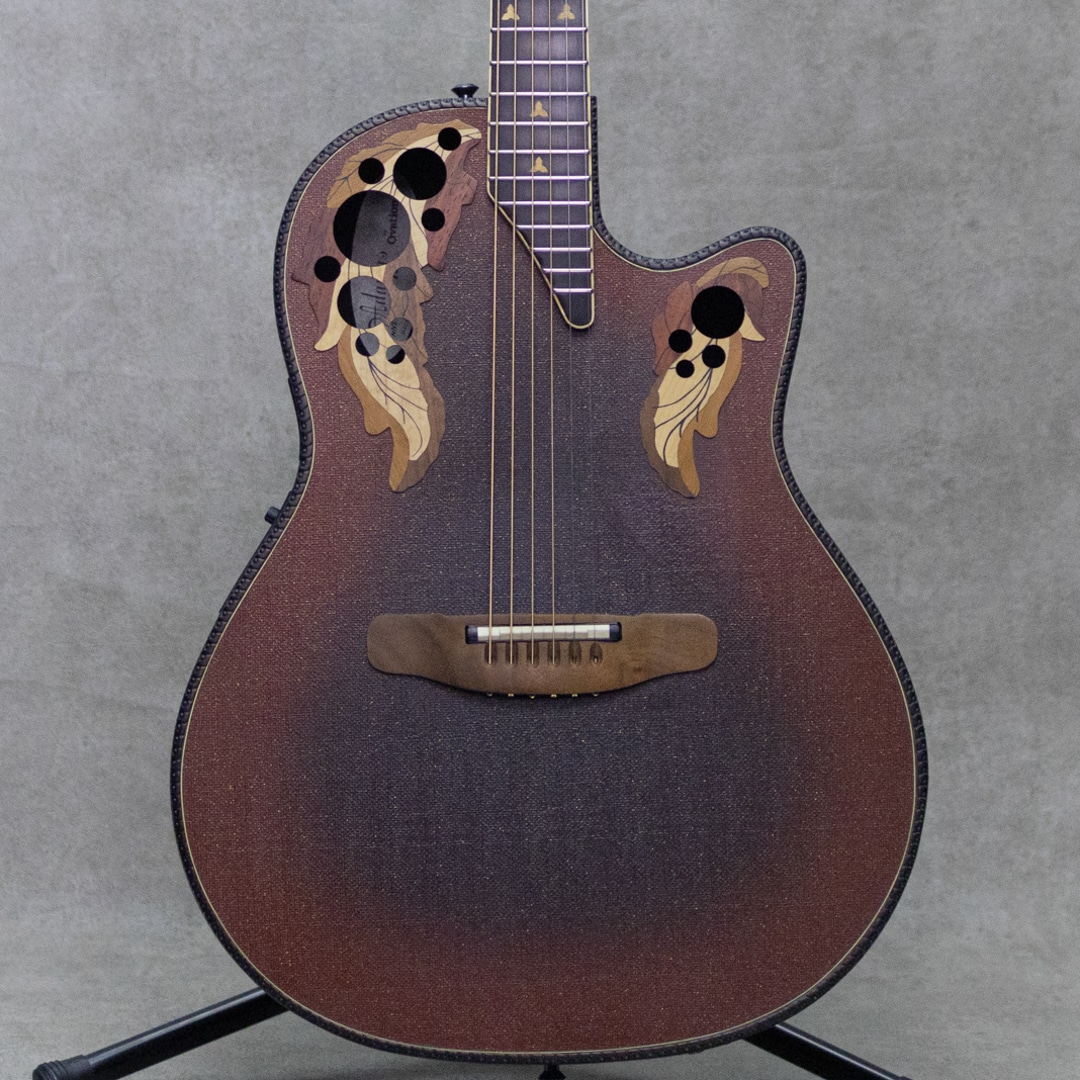 オベーションカスタムレジェンド"1769"。華やかな装飾とブラックカラーのシックさの対比がまとまりのあるルックス、豊かなボディ鳴りがグッドな1992年製USED品。