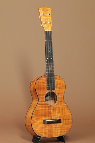 愛知県にて福原氏、小野寺氏の二人にて製造されるハンドメイドウクレレ。スロテッドヘッド、メイプルバインディング、アバロントリムの豪華なルックスのカスタム仕様のテナーモデル。