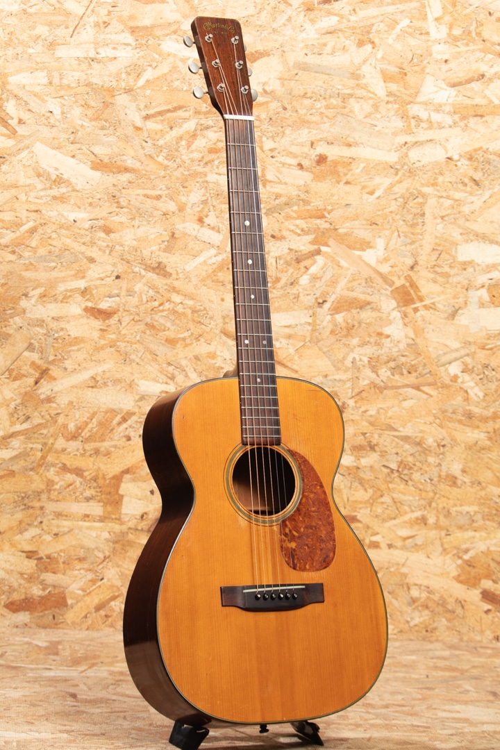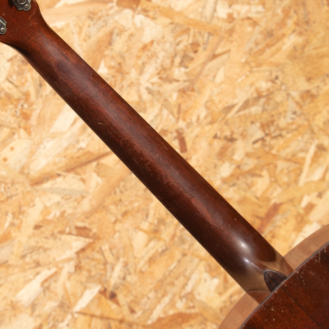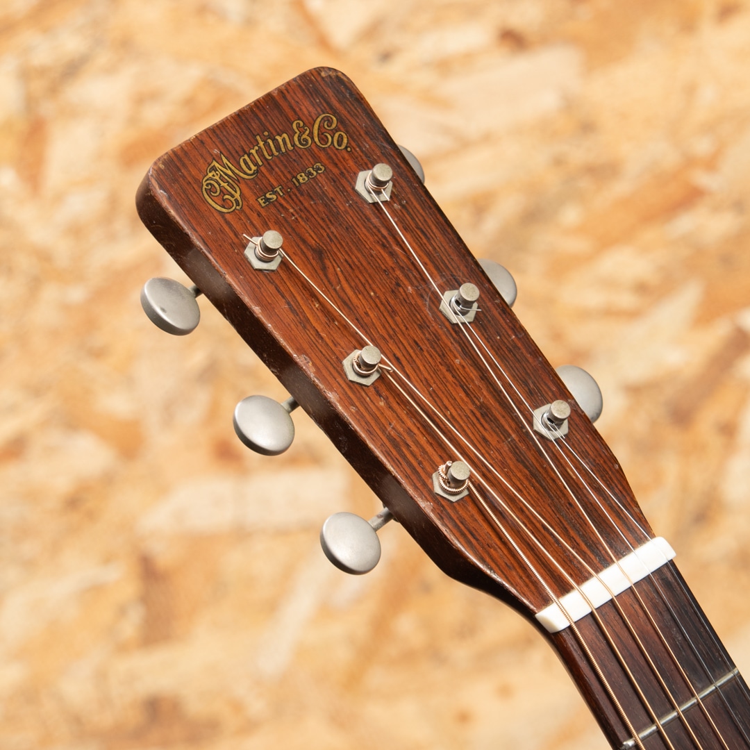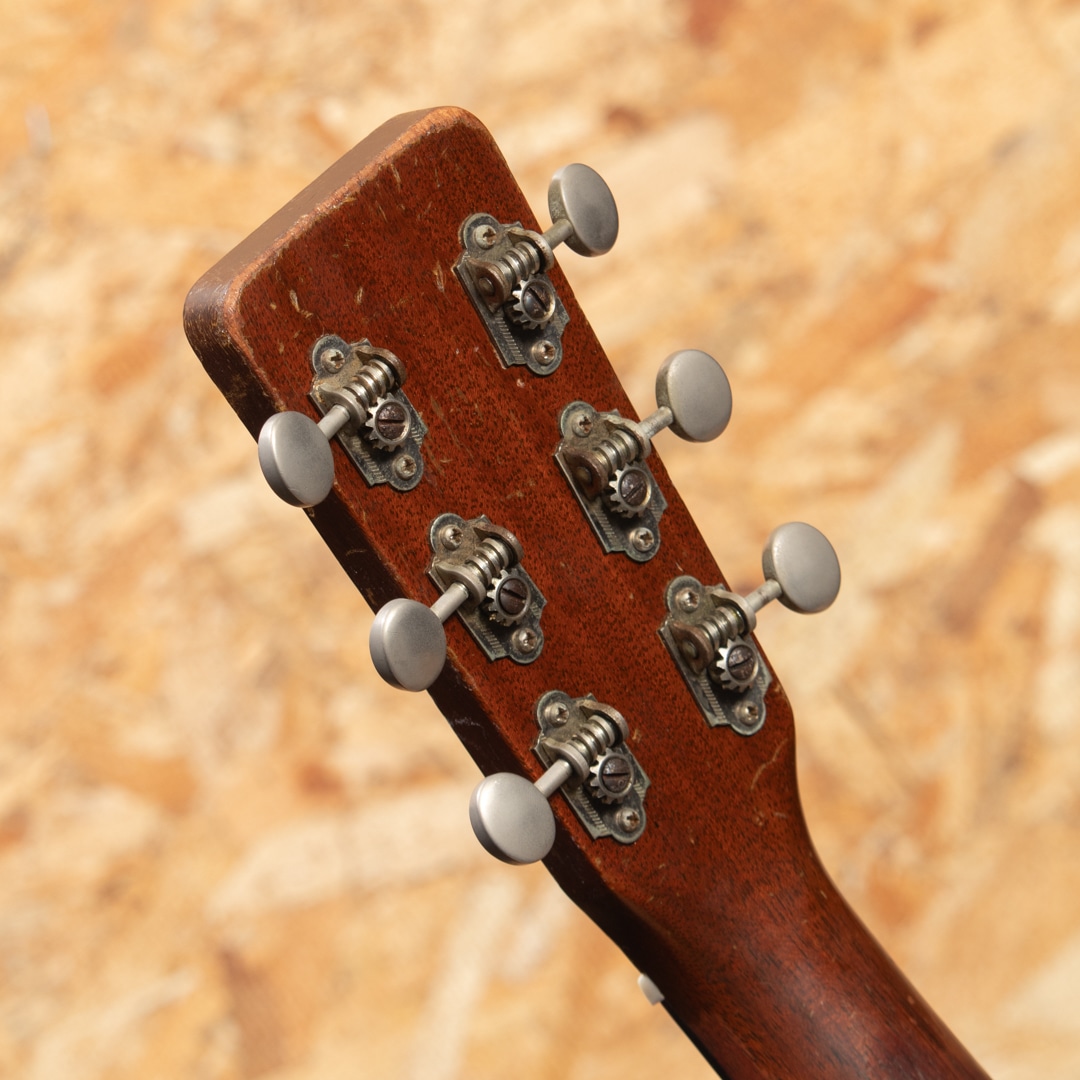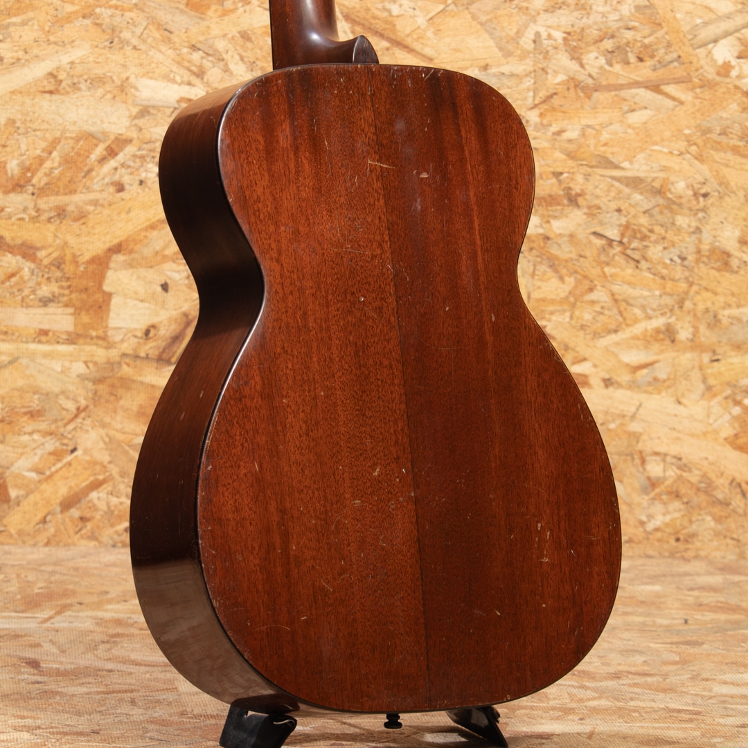 1940年代、50年代に作られた0-18は、マーティンの中でも希少なモデルではありませんが、多くのプレイヤーやマーティンファンから最も愛されているモデルの一つです。本器は1957年製 O-18。スプルーストップ、マホガニーサイド&バック、マホガニーネック、ハカランダ指板&ブリッジ、ロングサドル、オリジナルクルーソンペグ、ハカランダ化粧板、パール指板ドット、オリジナルベッコウセルピックガード、ベッコウセルバインディング、スチールTバーロッド、ノンスキャロップブレイシングです。オリジナルのWaverlyペグは3.4弦のシャフトが曲がっておりややトルクムラがありますが使用に問題のないレベルです。ピックガード外側のマーチンクラックは貫通していませんが表面部は補修済、ボディーサイドに10cm程のクラック修理跡がございます。当店入荷後にフレット交換を済ませ、ネック周りのコンディションは整っており今後もしっかりと弾いていただける状態です。指板サイドやピックガード周りなどに多数のピックウエアーやウエザーチェックが見られ、ネック裏の塗装はだいぶハゲている状態で、よく使い込まれたきた事がその外観からも伺えます。コンパクトなOサイズは軽量で扱いやすく、リビングでリラックスして爪弾くのに最高のお供となるでしょう。70年近く経過し、ヤレたルックスならではの弾き込まれたサウンドはクリスピーな質感がとてもよく、マホガニーモデル特有の小気味良い反応でストレスなく抜けてくれます。チップボードケース付属。