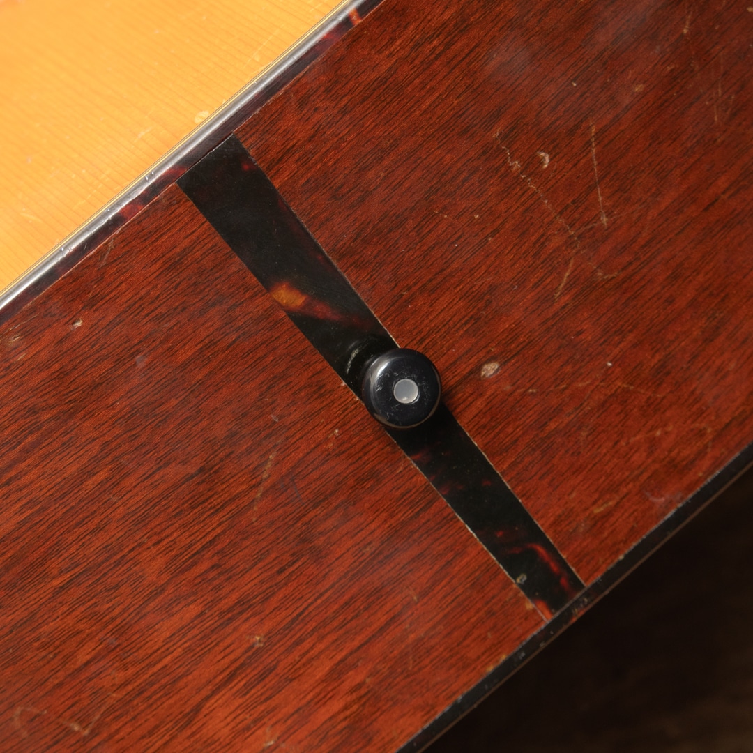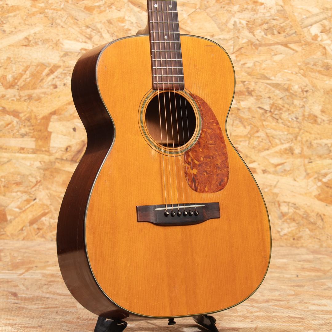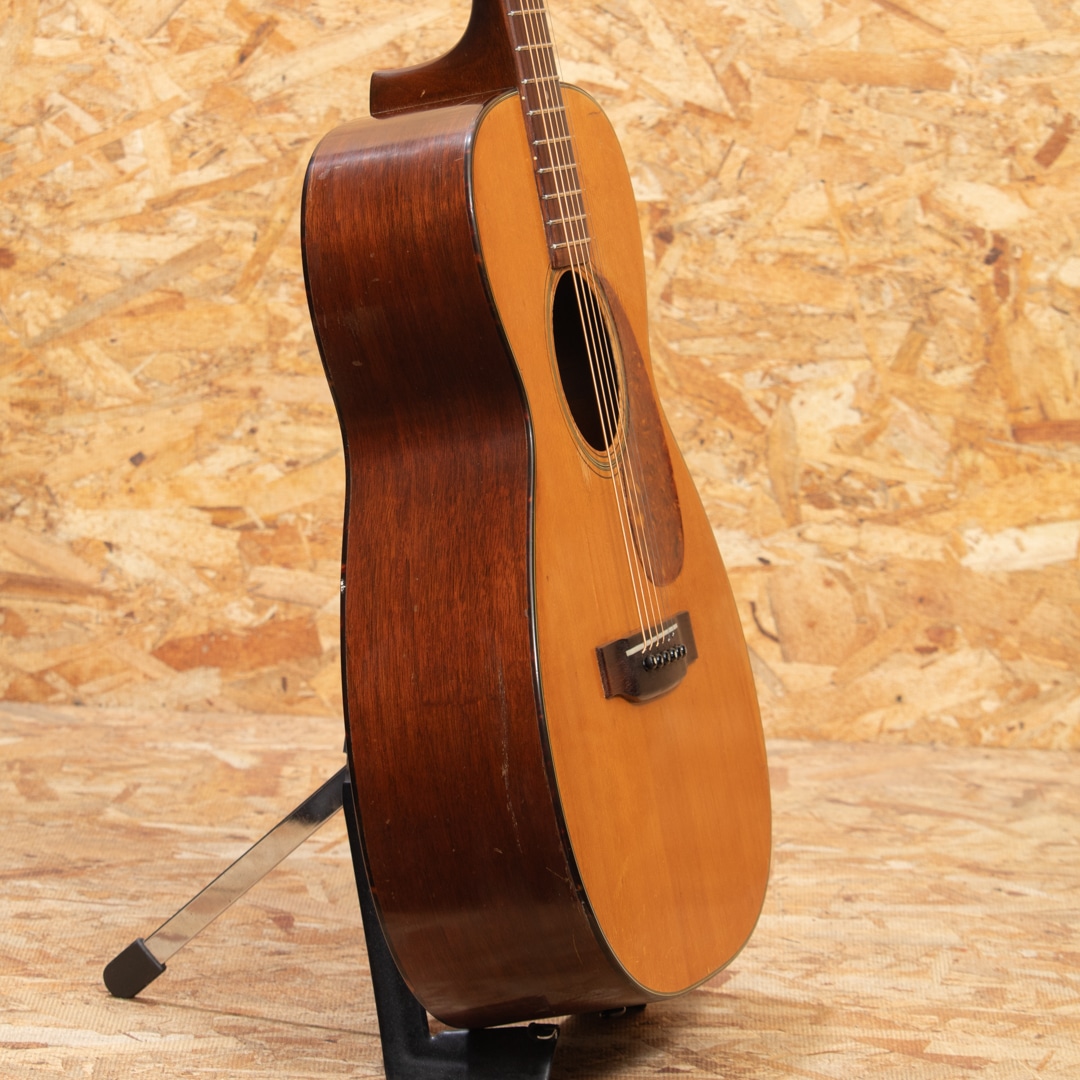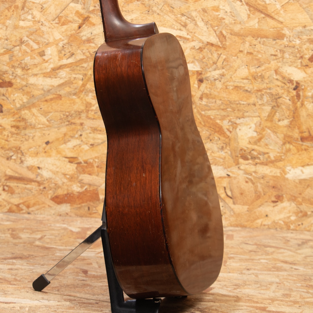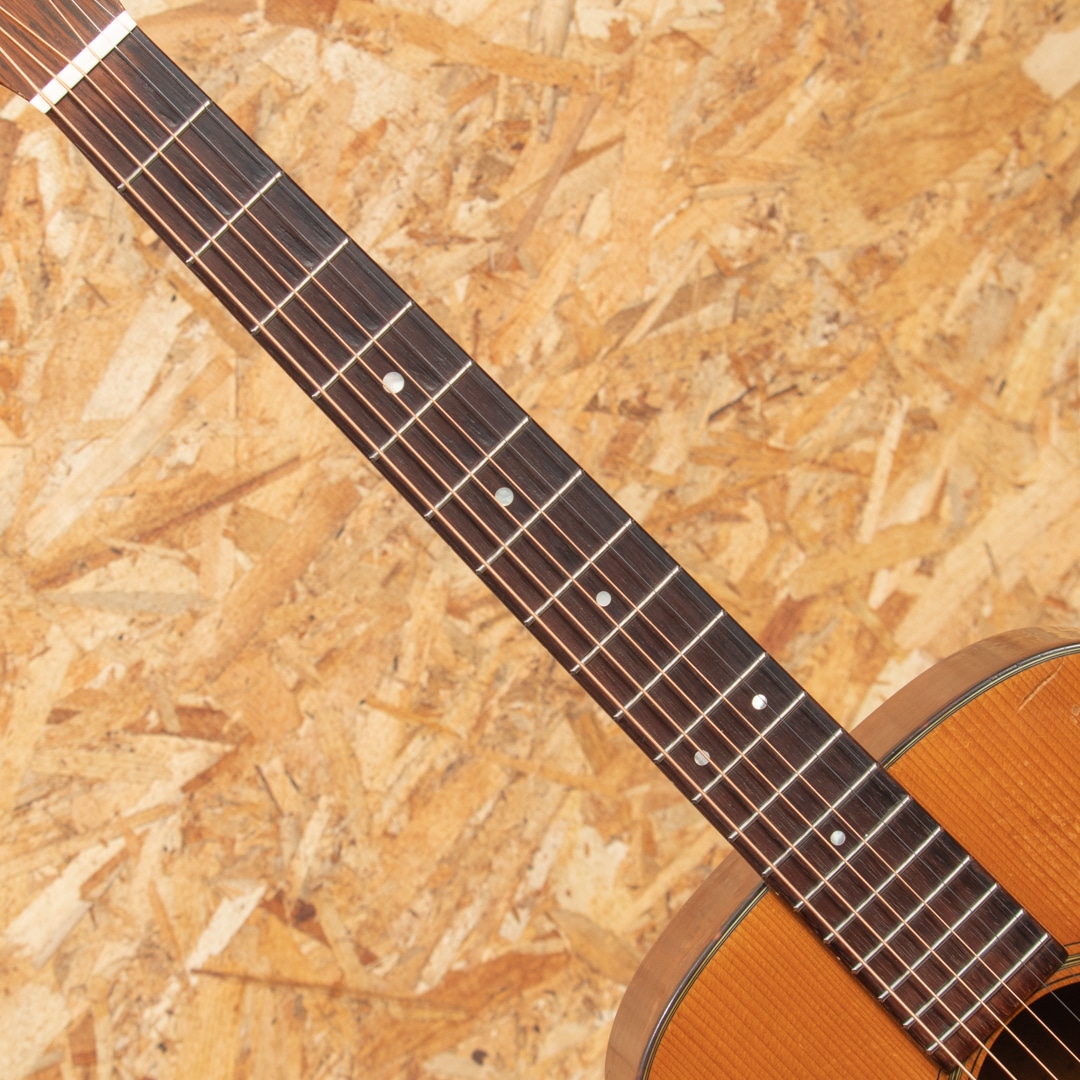 1940年代、50年代に作られた0-18は、マーティンの中でも希少なモデルではありませんが、多くのプレイヤーやマーティンファンから最も愛されているモデルの一つです。本器は1957年製 O-18。スプルーストップ、マホガニーサイド&バック、マホガニーネック、ハカランダ指板&ブリッジ、ロングサドル、オリジナルクルーソンペグ、ハカランダ化粧板、パール指板ドット、オリジナルベッコウセルピックガード、ベッコウセルバインディング、スチールTバーロッド、ノンスキャロップブレイシングです。オリジナルのWaverlyペグは3.4弦のシャフトが曲がっておりややトルクムラがありますが使用に問題のないレベルです。ピックガード外側のマーチンクラックは貫通していませんが表面部は補修済、ボディーサイドに10cm程のクラック修理跡がございます。当店入荷後にフレット交換を済ませ、ネック周りのコンディションは整っており今後もしっかりと弾いていただける状態です。指板サイドやピックガード周りなどに多数のピックウエアーやウエザーチェックが見られ、ネック裏の塗装はだいぶハゲている状態で、よく使い込まれたきた事がその外観からも伺えます。コンパクトなOサイズは軽量で扱いやすく、リビングでリラックスして爪弾くのに最高のお供となるでしょう。70年近く経過し、ヤレたルックスならではの弾き込まれたサウンドはクリスピーな質感がとてもよく、マホガニーモデル特有の小気味良い反応でストレスなく抜けてくれます。チップボードケース付属。