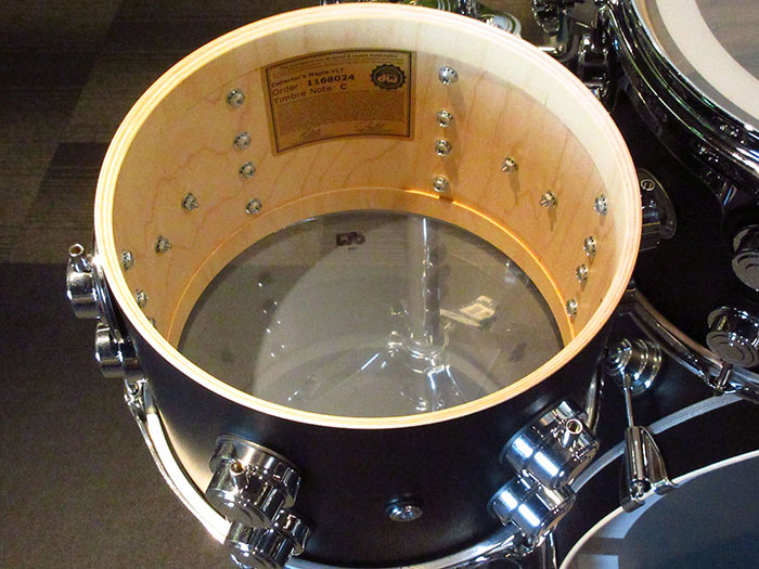 10、12インチタムに対して「VLT(バーチカルローティンバー)」と呼ばれるシェルの組み立て方を施しています。VLTはシェルプライを縦方向の木目を多く組んだカスタム仕様で、通常のシェルよりもピッチが低くなり、ローチューンサウンドでありながらサスティーンとアタックの効いたサウンドが得られます。
