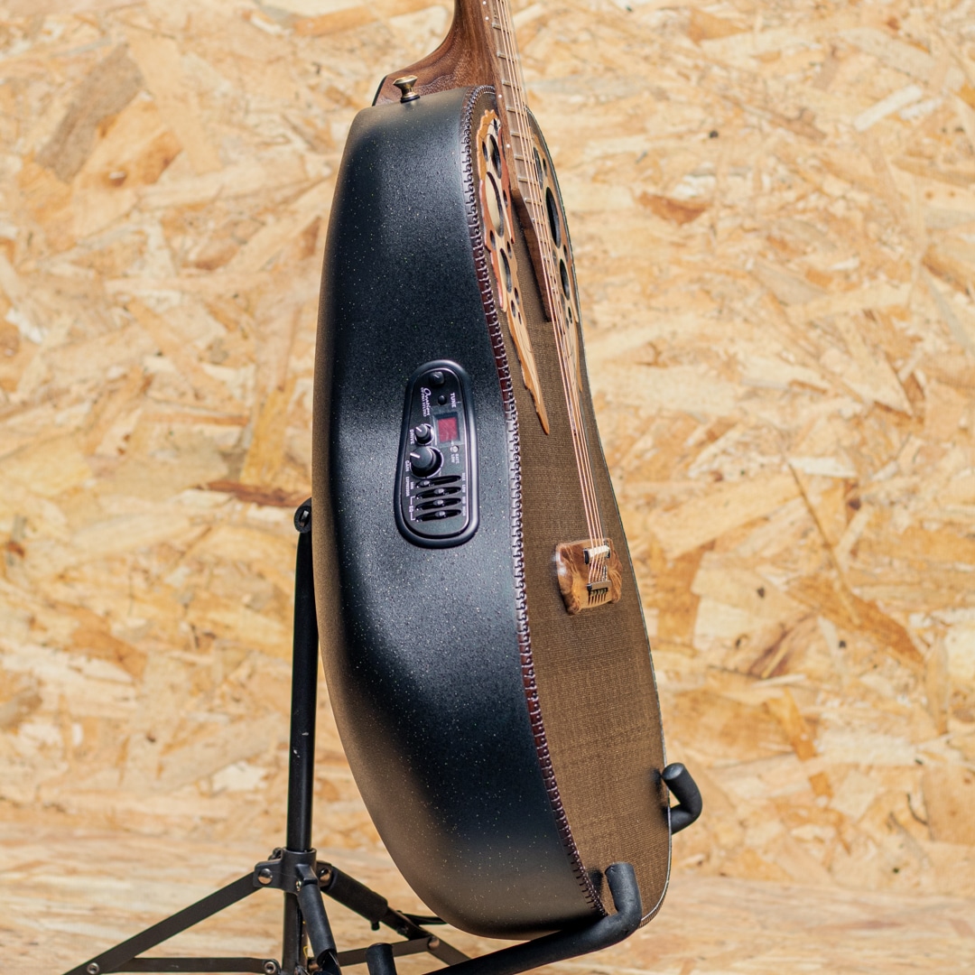 オべーション創始者チャーリー・カマンの生音へのさらなる探究心から1976年に誕生したアダマス。1976-77年にプロトタイプを多く生産し、1978年頃から製造。今も残るスタイルのモデルを確立し、今なおその人気は衰えを知りません。本器は人気の高いスタイルの”1687GT-5”。ウッドトップの約3分の1の薄さでも十分な強度を得られるアダマス独自のカーボンファイバートップ、リラコード樹脂ディープボウル、ウォルナットネック、ウォルナット指板&ブリッジ、シャーラーゴールドペグ、ウッド指板インレイ、マルチプルエポーレットサウンドホール、Op Pro Studioプリアンプ、オリジナルアダマスファンブレイシング。ノンカッタウェイのディープボウルボディに、華やかで存在感抜群の彫刻ヘッド。これぞアダマス!を継承するモデル。渋いブラックカラーの1本。ディープボウルアダマスならではの奥深いサウンド。それでいて歯切れが良く、コンプがかったレスポンスは弾きやすくアグレッシブにプレイできます。メロウなプレイからファンキーなカッティング、ダイナミックなストロークまで、あらゆるプレイスタイルを網羅するバーサタイルなスタイルは、多くのプレイヤーによってそのサウンドを残してきました。また、3バンドEQにエクスプレッサーを備えたハイエンドプリアンプ"Op Pro Studio”は、よりアグレッシブなサウンドメイクを可能にするプリアンプ。従来のアダマスサウンドはもちろん、ドライブツマミによる帯域調整でより前に出る野太いトーンを得られます。ストレートでももちろんですが、ステージでさらにそのポテンシャルを発揮する実践派の1本です。