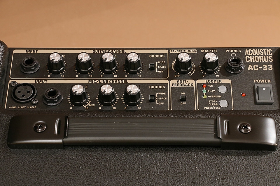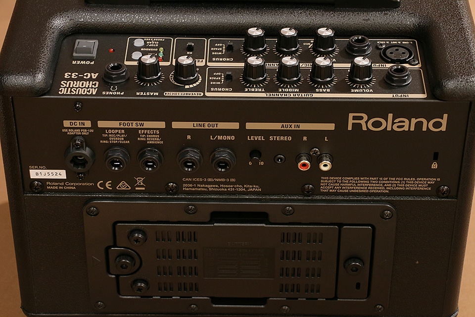 AC-33はアコースティックギター用に設計されたコンパクトなアンプ。5インチのカスタムスピーカー2本を搭載した30W (15W+15W)のステレオ仕様で、クラスを超えた豊かなサウンドを実現しています。ボディは軽量&コンパクトな設計で可搬性に優れ、自宅内での移動はもちろん、屋外にもアクティブに持ち出せます。電源にはACアダプタと単3形電池による2電源方式を採用。アコースティックギター専用アンプとして、バッテリー駆動による使い勝手の良さを実現しています。着脱可能な電池ケースを装備し、8本のアルカリ乾電池で最大約8時間、またはニッケル水素充電池を装着することで最大約9時間の駆動が可能。電源確保が難しいストリートや、アウトドアの場面でも使用することができます。