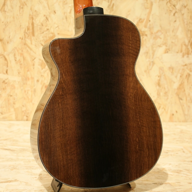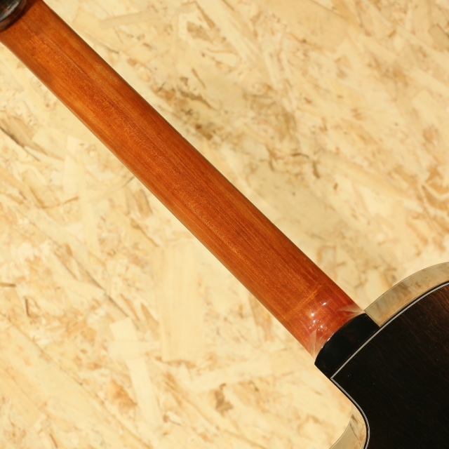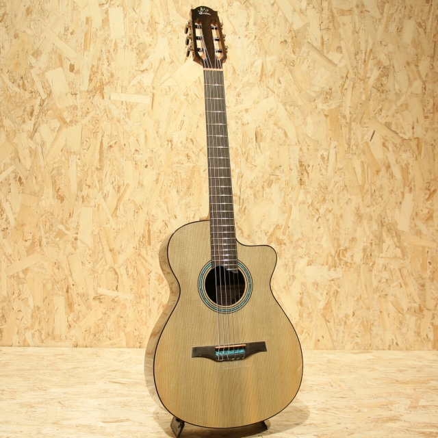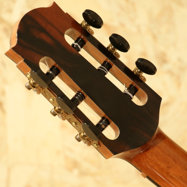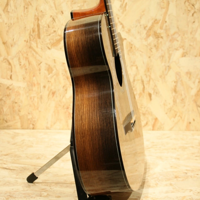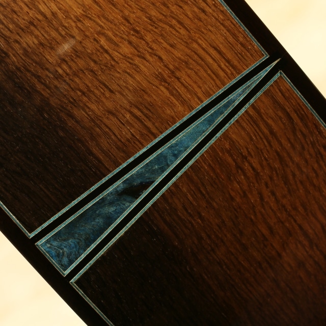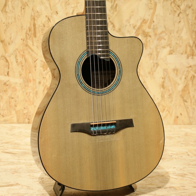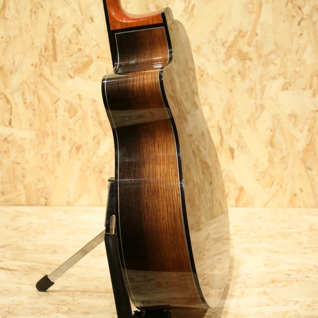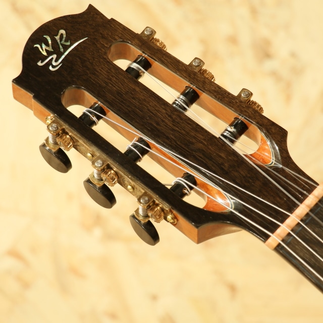 群馬にて増田明夫氏が製作する"Water Road Guitars"は、"音、弾きやすさ、デザインへのこだわり"を概念にオンリーワンのカスタムを製作しています。フィンガーピッキングに特化したギターを追求、極上マテリアルを最大限に活かした溢れる倍音と美事な象嵌、稀代の天才が造り出す日本が誇るルシアーギターです。本器は2021年10月に東京にて増田氏を含む7人の国内ギタールシアーと招聘アーティスト、有志によって開催された「Boutique Guitar Lounge」のため製作され話題を集めた作品の実機です。モデル"プルクラ"ナイロン弦仕様をベースにトップに配されたアラスカブルースプルース。この材は長年の偶然が生んだ産物。アラスカ南東部のロガーやフィッシュトリッパーはおよそ20世紀にかけて伐採キャンプとしてフロートハウスの水上にて生活していました。このフロートハウスとして使われていたアラスカのスプルースは半世紀以上塩水に浸かり浮力を増し、大きな鉄の杭を打たれることにより鉄分の酸化などの化学変化により独特の青みと灰色みえお帯びた神秘的な材へ変化しました。非常に限られた資源で需要が高くあらゆる偶然が生んだ奇跡の材と言えます。青グレー掛かった色味は天然の物です。サイドバックには紀元前およそ3000年前のボグオークを使用。ボグとは沼という意味でおよそ5000年もの間イギリスの沼地に沈んでいた奇跡のオーク材。本来ならそれぞれに一般材と組み合わせても驚くべきものですが、大変貴重な材同士を贅沢に1本に組み合わせてしまう発想が驚きです。ボグオーク指板&ブリッジ、ホンジュラスマホガニーネック、妖艶にオーラーをまとう色味に合うブルーラインのボディー&指板ウッドトリム、ターコイズをあしらったのロゼッタとブリッジ。ハカランダとはまた違った味わいを持った音色でブレのないコシのある音芯ながら抱擁感が強く、横方向に綺麗にほぐれていきます。コンプ感の効いた重心を持った落ち着きのある音色で心地よく、鉄弦をつま弾くようなタッチ感で弾くとよりうまみのある音色を感じて頂けます。大きなホールで音色を遠くに飛ばすクラシックをベーシックとしたナイロン弦仕様とは一線を画し、心地よく長時間での演奏にもストレスを感じません。ピックアップをマウントした際にも素晴らしいコントロールで出力できる想像が出来ます。これまでのWaterRoadを所有するユーザー様にも新しい風を感じる魅力的な作品です。限られた資源での特殊なモデル。オリジナルのブルーカラーシェルハードケース付属です。
