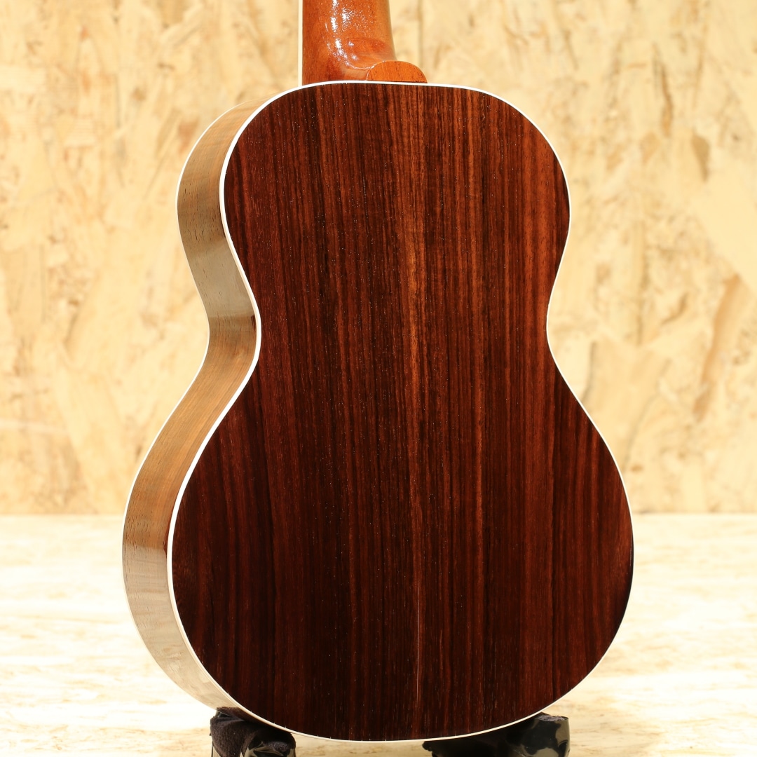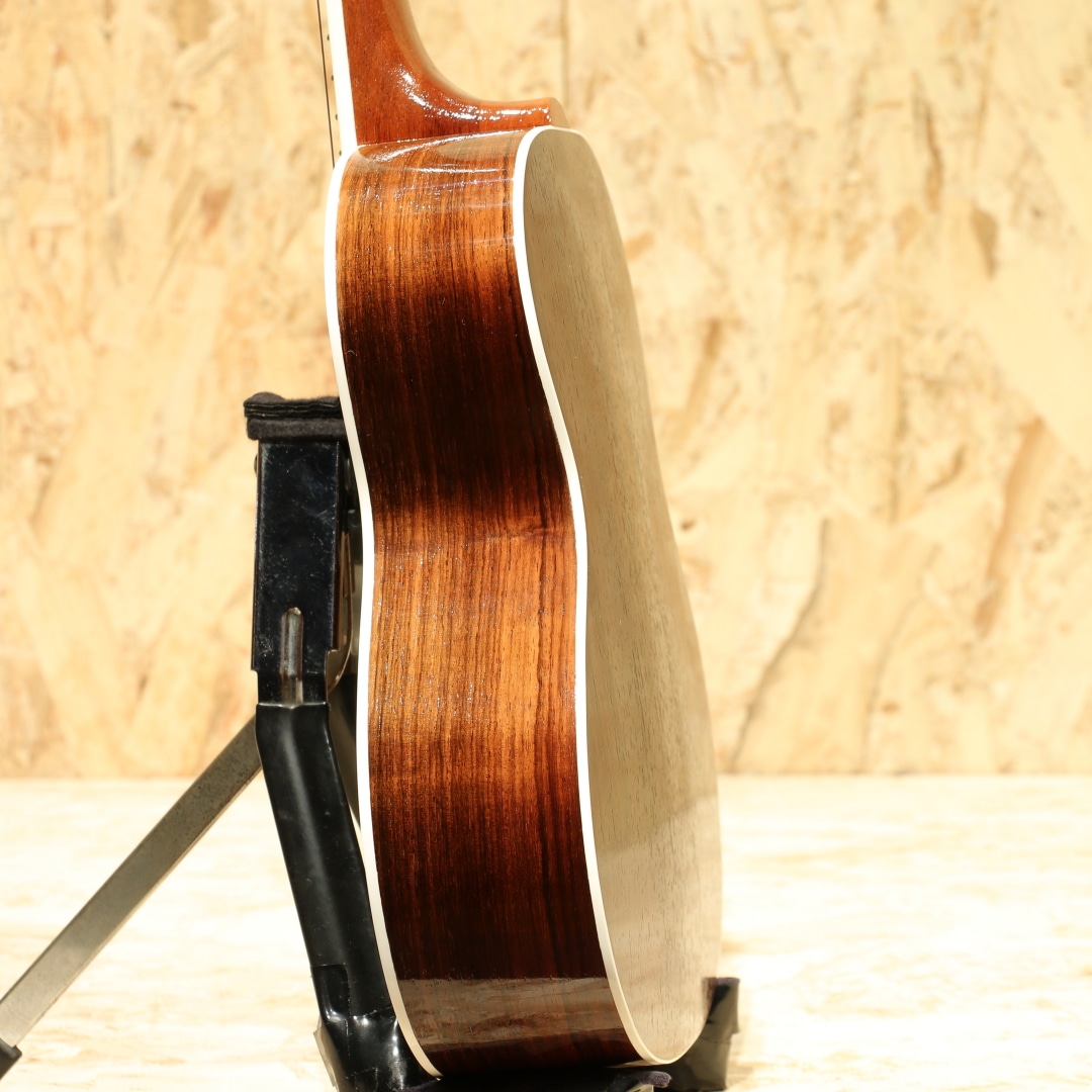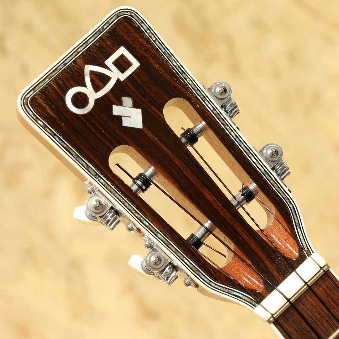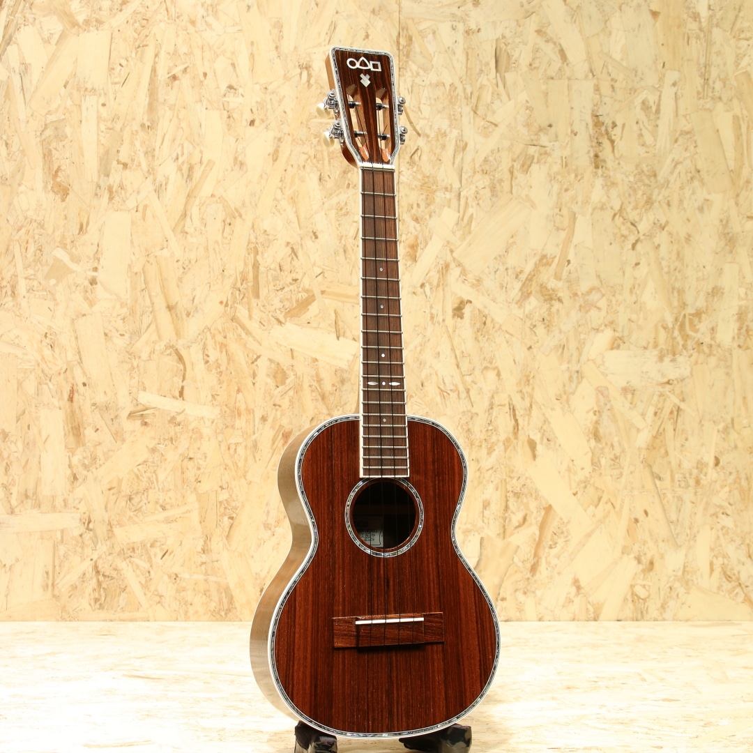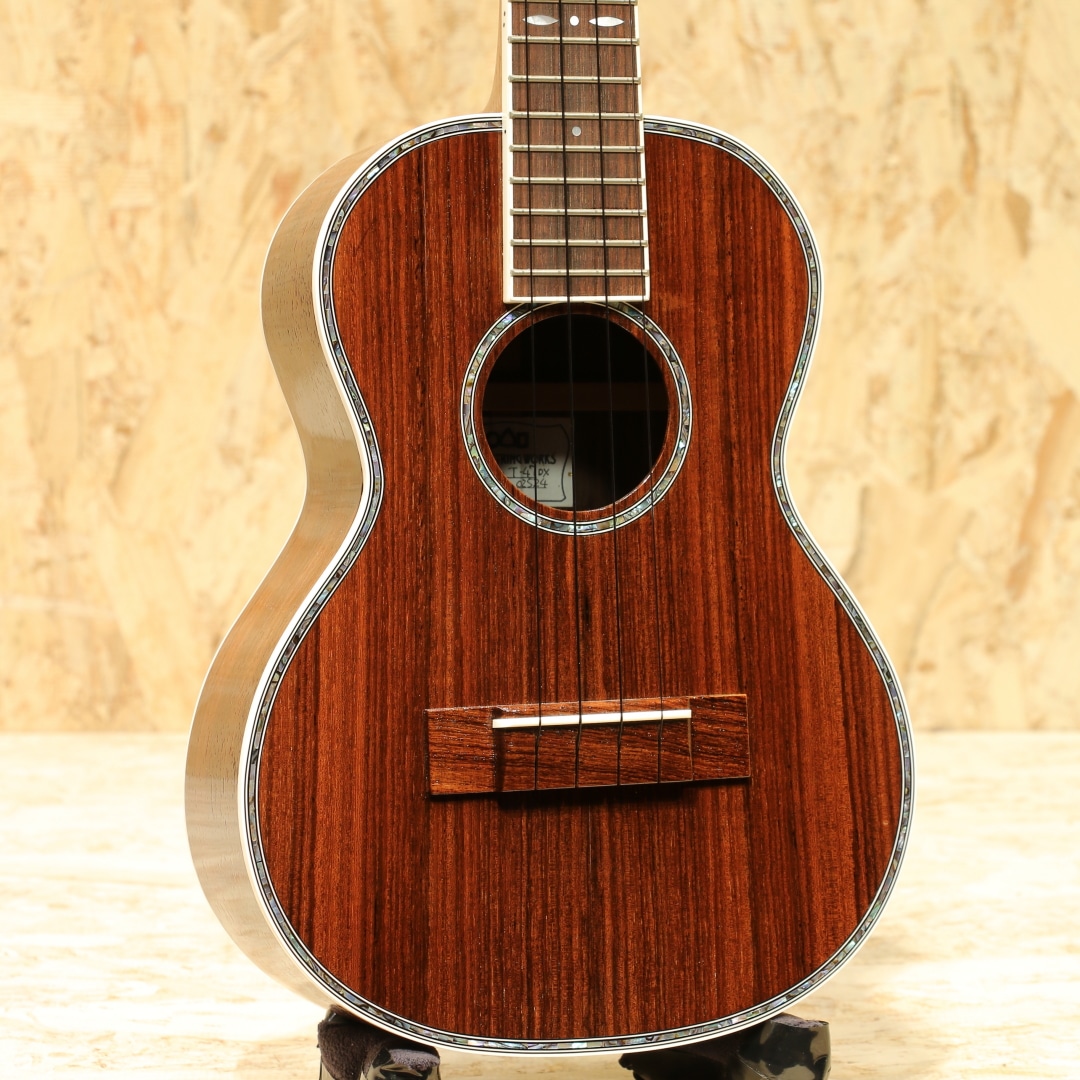 京都下京区の工房にて占部英明氏、息子の直宏氏によって製造される完全ハンドメイドウクレレ。父英明氏はクラシックギター製作家「庄司正雄」氏に師事し、その後Chakiの黄金期での製作を勤め、80年代には寺院建築・仏具など重要文化財の修繕や楽団の生楽器の修理などを手掛けていました。1997年よりウクレレ製作家として旗揚し、現在は年間におよそ120本ものウクレレを製作する、ヨーロッパをはじめ世界から注目される巨匠ウクレレブランドとなっています。本器はローズウッドをボディに使用したテナーサイズスロッテッドヘッド仕様"T-47 DX All Rose Tenor"。ローズウッドボディ、マホガニーネック、ローズウッド指板&ブリッジ、ホワイト指板バインディング、ゴトークロームペグ、アバロントリム&ロゼッタ。スロテッドヘッドらしいハリのあるクリアなサウンドで、豊かな倍音感を持った心地よい響き。ローズウッドボディのパリッとしたクリアさや重厚さ、煌びやかさも合わさり上品でキレイなサウンドを堪能することが出来ます。テナーサイズならではのボリューム感を持ちながら、バランス良く整っている出音。ジャンルを問わずにオールラウンドにお使い頂けます。シックで上品なルックス。美しい外観に美しいサウンドを併せ持つ、贅沢な1本です。
