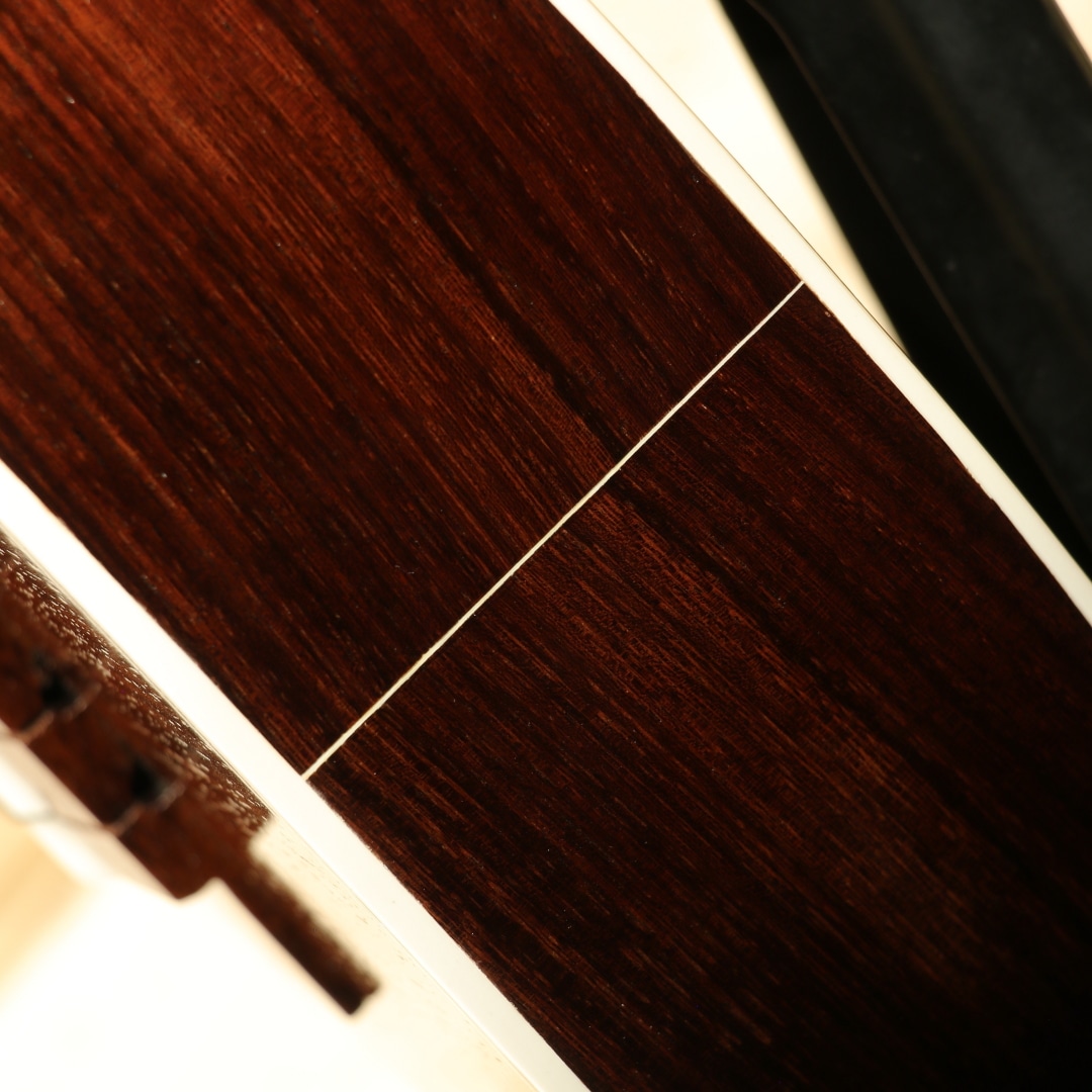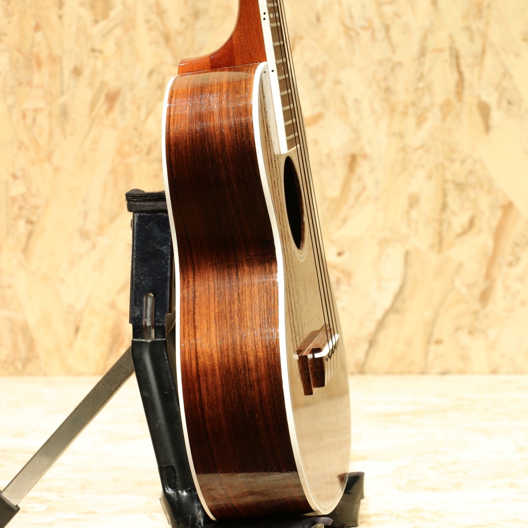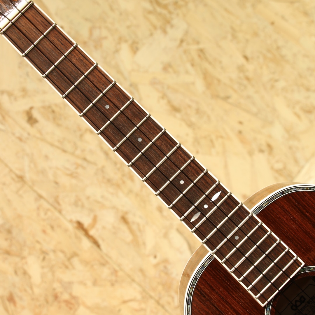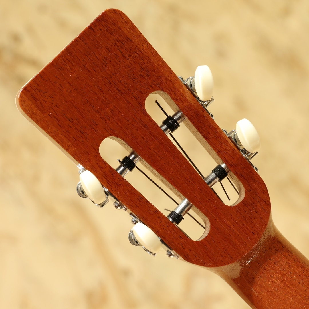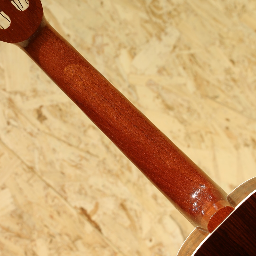 京都下京区の工房にて占部英明氏、息子の直宏氏によって製造される完全ハンドメイドウクレレ。父英明氏はクラシックギター製作家「庄司正雄」氏に師事し、その後Chakiの黄金期での製作を勤め、80年代には寺院建築・仏具など重要文化財の修繕や楽団の生楽器の修理などを手掛けていました。1997年よりウクレレ製作家として旗揚し、現在は年間におよそ120本ものウクレレを製作する、ヨーロッパをはじめ世界から注目される巨匠ウクレレブランドとなっています。本器はローズウッドをボディに使用したテナーサイズスロッテッドヘッド仕様"T-47 DX All Rose Tenor"。ローズウッドボディ、マホガニーネック、ローズウッド指板&ブリッジ、ホワイト指板バインディング、ゴトークロームペグ、アバロントリム&ロゼッタ。スロテッドヘッドらしいハリのあるクリアなサウンドで、豊かな倍音感を持った心地よい響き。ローズウッドボディのパリッとしたクリアさや重厚さ、煌びやかさも合わさり上品でキレイなサウンドを堪能することが出来ます。テナーサイズならではのボリューム感を持ちながら、バランス良く整っている出音。ジャンルを問わずにオールラウンドにお使い頂けます。シックで上品なルックス。美しい外観に美しいサウンドを併せ持つ、贅沢な1本です。