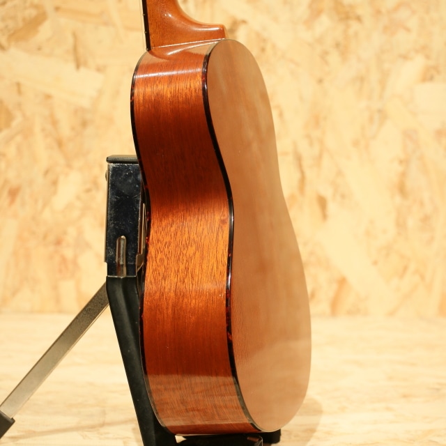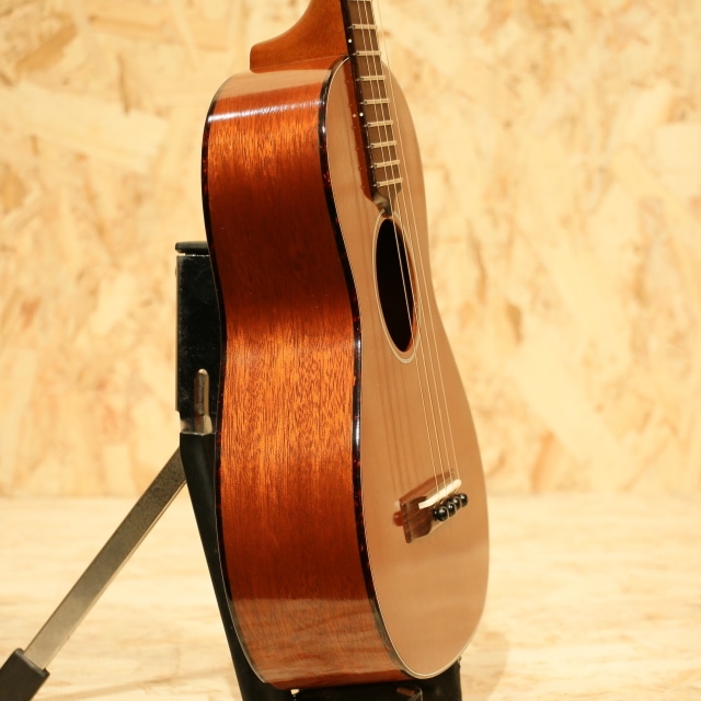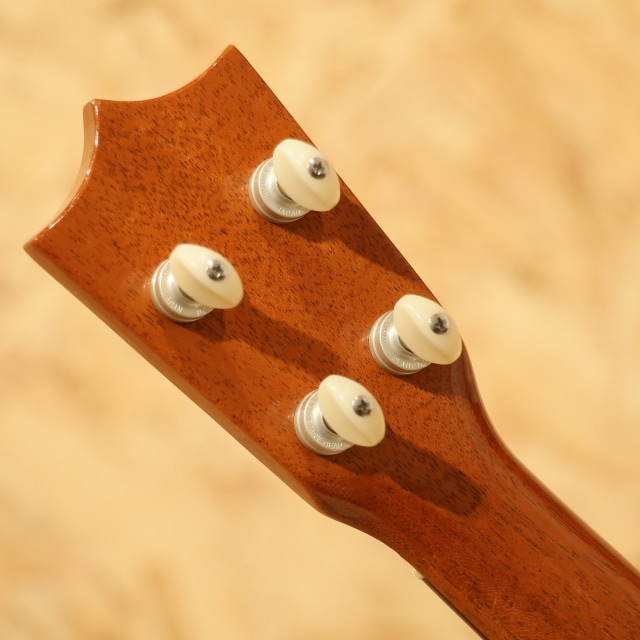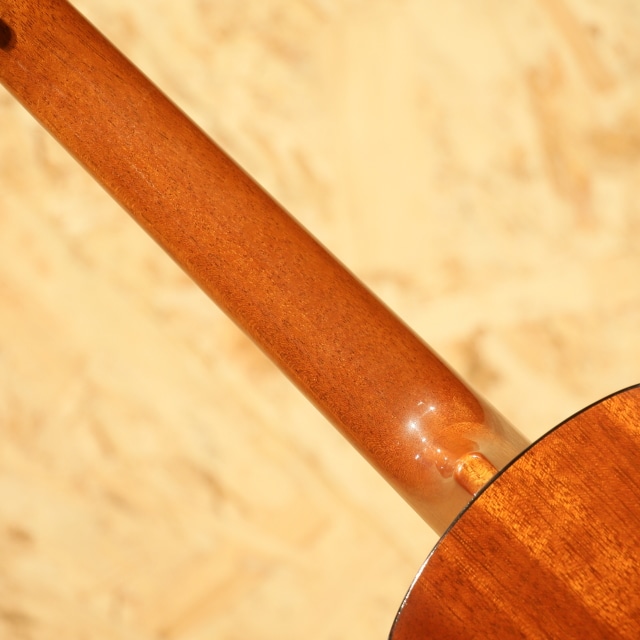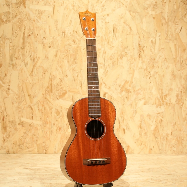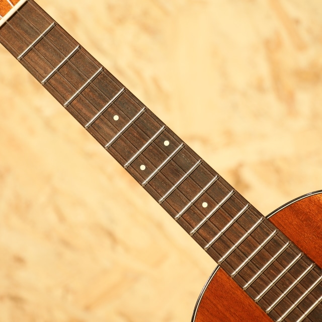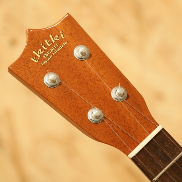 国産にて拘りを詰め込んで製造するブランド”tkitki ukulele”。「シンプルなルックスながらサウンドは抜群」を合言葉に、セレクトされた材を使用し製造後に調整するなど拘り貫いて製造しています。本器はマホガニーボディ仕様のテナーモデル”HM-T”。2010年代製USED品です。ホンジュラスマホガニーボディ、マホガニーネック、ハカランダ指板&ブリッジ、牛骨ロングサドル、ブリッジピン仕様、ゴトーUPTペグ搭載。マーティンのヴィンテージウクレレを彷彿とさせるルックスの本器。12フレットジョイントながら18フレット仕様にすることで出せる音域が広がり、様々なジャンルの音楽や演奏法にも対応の出来る仕様。ソロ等の幅広い音域を使うスタイルでも活躍の見込める仕様です。材構成はホンジュラスマホガニー、ハカランダなど、ヴィンテージスペックにこだわった仕様。ルックス通りレトロな、ヴィンテージライクなサウンドが特徴的です。マホガニーの優しい柔らかさを感じる音色、明るい出音。テナースケールのハリのある音色も合わさり、ポロンっとドライな音が飛び出してきます。ボディトップ面下部に極薄く爪が当たったような跡、サイドにショルダー部に当てキズ、サイドの1弦側に若干擦ったような跡が見られるものの、その他は非常にキレイな状態を保たれている本器。ネック周り等のプレイコンディションも抜群な1本です。ここまでこだわったウクレレは他のブランドではなかなか見られません。ウクレレ愛好家にも堪らないウクレレでしょう。上質なマホガニーサウンドを是非お手元でお楽しみ下さい。