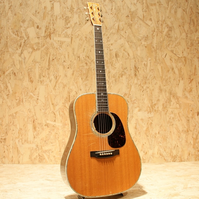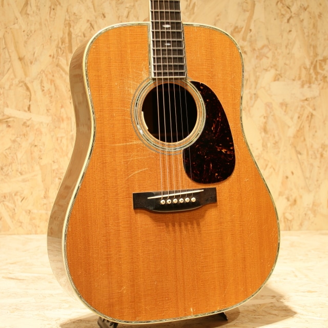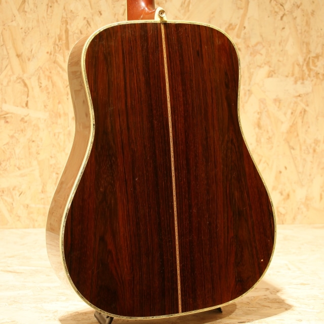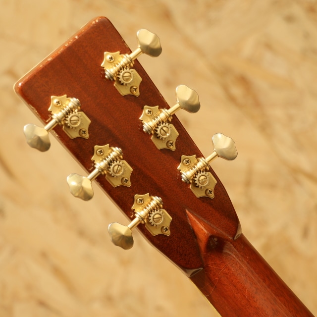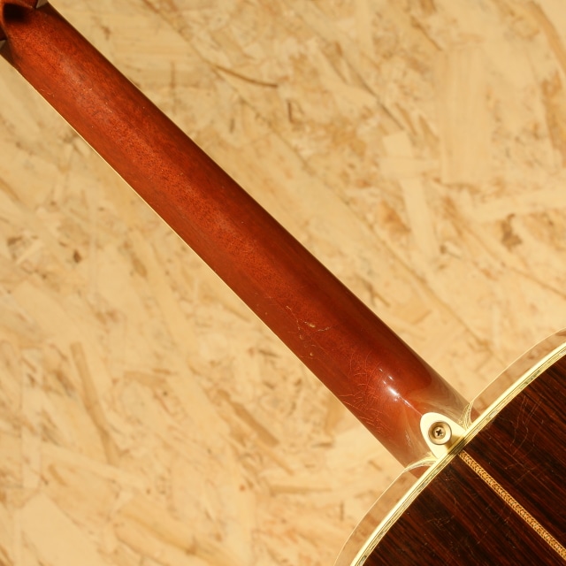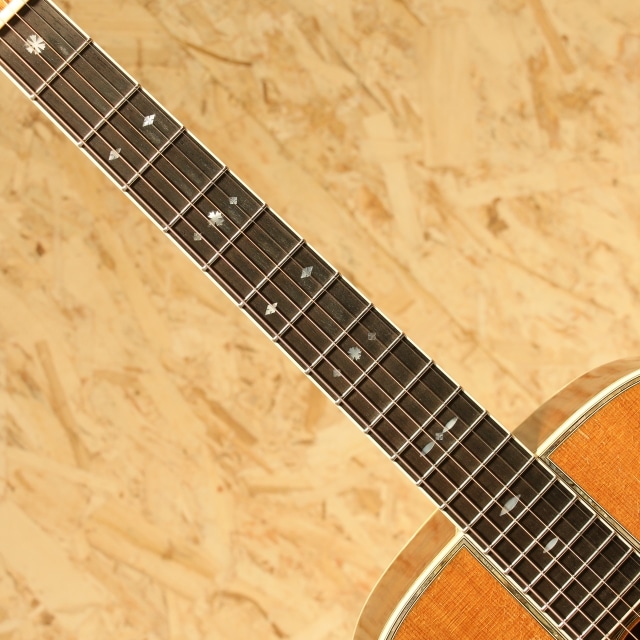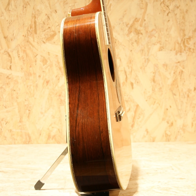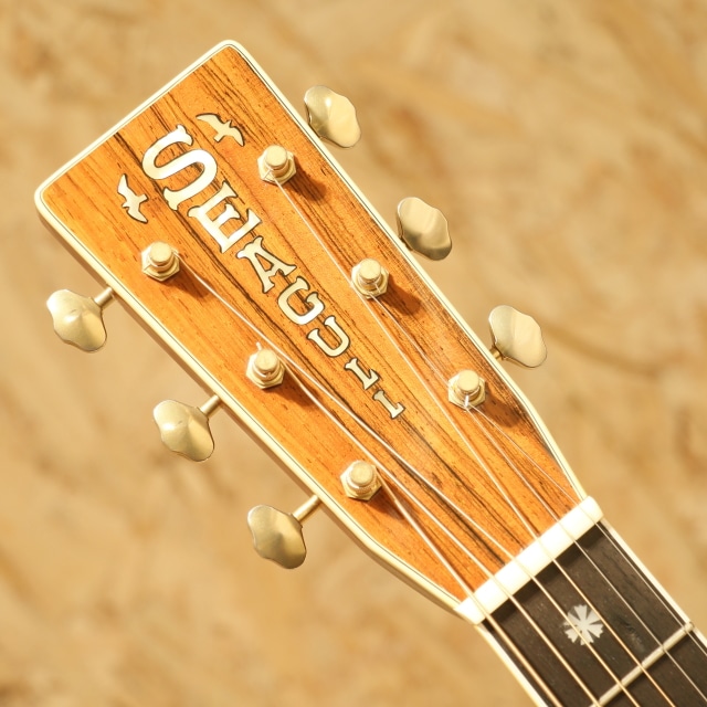 国内有数のベテランルシアー、エム・シオザキ弦楽器工房の塩﨑雅亮氏によるシーガルギター。塩崎氏が工房を立ち上げたのは1982年。86年に製作された珍しい希少な初期モノの1本です。塩﨑氏は現在世界屈指のマーティン研究家としても知られています。プリウォー期や68年より復活を遂げた45など実物から採取したデーターを裏付けに再現される氏のギターはそのフォルム、音色と共に芸術の域です。本器はドレッドノート戦前期38年より以前の45モデルよりインスパイアされ独自のテイストで作り上げられています。スプルーストップ&ハカランダサイド&バック、ワンピースマホガニーネック、44.5mmナットワイド、エボニー指板&ブリッジ、ゴトー製オープンゴールドカラーチューナー、スノウフレイクスキャッツアイ指板インレイ、トップ、サイド&バックアバロンパーフリング、アバロンロゼッタ、飴色に焼けたホワイトセルバインディング、モザイクバックストリップ、塗り込みべっ甲柄ピックガード、フォワードシフテッド・スキャロップドXブレイシング、パールとアバロンを組み合わせ手作業で丁寧に貝を埋め込まれたブランドロゴヘッドプレートインレイ、ラッカーフィニッシュ。芳醇で伸びやかな倍音、繊細なタッチのアルペジオやストロークまでクリアに耳に届き埋もれません。60-70sのドレッド45スタイルの良さがすでに確立されている事が驚きです。しっかりと弾きこまれた印象の一本でサウンドホール周りを中心に大きく振りかぶったピックスクラッチや全体的なラッカーチェック、ヒールサイドにストラップピン穴の埋め痕がありますが、全体の風合いに馴染みそれほど目立ちませんフレットは交換され、ナットサドルなどの消耗パーツは交換されております。L.R.Baggs Anthem SLピックアップを後付けマウント。全体的に小傷は多い印象ですが、フレットはしっかり交換され、ナットサドルなど消耗パーツ含め整えられております。ハイレベルなピックアップマウントでライブ現場でもしっかりお使い頂けます。塩﨑氏ファン必見、希少な一本です。汎用ハードケース付属。