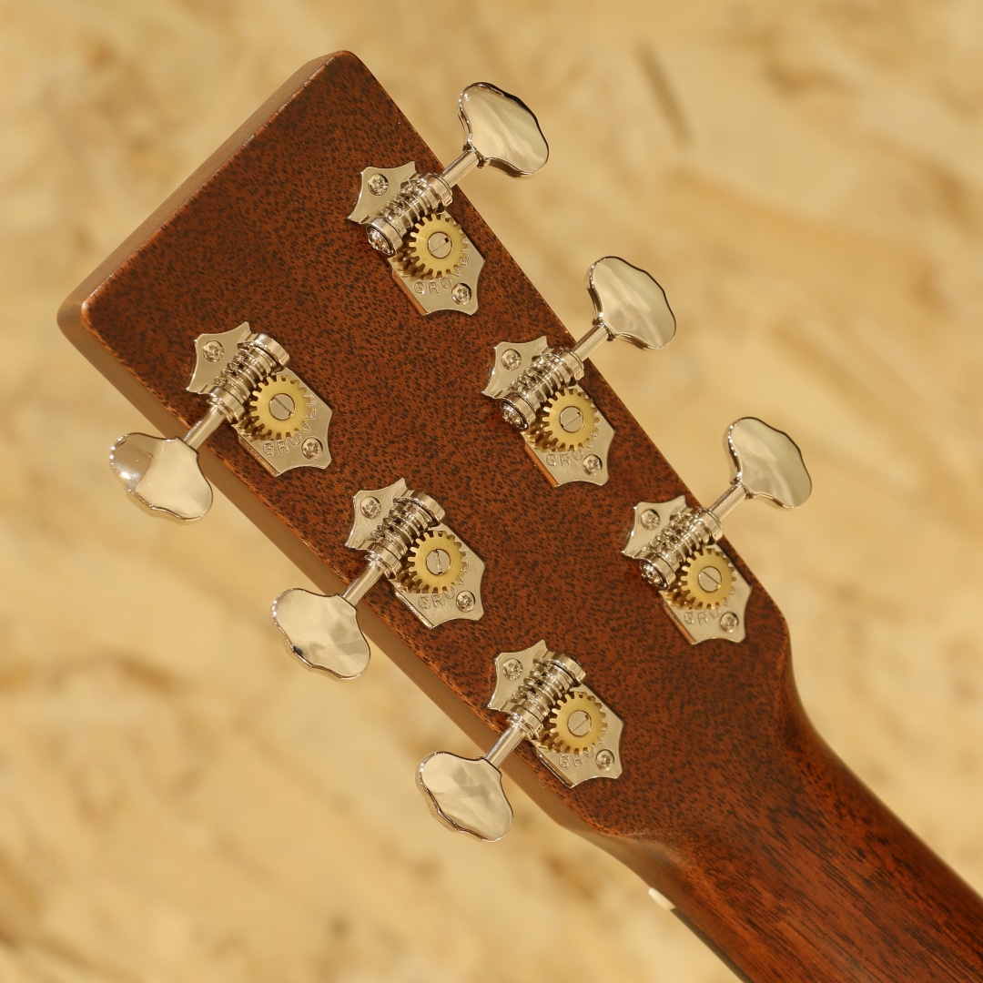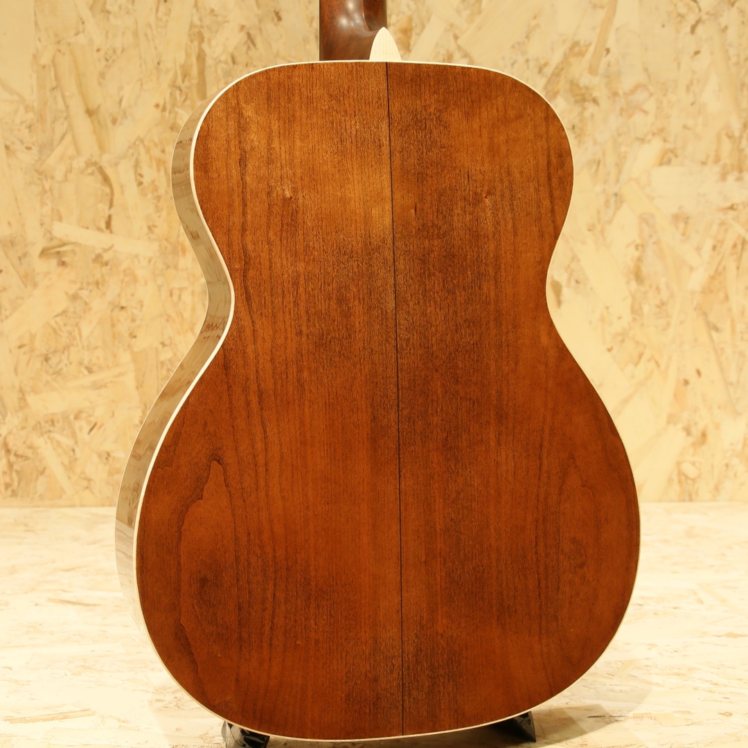 現マーチン工場の中でも、卓越した技術と豊富な経験から至極のギターを造り出す"Martin Custom Shop"。レギュラーラインの製造箇所とは全く違った、工場の一角で昔ながらの工法や製造方法で製作を行うカスタムショップ。スペックも含めレギュラーラインとは一線を画す仕上がりを誇ります。ここ数年一際話題を集めるオーセンティックシリーズの製作をはじめ、高い完成度を誇るこだわりのカスタムモデルを製造するトップクラスの部門です。本器はマーチンファクトリーツアーの際弊社スタッフにてオーダーが行われたスペシャルな1本。”CTM Cherry Hill 000”。スプルーストップ、チェリーサイド&バック、セレクトハードウッドネック、44.5mmナット幅、モディファイドロウオーバルネックシェイプ、ハイパフォーマンステーパー、エボニー指板&ブリッジ、ドロップインサドル、アバロンダイアモンドスクエア指板ポジション、グローバーオープンバックバタービンノブペグ、ベッコウ柄ピックガード、サイドバック材と同じくチェリー材をヘッド突板に使用、2wayアジャスタブルロッド、シトカスプルースを使用したスキャロップドXブレイシング。マーチンファクトリーツアーに参加したディーラーのみオーダーが出来た本器。材の名称からの名づけかと思いきや、マーチンI世が1839年にニューヨーク・マンハッタンからペンシルバニア ・”チェリーヒル”に移転した事を記念した限定モデルです。000-18をベースに製作を行われており、サイドバック材以外では装飾面に変更が加えられています。バインディングやパーフリングにロゼッタ等全体的に木材を基調とした装飾に纏め上げられており、非常にオーガニックな印象を受けるルックス。指板のインレイには選定されたアバロンが使用され、ワンポイントのさりげないお洒落のごとく飾りすぎない自然な絢爛さを持ちます。ネックシェイプはモディファイドローオーバルネック、ハイパフォーマンステーパーで現代的な演奏性を与えられ演奏スタイルを問わないオールマイティさを持った仕様。握り込んだ演奏スタイルから指板上を行き来するスタイルまで万遍なくフィットします。やはり特筆すべきはモデル名の一部にもなっているチェリー材。マホガニーとメイプルの中間的とも表現されることが多く、ブライトなトーンやエア感を伴った開放的なサウンドはマホガニー的、中低音の厚みがあるやや甘いサウンドやレンジ感の広さはメイプル的と言えるでしょう。元々カスタムショップ製は中域の情報量が多く上品でリッチなサウンドを響かせてくれますが、そこからタッチ感によるトーンも素直に出力するような印象です。ストロークでは快活で厚みのあるサウンド、フィンガーでは繊細なトーンからメロウなトーンまで強弱によって見せる表情を変える演技派。スキャロップによって柔らかいタッチにも追従しやすい反応性を与えられており、空気感を伴った上品な音色はカスタムショップ製であることを実感できます。ストロークやフィンガー問わず対応できる万能性を持ち、得手不得手を感じさせない辺りは流石の一言。扱いやすさと上質なサウンドを両立したマーチンの歴史にちなんだ記念モデルです。現代マーチン最高峰の部門で製作されていることも含め、自身を持ってオススメできる1本。日本の入荷は数本ほどと貴重なモデル、是非お手元でご堪能ください。