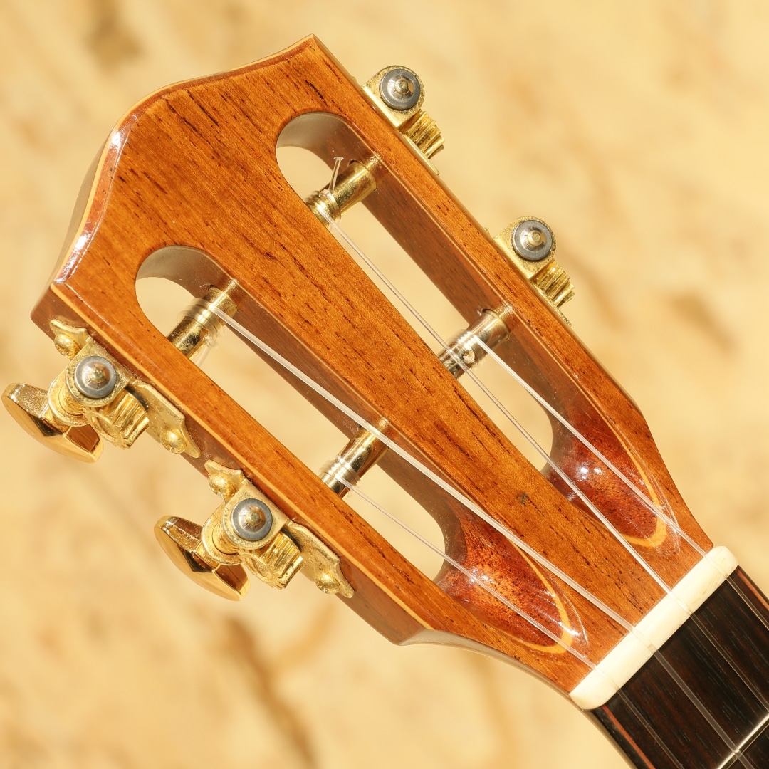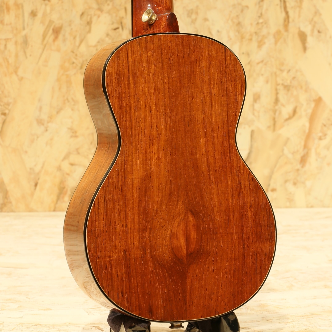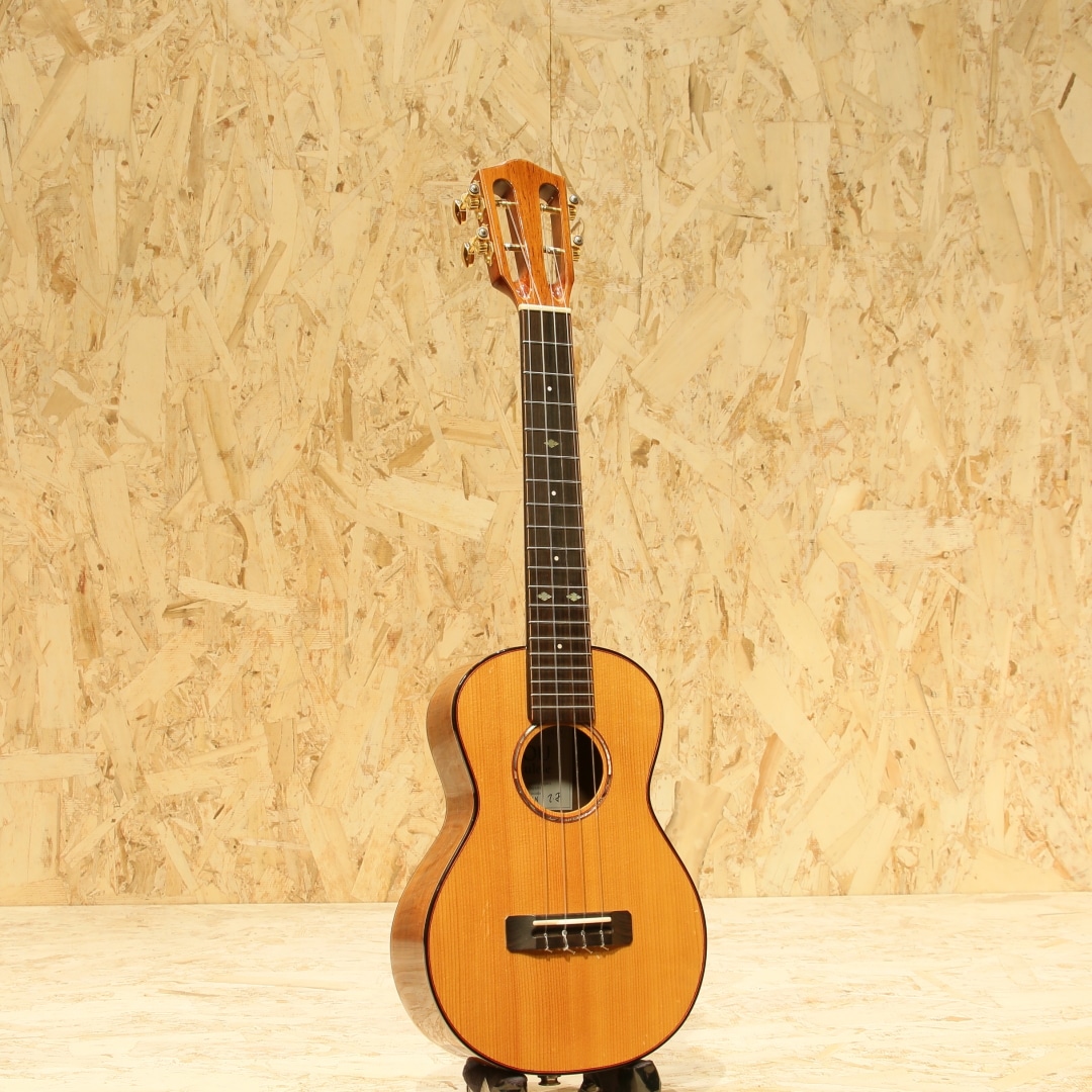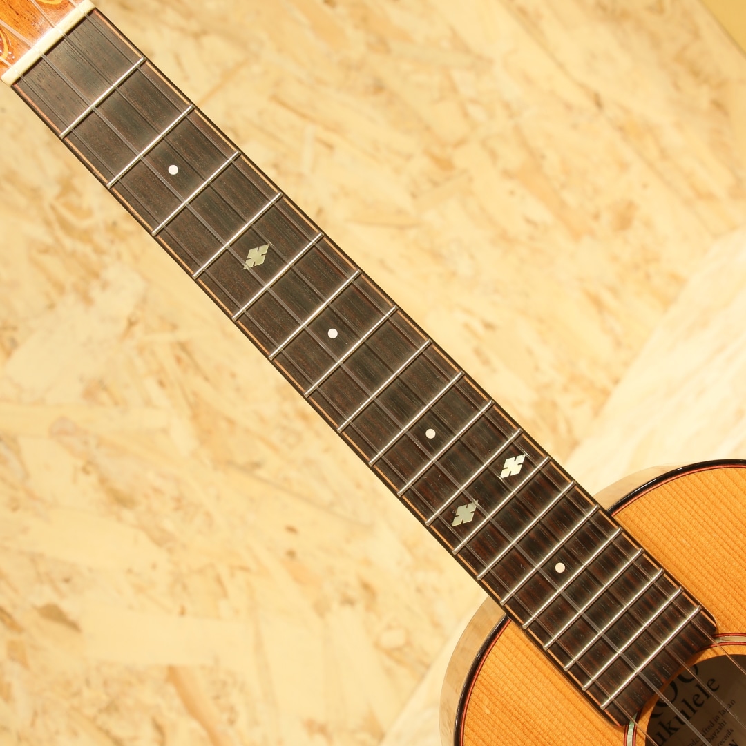 1998年茶位幸信氏に師事し、工房にて12年の修行を積み、ギター、ウクレレの製作技術を習得。2010年満を持して独立を果たす。クラシックギターの原点といえるトーレスの製作方法などを研究し、ウクレレに活かした構造はこれまでのウクレレのイメージを払拭した音色で、コアなウクレレファンを唸らせています。これまで”Furubayashi”、”F’s uke”というブランド名にて多数のウクレレを製作されてきましたが、また新たなコンセプトのもと誕生した話題のブランド”KOU”。デザイン性、使用される材等に更なるこだわりが感じられ、コストパフォーマンス性にも優れたウクレレ。”KOU”というブランド名は持っていただいた方に「幸せ」な気分になってほしい、という思いで名付けられたとのこと。本器はシダートップ、マダガスカルローズウッドサイド&バックのコンサートサイズボディセミロングネック仕様"CEDCMR-LN"状態良好のUSED品。マホガニーネック、ローズウッド指板&ブリッジ、ゴトー製ゴールドペグ、アバロンロゼッタ、ドット&ダイアモンドパターン指板インレイ、ネックストラップピン、2ndファクターコンタクトピエゾAPU-2s搭載。豊潤で豊かな響きと心地よい柔らかなトーンを持つシダー、そこに重厚なマダガスカルローズウッド材を合わせることでレスポンスの良い芯のあるサウンドが生まれます。存在感のある音色はウクレレ1本でも安定したサウンドをもたらします。パッシブタイプのコンタクトピエゾ、APU-2sが搭載。小楽器用に改良された軽量で耐久性のあるピックアップ、生鳴りの自然なラインサウンドをアウトプットします。1弦側サイド面に割れ補修跡がございますが、よく見てわかる程度でさほど目立ちません。しっかりと扱われてきたことがうかがえる使用感ですが、プレイコンディションは良くまだまだ現役でお使いいただけるポテンシャルを秘めています。グロスフィニッシュ、ゴールドパーツ、アバロンロゼッタなどシンプルながら高級感の味わえるルックス。ピックアップ搭載の使い勝手の良い国産ウクレレです。汎用ハードケースが付属します。