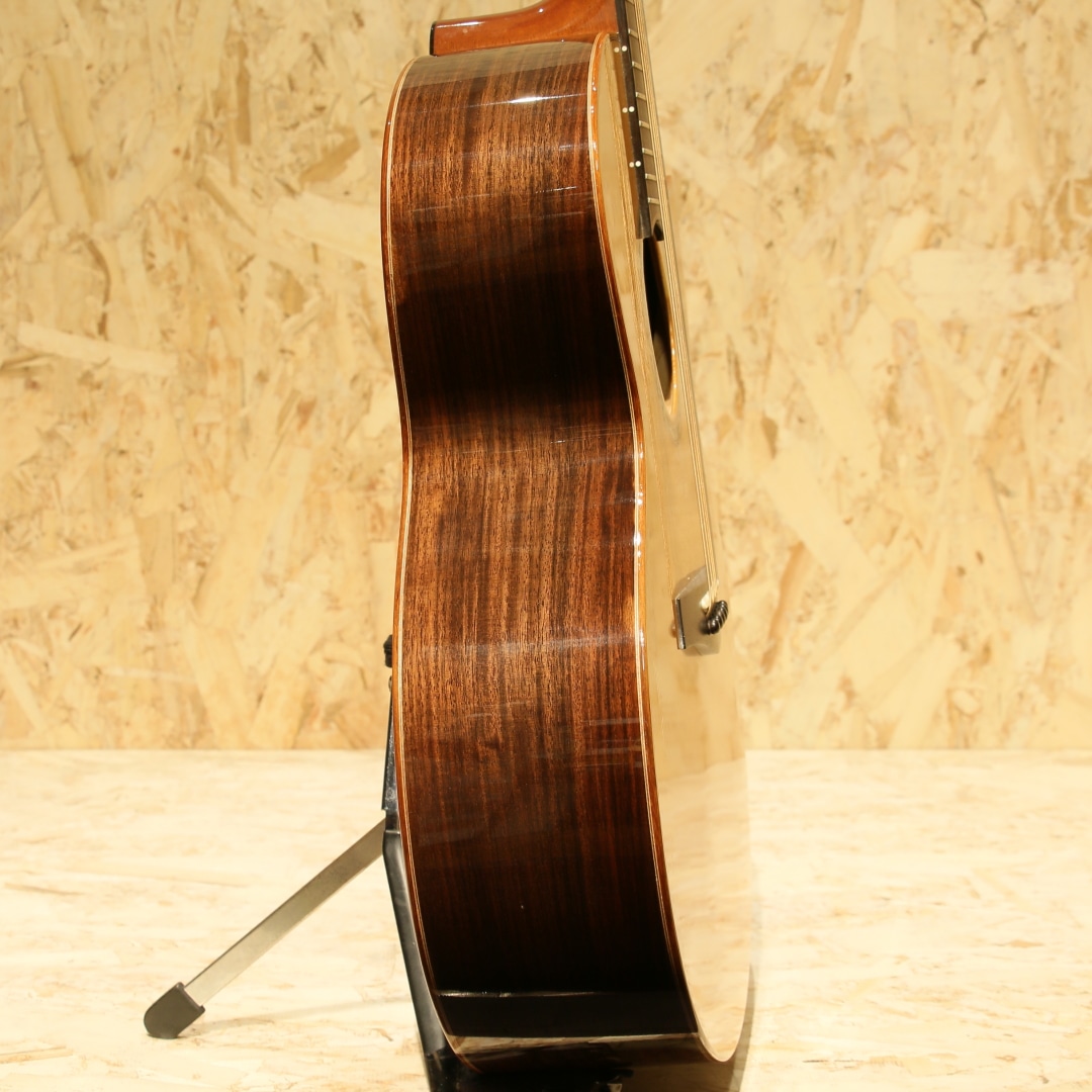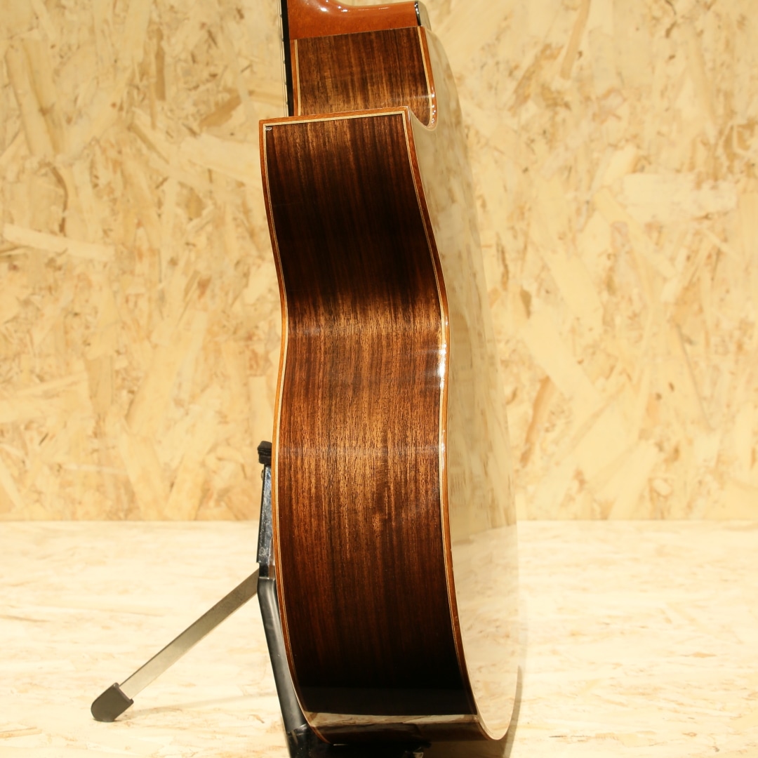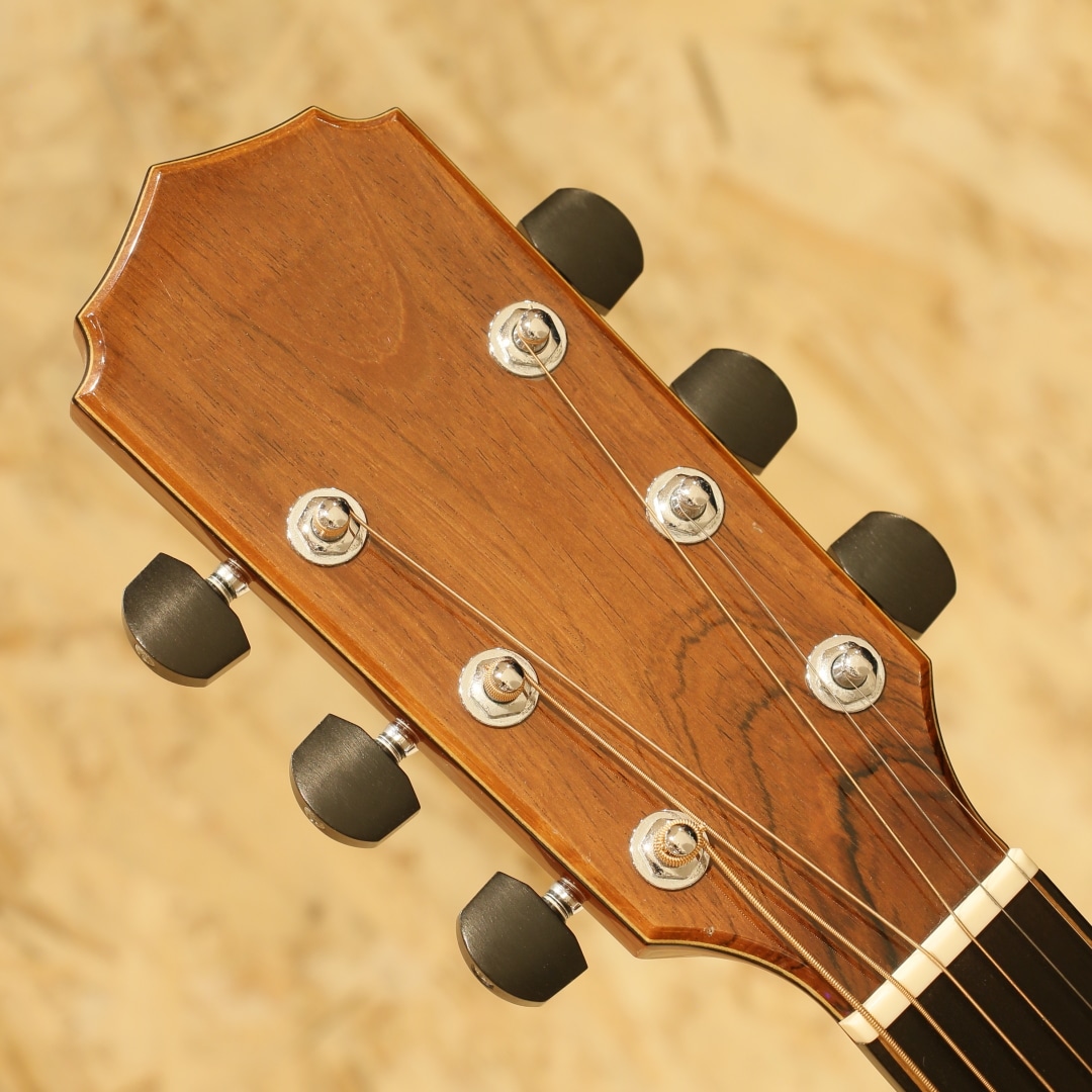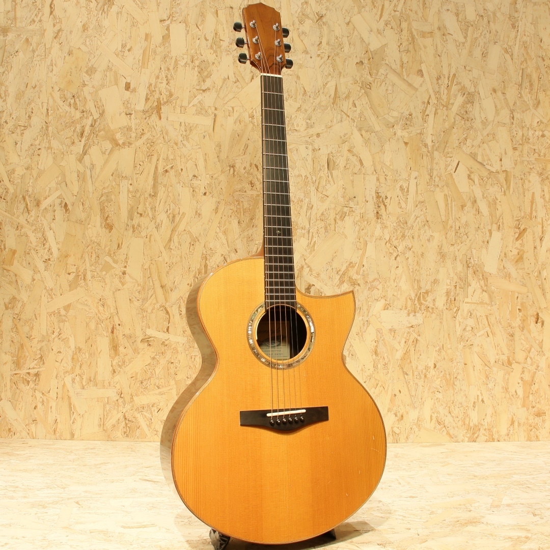 誰もが憧れるトップルシアーのアーヴィン・ソモギやジェイムスオルソンなど数多くのルシアーを日本国内で紹介してきた実績を持つKAKUTA CO.。TAK SAKASHTA氏の設計を元に共同で開発されたAGS(Acoustic Guitar Sanctuary)などのブランド販売経験などを経て展開されたのが本ブランドFinger Styleでした。実績から来る高い裏付けから手掛けられた設計を武器に国産メイドでの作りの良さとコスパの高さから数々のギターファンの間で話題となり、販売されていました。本器は約16インチサイズに深めのくびれをもったジャンボボディシェイプの1本。スプルーストップ、インディアンローズウッドサイド&バック、マホガニーネック、エボニー指板&ブリッジ、象徴的でインパクトのあるウッドラインと組み合わせた5mmアバロンロゼッタ、フローレンタインカッタウェイ、メイプル指板ライン、象徴的なヘッドフォルム。オリジナルのXブレイシングを採用しており、トップの反応が良く響き方Xブレイスとラティスの中間のようなバイブレーション。音立ちが繊細かつ、面で出てくるようなファットで広がりのある空気感。繊細なタッチの表現が秀逸で価格の想像以上のリッチな響きが纏ってくれます。後付けにてL.R Baggs Anthemを搭載。アンダーサドルピエゾ+マイクのデュアルピックアップシステム、音の芯を捉えるピエゾと空気感や煌びやかさを拾い上げるマイクを任意でミックス出来る優秀なシステム。バッテリーチェッカーで電池残量も確認でき、現代では定番となったL.R Baggsのフラッグシップモデルです。オールマイティさや生音の再現性の高さ、シンプルな操作感など汎用製品としては別格とも言えるピックアップです。トップ面下部に木部まで達する深めの打痕がありますが、貫通はしておらずご使用に支障はございません。その他、先述の傷付近やボディ&ヘッドバインディングに細かな打痕など表面上の使用感は見られますが、経年を考えると比較的キレイなコンディションを保たれている本器。ネック周りの演奏性も良好です。当時より少数で製造されてきた経緯のブランドのため、お手に取られた方も少ないかとおもいます。ぜひ価格以上のクオリティの高さをご体感ください。オリジナルハードケースが付属します。