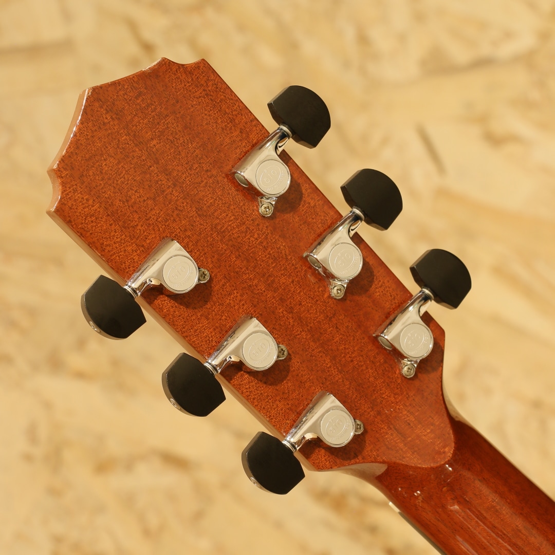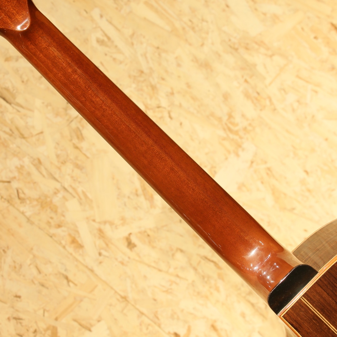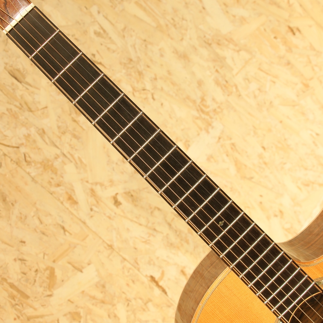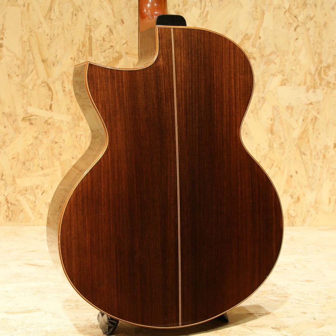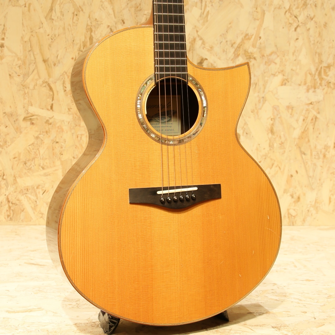 誰もが憧れるトップルシアーのアーヴィン・ソモギやジェイムスオルソンなど数多くのルシアーを日本国内で紹介してきた実績を持つKAKUTA CO.。TAK SAKASHTA氏の設計を元に共同で開発されたAGS(Acoustic Guitar Sanctuary)などのブランド販売経験などを経て展開されたのが本ブランドFinger Styleでした。実績から来る高い裏付けから手掛けられた設計を武器に国産メイドでの作りの良さとコスパの高さから数々のギターファンの間で話題となり、販売されていました。本器は約16インチサイズに深めのくびれをもったジャンボボディシェイプの1本。スプルーストップ、インディアンローズウッドサイド&バック、マホガニーネック、エボニー指板&ブリッジ、象徴的でインパクトのあるウッドラインと組み合わせた5mmアバロンロゼッタ、フローレンタインカッタウェイ、メイプル指板ライン、象徴的なヘッドフォルム。オリジナルのXブレイシングを採用しており、トップの反応が良く響き方Xブレイスとラティスの中間のようなバイブレーション。音立ちが繊細かつ、面で出てくるようなファットで広がりのある空気感。繊細なタッチの表現が秀逸で価格の想像以上のリッチな響きが纏ってくれます。後付けにてL.R Baggs Anthemを搭載。アンダーサドルピエゾ+マイクのデュアルピックアップシステム、音の芯を捉えるピエゾと空気感や煌びやかさを拾い上げるマイクを任意でミックス出来る優秀なシステム。バッテリーチェッカーで電池残量も確認でき、現代では定番となったL.R Baggsのフラッグシップモデルです。オールマイティさや生音の再現性の高さ、シンプルな操作感など汎用製品としては別格とも言えるピックアップです。トップ面下部に木部まで達する深めの打痕がありますが、貫通はしておらずご使用に支障はございません。その他、先述の傷付近やボディ&ヘッドバインディングに細かな打痕など表面上の使用感は見られますが、経年を考えると比較的キレイなコンディションを保たれている本器。ネック周りの演奏性も良好です。当時より少数で製造されてきた経緯のブランドのため、お手に取られた方も少ないかとおもいます。ぜひ価格以上のクオリティの高さをご体感ください。オリジナルハードケースが付属します。