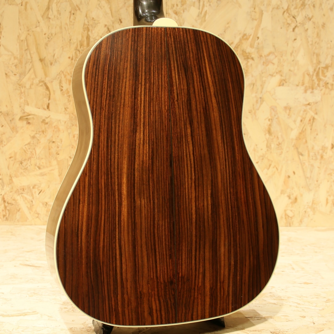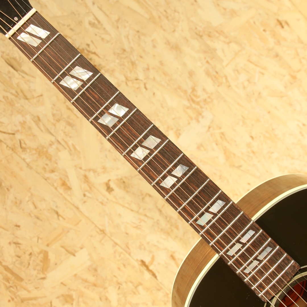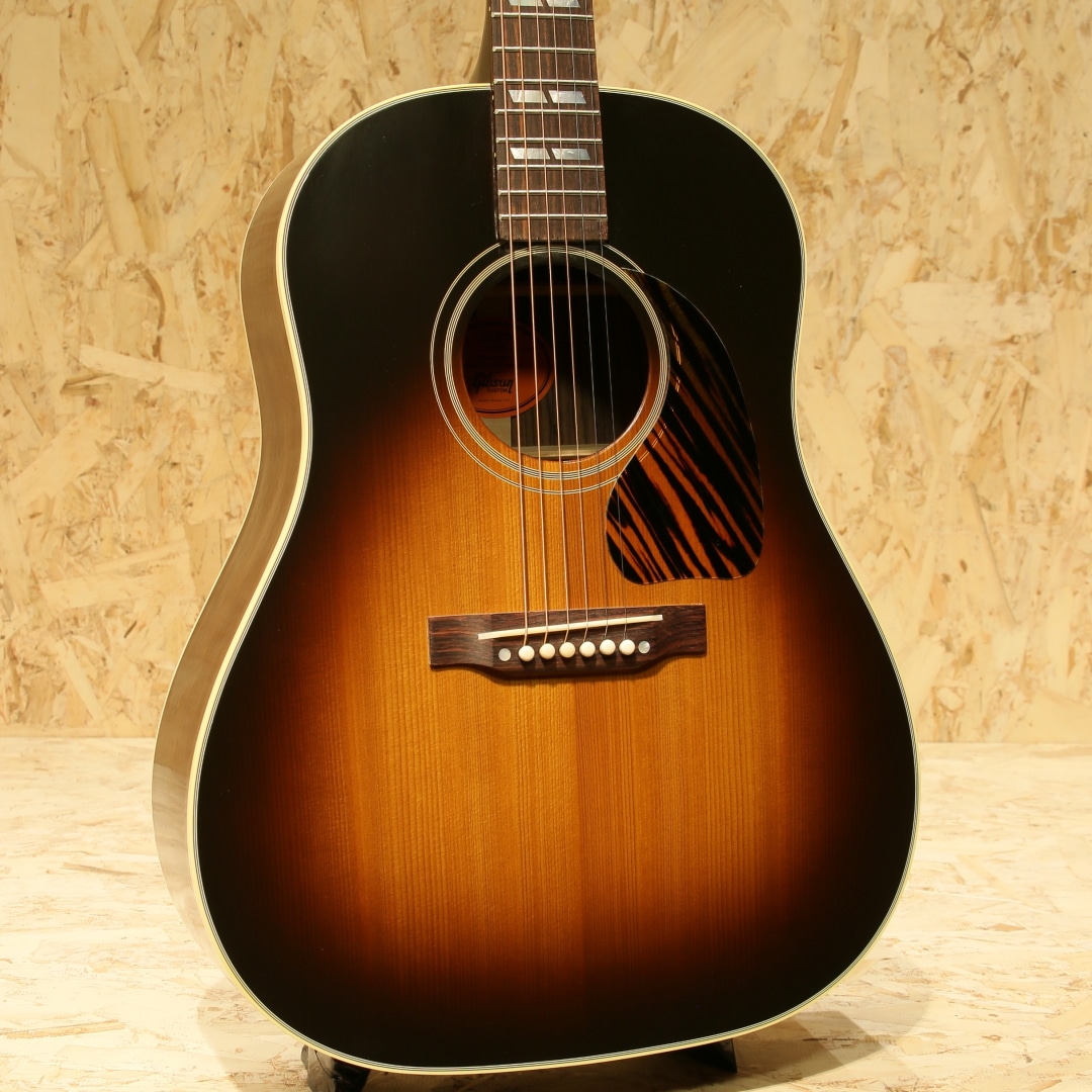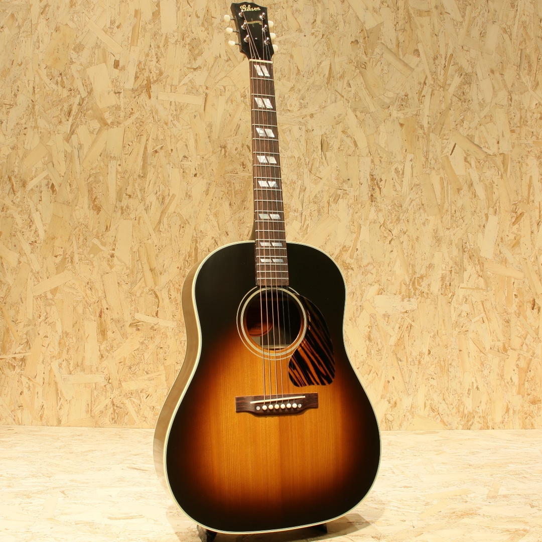 1942年に登場して以来、今もなお愛されて止まないJ-45。数々の音楽シーンの中で活躍してきた偉業は計り知れません。そのJ-45の上位機種にあたるのがこのSouthern Jumbo。本器は発売開始初年度1942年を再現した復刻したモデル。サーマリー・エイジドアディロンダックレッドスプルーストップ、サイド&バックには色濃くストレートグレインが美しいローズウッド、マホガニーネック、ローズウッド指板にはダブルパラレログラムインレイ、極初期に見られるダウンベリーのローズウッドブリッジにロングサドル、極初期の特徴でもあるファイアーストライプピックガード、バナーヘッドロゴ、オープンギアニッケルチューナー、ニカワ接着、シンラッカーフィニッシュのVOS仕上げ、スキャロップドXブレーシング。Southern Jumboと聴いて馴染みのある仕様はマホガニーサイドバックでしょう。ですが極初期の仕様は全く異なり30年代の名残を残したファイアーストライプピックガード、ローズウッドサイドバック、ダウンベリーといった仕様でした。この仕様をカスタムショップで再現すべく製作されているのが本器。ネック自体も40年代の代名詞とも言えるベースボールバットの異名を持つほどの太いネック、そのイメージで太さのあるグリップに仕上げられておりファットなサウンドを獲得。ナット幅こそ44.95mm幅とやや幅広ですが厚みはそれほどでもなく現代的なアレンジとなっているところも嬉しい所です。もたつきの無いドライなトーン、そして何よりも爆発力のある響き、音の情報量も多くレンジ感の広い辺りもクオリティの高さが窺えます。音の暴力とも言える程のファット且つボリューミーなサウンド、この爆発力は他ブランドでは中々体感できない程のインパクト。ウォームな低域とエッジの効いた中高域が織りなす優れた表現力とリッチなサウンドでプレイヤーを支え、どんなときにも信頼できるパートナーとして人気を誇るSouthern Jumbo。ギブソン黄金期のオリジナル・モデルならではの個性、雰囲気、フィーリングが感じられる仕上がり。現行品"Southern Jumbo"の中でもまさに最高峰、最上位のサウンド。是非一度ご体感下さいませ。