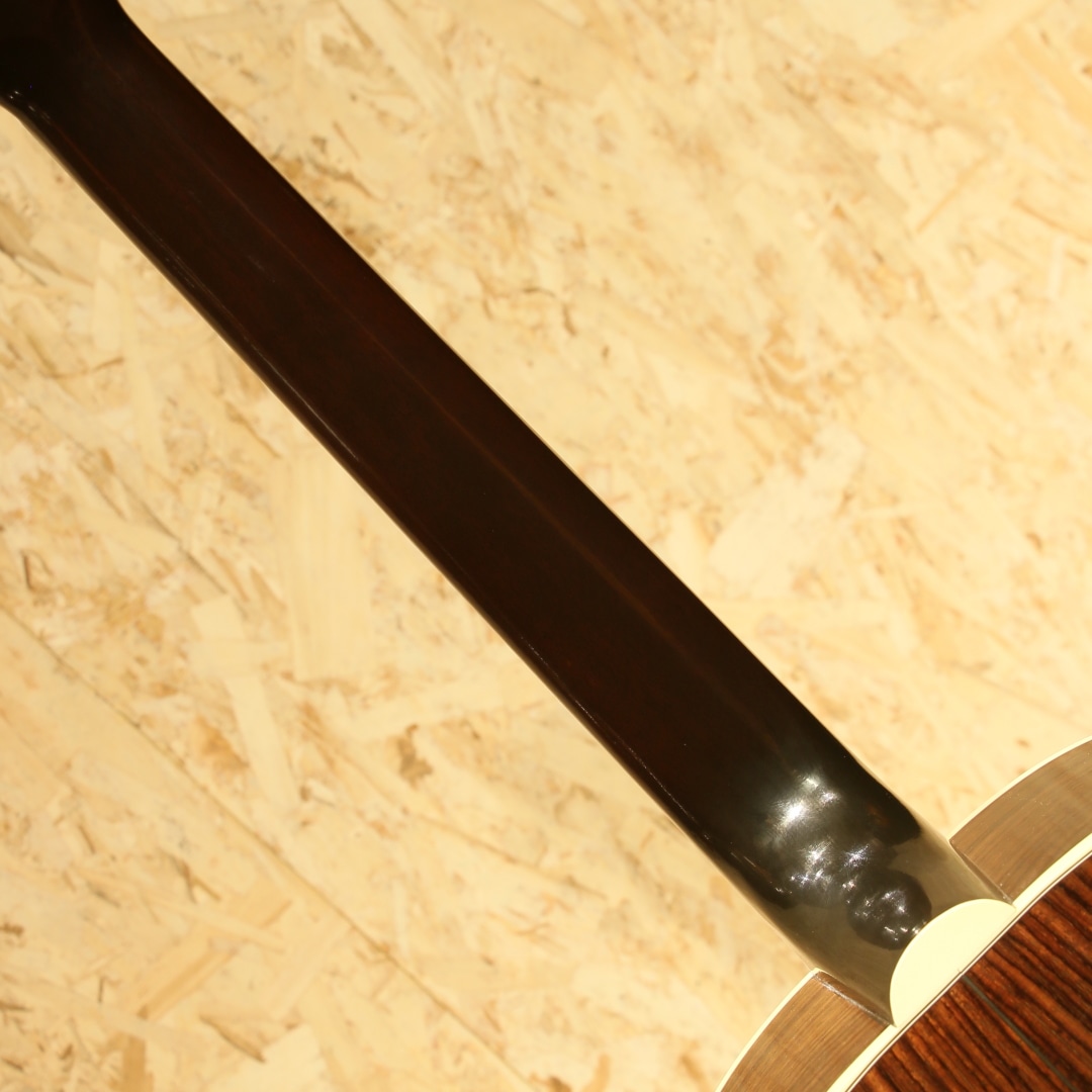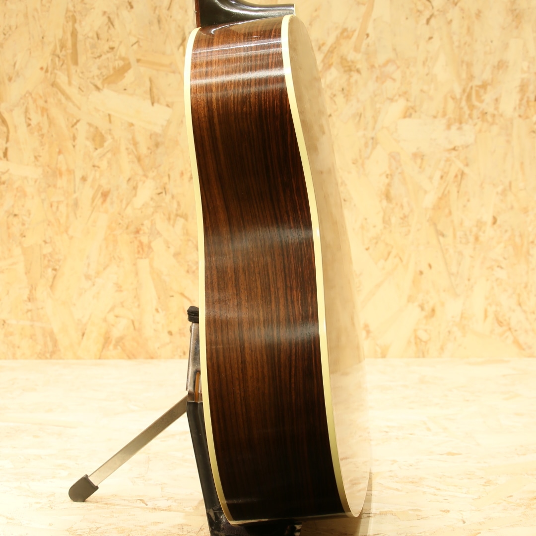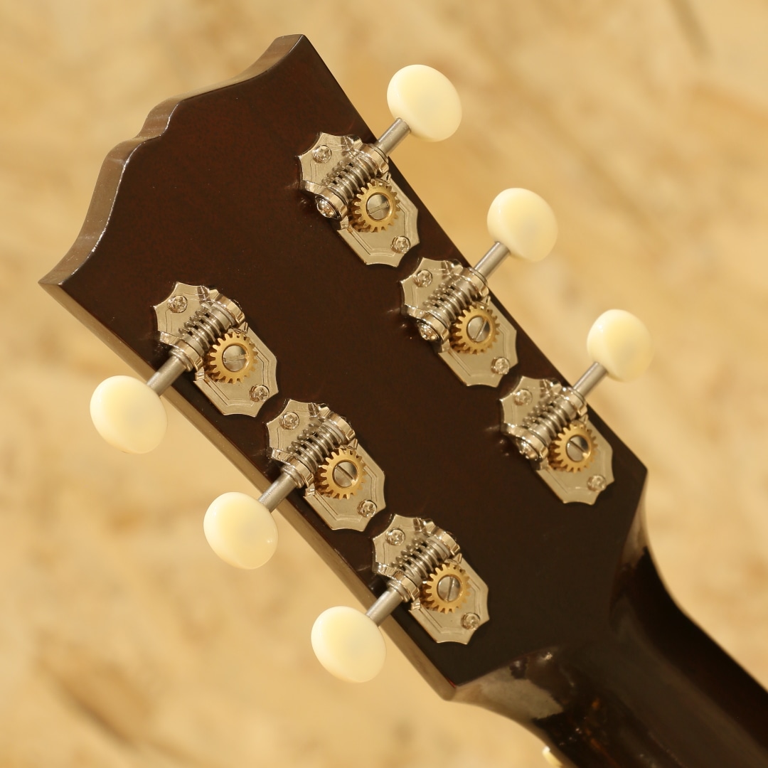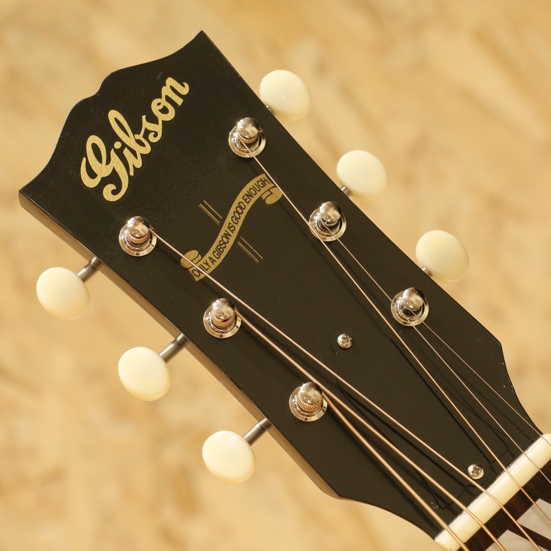 1942年に登場して以来、今もなお愛されて止まないJ-45。数々の音楽シーンの中で活躍してきた偉業は計り知れません。そのJ-45の上位機種にあたるのがこのSouthern Jumbo。本器は発売開始初年度1942年を再現した復刻したモデル。サーマリー・エイジドアディロンダックレッドスプルーストップ、サイド&バックには色濃くストレートグレインが美しいローズウッド、マホガニーネック、ローズウッド指板にはダブルパラレログラムインレイ、極初期に見られるダウンベリーのローズウッドブリッジにロングサドル、極初期の特徴でもあるファイアーストライプピックガード、バナーヘッドロゴ、オープンギアニッケルチューナー、ニカワ接着、シンラッカーフィニッシュのVOS仕上げ、スキャロップドXブレーシング。Southern Jumboと聴いて馴染みのある仕様はマホガニーサイドバックでしょう。ですが極初期の仕様は全く異なり30年代の名残を残したファイアーストライプピックガード、ローズウッドサイドバック、ダウンベリーといった仕様でした。この仕様をカスタムショップで再現すべく製作されているのが本器。ネック自体も40年代の代名詞とも言えるベースボールバットの異名を持つほどの太いネック、そのイメージで太さのあるグリップに仕上げられておりファットなサウンドを獲得。ナット幅こそ44.95mm幅とやや幅広ですが厚みはそれほどでもなく現代的なアレンジとなっているところも嬉しい所です。もたつきの無いドライなトーン、そして何よりも爆発力のある響き、音の情報量も多くレンジ感の広い辺りもクオリティの高さが窺えます。音の暴力とも言える程のファット且つボリューミーなサウンド、この爆発力は他ブランドでは中々体感できない程のインパクト。ウォームな低域とエッジの効いた中高域が織りなす優れた表現力とリッチなサウンドでプレイヤーを支え、どんなときにも信頼できるパートナーとして人気を誇るSouthern Jumbo。ギブソン黄金期のオリジナル・モデルならではの個性、雰囲気、フィーリングが感じられる仕上がり。現行品"Southern Jumbo"の中でもまさに最高峰、最上位のサウンド。是非一度ご体感下さいませ。