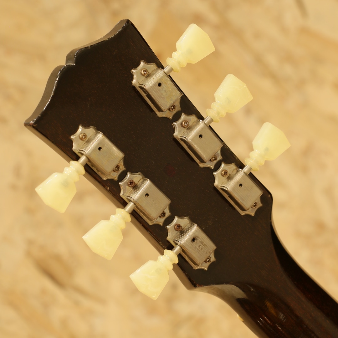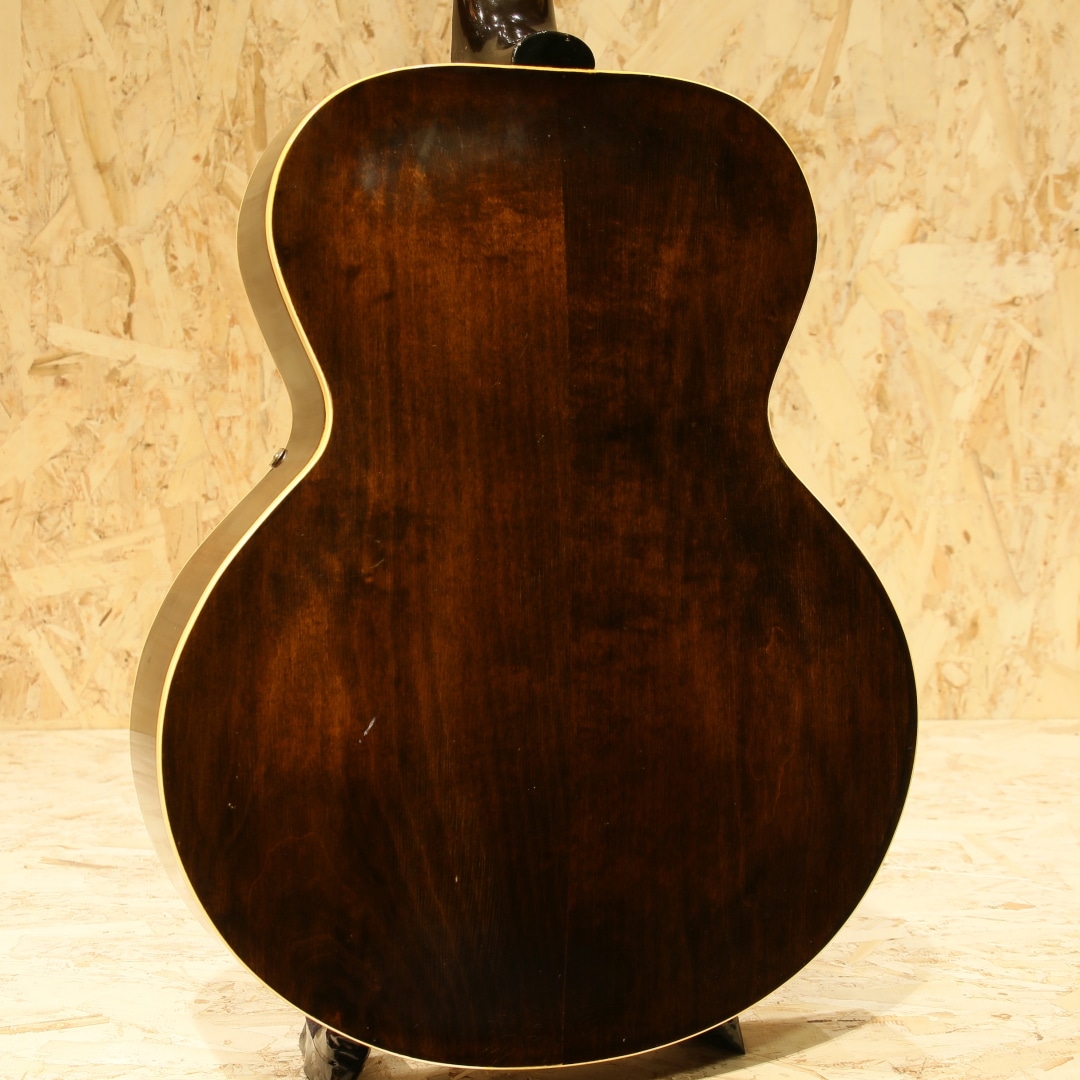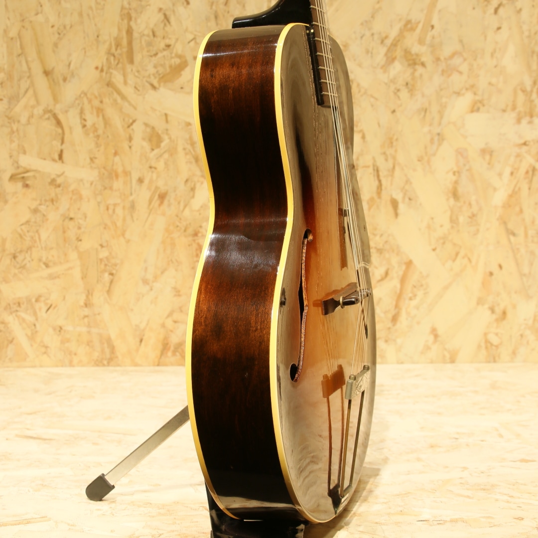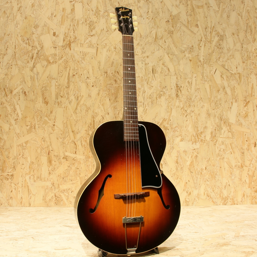 今でこそフラットトップの印象が強いですが元々はアーチトップギターやマンドリン、バンジョー等を製作するところから始まっているギブソン。その中でもギブソンアコースティックアーチトップ"L-50"は1932年~1971年まで生産されていました。ベーシックなモデルで年代ごとにサイズや材構成等の仕様が変わりますが、本器は1943~1945までのスペック、16インチフルボディを持つ仕様の1本です。スプルーストップ、メイプルサイド&バック、マホガニーネック、ハカランダ指板&ブリッジ、パーロイド指板ドット、1プライバインディング、3プライピックガード、ナット幅約44.5ミリ、テーパードヘッド。ペグはクルーソン1ライン3ParSideのモノへと交換されています。1932年の発売から1950年頃まで細やかな仕様変更があり、それ以降は大きな仕様変更も無く1971年まで製造されていました。発売当初はラウンドホール仕様、34年頃からはFホール仕様へ。ボディシェイプも30年代に数度の変更を経て、馴染みのある形になりました。46年にはシングルバインドのピックガードや台形の指板インレイ、指板バインディングが入りますが、本器はその前の仕様。40年代前半を象徴するバンナーロゴやプリウォースクリプトロゴ、40年代特有であるベースボールバットネックなどの特徴を持った戦中期スペックの1本です。やはり太いサウンド、芯のハッキリとしたサウンドである点はこの時代共通。もたつきの無いカラッとしたサウンド、ガランとしたアーチトップ独特の響き方。枯れて乾いたノスタルジックな音色は昔ながらのジャンル、特にジャズにおいて非常に趣のある味わい深い響きを奏でてくれます。ネック裏の塗装剥げや当てキズ等の小キズは見られますが、全体的にも使用感の少ない状態をキープされており良い風格を持つ1本。ボディには艶を残したキレイな状態を保たれ、細かく入ったウェザーチェックには貫禄を感じられます。ネックのコンディションも良好に保たれ演奏性をキープされたFine Vintage。古き良きアーチトップギブソン、トラッドなスタイルを求める方にはうってつけの1本です。是非お手元でご体感下さいませ。