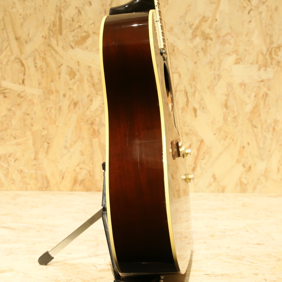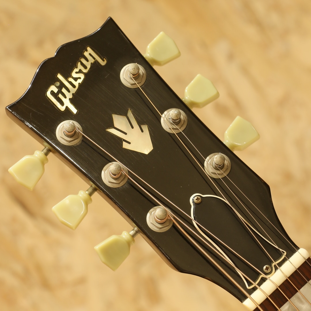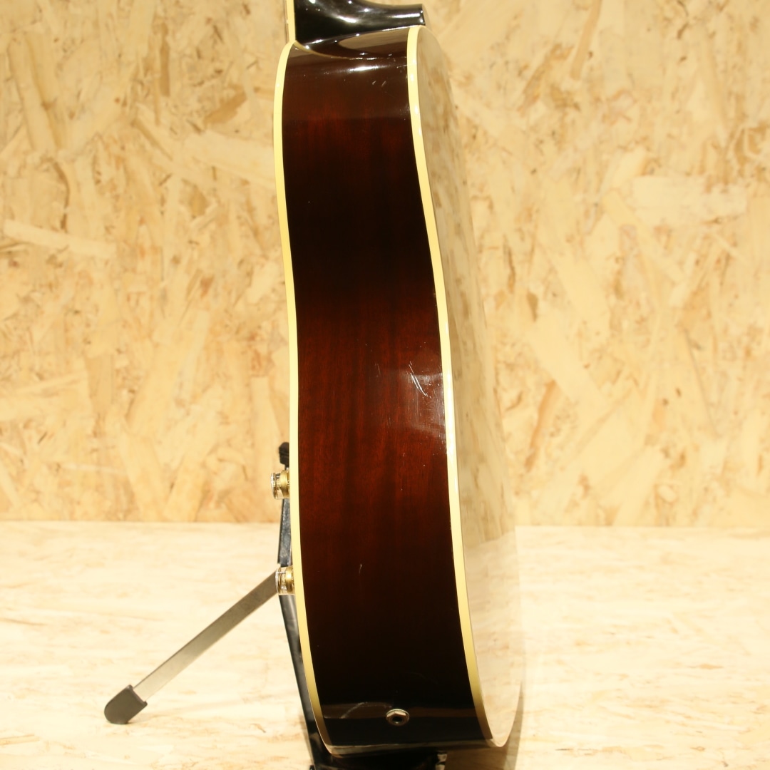 ジョン・レノンとジョージ・ハリスンがお揃いで入手したギター、ビートルズギアとしてあまりにも有名な機種である"J-160E"。1951年にアンサンブルの中でも音量で負けない様にと発表された世界で始めてピックアップが搭載されたフラットトップ"CF-100"。その基本コンセプトを受け継いだ"J-160E"は1954年に発表されました。その一風変わったルックス、独特のサウンドで一部のディープなファンの心を掴んで止まず絶大な支持を得続けています。本器は1991年製USED品。1990年頃よりリイシューモデルが復刻されますが本器はその初期頃にあたる個体です。スプルーストップ、マホガニーサイド&バック、マホガニーネック、ローズウッド指板&ブリッジ、ダブルラインキーストーンボタンペグ、べっこう柄ピックガード、コントロールハットノブ、ハムバッカーのP-100搭載、ノーマルサドル、15フレットジョイント、スキャロップドXブレイシング仕様。合板ボディのオリジナル器のイメージで生音が鳴らないアコギという印象がありますが、本器は単板ボディ仕様。力強く弾けば歯切れの良いアタック感が気持ちよく響きます。指で弾けば程よく甘く太いトーンを奏で、また違った表情を演出します。ピックアップにはハムバッカー仕様のマグネットピックアップP-100を搭載。ノイズに強い特性を持ち、P-90のノスタルジックでノイジーなラインサウンドに比べ、よりクリアで厚みのあるサウンドをアウトプット。トップ面の1vol.1toneのコントロールノブで扱いも容易、バンド編成やアコースティックバンドでもしっかりと存在感を放ちます。6弦側サイド面とサイドジャック付近に割れ修正がございます。以前にオリジナルピックアップとは別にマグネットピックアップが取り付けられた跡があり、サウンドホールにマグネットピックアップ取付箇所に反応したと思われる塗装溶けが確認できますが表面上のものでご使用上は問題ございません。エンドピン穴は12mm径のものが空いたままの状態です。その他、30年強の経過を思わせる打痕や打ちキズなどが散見されますが程よい使用感で良き雰囲気のように見えます。ネック含めたプレイコンディションは良好、現代的な弾きやすいセッティングですぐにでも即戦力となる1本です。生音、ラインサウンドともにしっかり使えるJ-160Eをお探しの方は是非、お試しください。オリジナルハードケースが付属します。