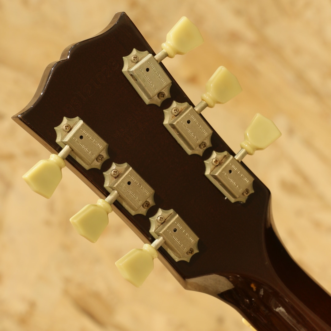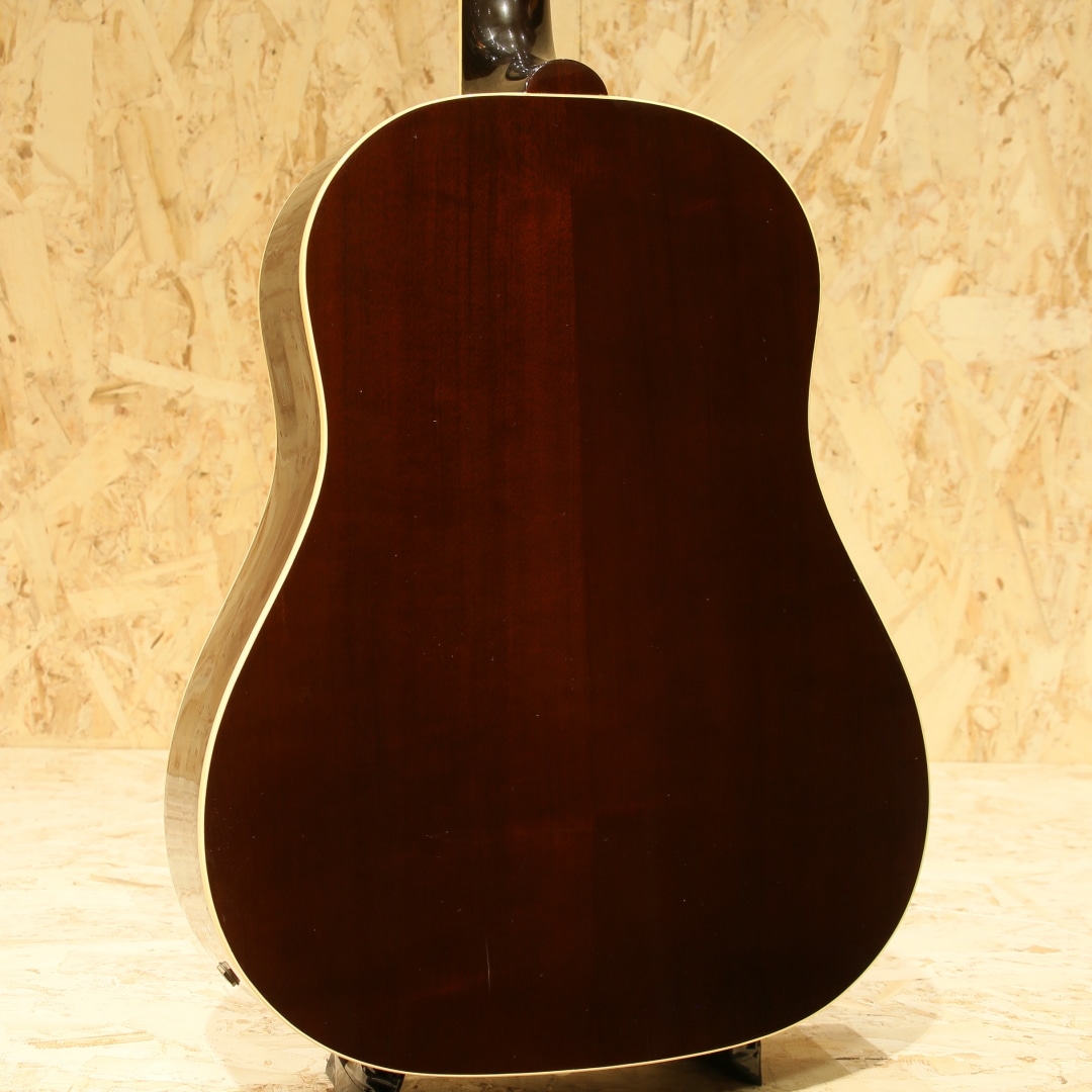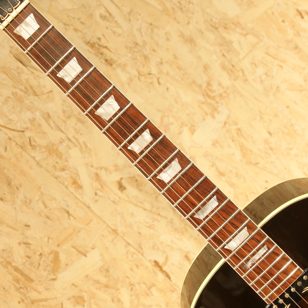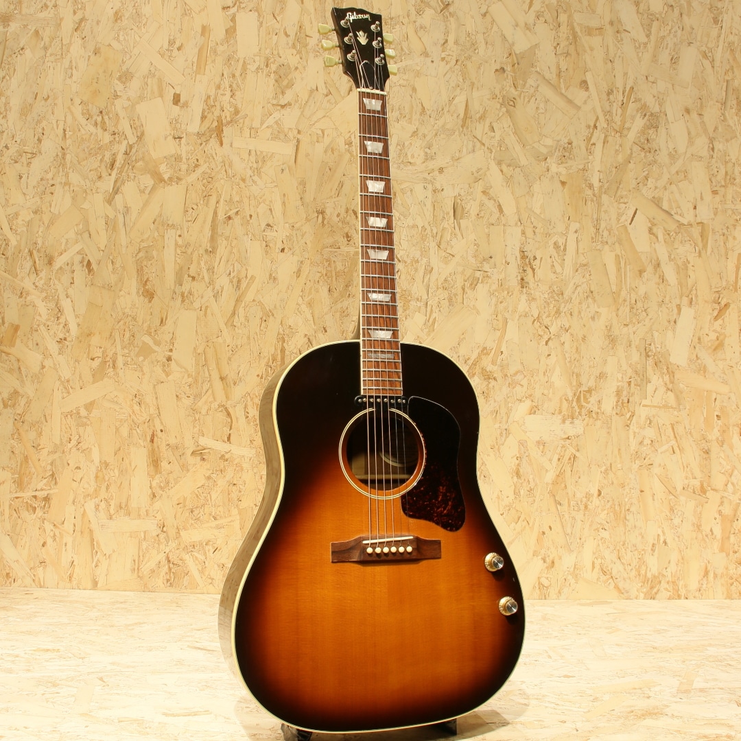 ジョン・レノンとジョージ・ハリスンがお揃いで入手したギター、ビートルズギアとしてあまりにも有名な機種である"J-160E"。1951年にアンサンブルの中でも音量で負けない様にと発表された世界で始めてピックアップが搭載されたフラットトップ"CF-100"。その基本コンセプトを受け継いだ"J-160E"は1954年に発表されました。その一風変わったルックス、独特のサウンドで一部のディープなファンの心を掴んで止まず絶大な支持を得続けています。本器は1991年製USED品。1990年頃よりリイシューモデルが復刻されますが本器はその初期頃にあたる個体です。スプルーストップ、マホガニーサイド&バック、マホガニーネック、ローズウッド指板&ブリッジ、ダブルラインキーストーンボタンペグ、べっこう柄ピックガード、コントロールハットノブ、ハムバッカーのP-100搭載、ノーマルサドル、15フレットジョイント、スキャロップドXブレイシング仕様。合板ボディのオリジナル器のイメージで生音が鳴らないアコギという印象がありますが、本器は単板ボディ仕様。力強く弾けば歯切れの良いアタック感が気持ちよく響きます。指で弾けば程よく甘く太いトーンを奏で、また違った表情を演出します。ピックアップにはハムバッカー仕様のマグネットピックアップP-100を搭載。ノイズに強い特性を持ち、P-90のノスタルジックでノイジーなラインサウンドに比べ、よりクリアで厚みのあるサウンドをアウトプット。トップ面の1vol.1toneのコントロールノブで扱いも容易、バンド編成やアコースティックバンドでもしっかりと存在感を放ちます。6弦側サイド面とサイドジャック付近に割れ修正がございます。以前にオリジナルピックアップとは別にマグネットピックアップが取り付けられた跡があり、サウンドホールにマグネットピックアップ取付箇所に反応したと思われる塗装溶けが確認できますが表面上のものでご使用上は問題ございません。エンドピン穴は12mm径のものが空いたままの状態です。その他、30年強の経過を思わせる打痕や打ちキズなどが散見されますが程よい使用感で良き雰囲気のように見えます。ネック含めたプレイコンディションは良好、現代的な弾きやすいセッティングですぐにでも即戦力となる1本です。生音、ラインサウンドともにしっかり使えるJ-160Eをお探しの方は是非、お試しください。オリジナルハードケースが付属します。
