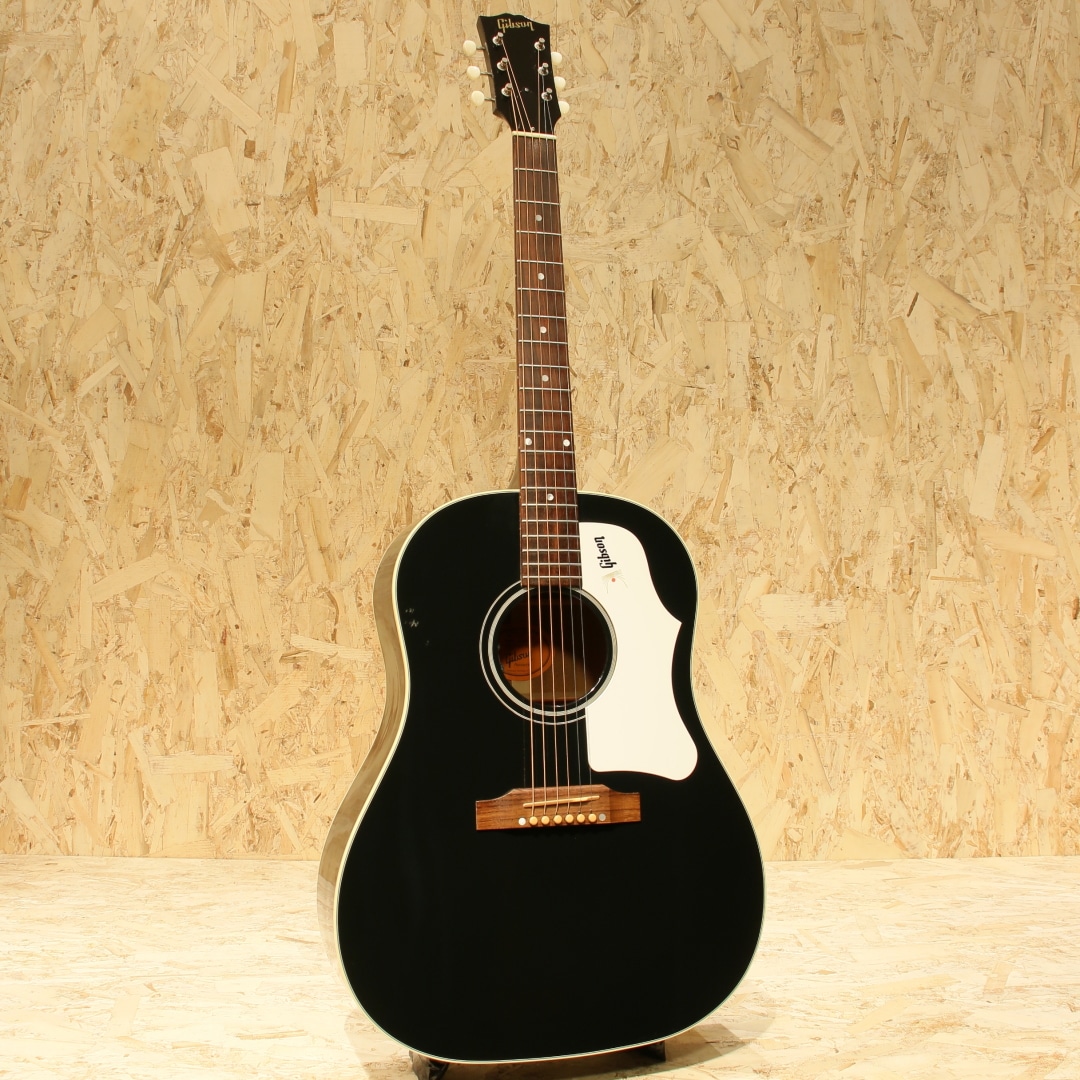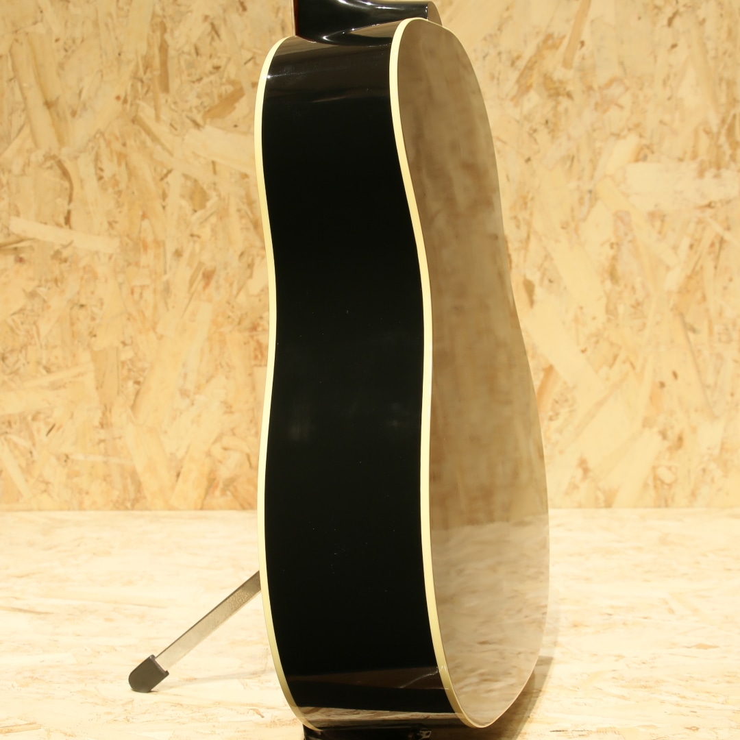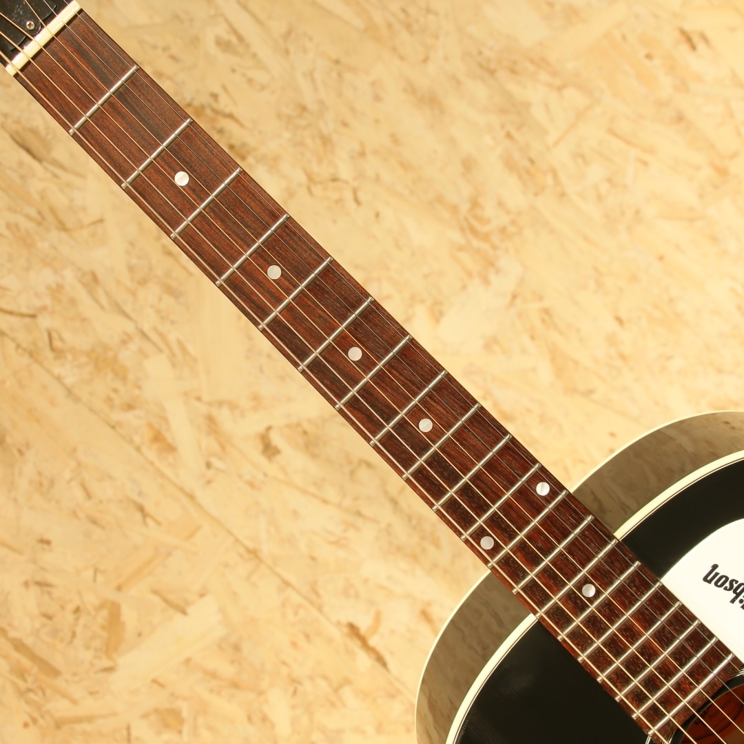 1942年にギブソンが発売を開始したJ-45。通称ワーキング・ホース、ライバルであるマーチン社のドレッドノートモデルに対抗すべく製造開始されたラウンドショルダー型ジャンボシリーズのひとつで、ギブソン製のアコースティックギターのなかではもっとも有名で広く使われるモデルです。本器は1960年代製のJ-45のイメージから製作された当時のマンスリーリミテッドモデル"1960's J-45”。人気の高い67-69年期に少数実在したエボニーブラックカラーにて仕上げられた2016年製USED品です。シトカスプルーストップ、マホガニーサイド&バック、マホガニーネック、ローズウッド指板&ブリッジ、オリジナルクルーソンタイプ3連ペグ、パール指板ドット、オリジナルロゴ入りホワイトラージガード、ダブルリングロゼッタ、スキャロップドXブレイシング、ノーマルサドル。43mmナット幅に程よく薄いネックシェイプで比較的馴染みの良いネックグリップ。60年代復刻モデルは最大の特徴であるアジャスタブルサドルにて製作されることが多いですが、本器はノーマルサドルとなっております。しっかりとブリッジに密着されいるからこそのコシのある野太いトーン。ラウンドショルダーらしい和音のまとまりはザクザクと刻むストロークプレイに最適です。ローミッドの響く箱鳴り、小気味よい倍音を響かすハイトーンはジャンル問わず幅広く応えてくれるオールラウンドな1本です。搭載されているL.R.Baggs社製Elementピックアップは、アンダーサドルピエゾピックアップで音の芯をキレイに拾い上げアコースティック感のある柔らかい響きを出力してくれます。配信や宅録からステージまで、幅広い用途でそのポテンシャルの高さを存分に発揮できます。トップ面6弦側くびれ付近に大き目な打痕、ヘッド裏シリアル下部にシールがはがされた跡が確認できますが、どちらも使用上への影響はございません。ブラックカラーの為、擦り傷や小傷などは否めませんが大きく雰囲気を損ねるようなものは無くグッドコンディションを保った1本です。現ラインナップとは異なる人気のブラックカラーのエレアコ仕様!オリジナルハードケースが付属します。