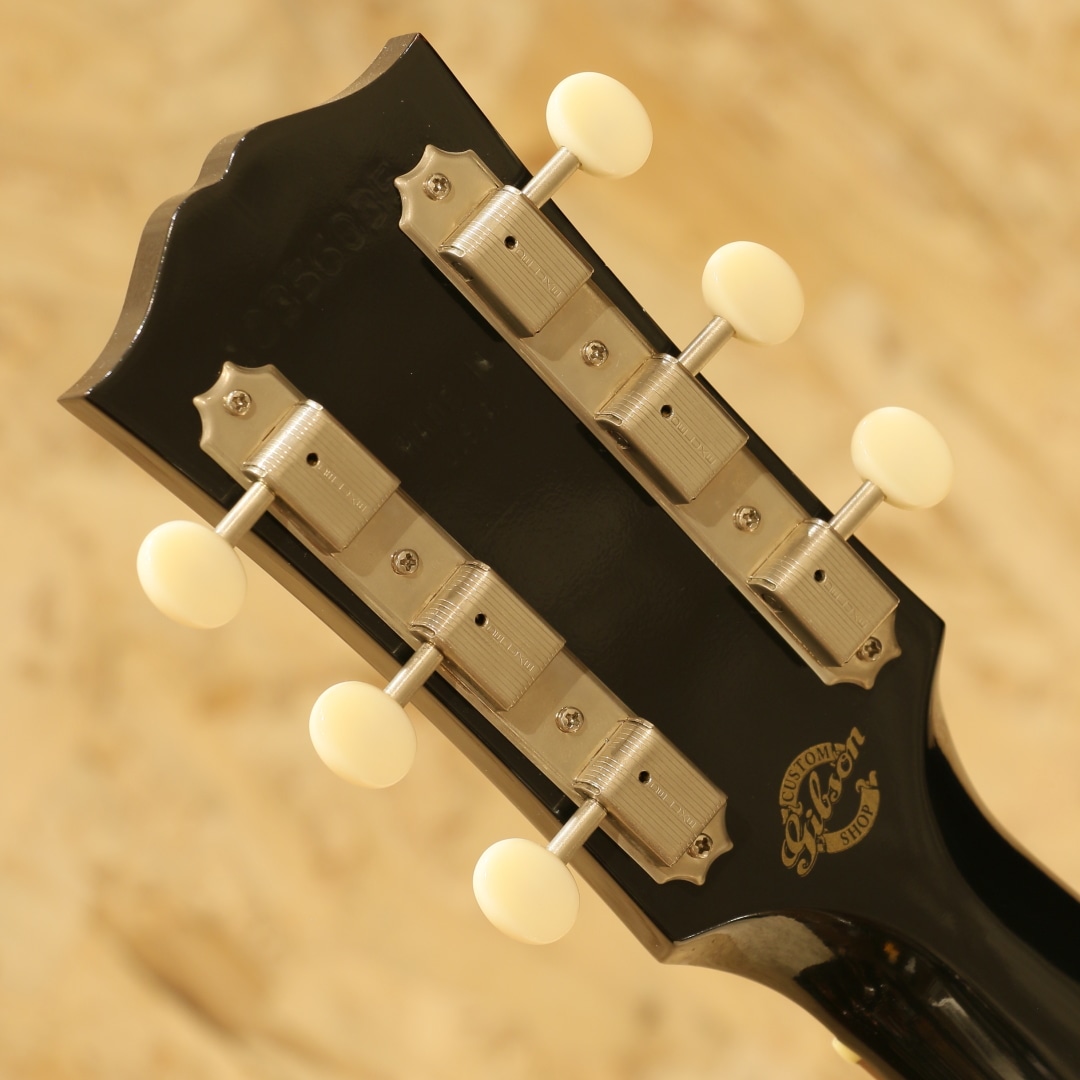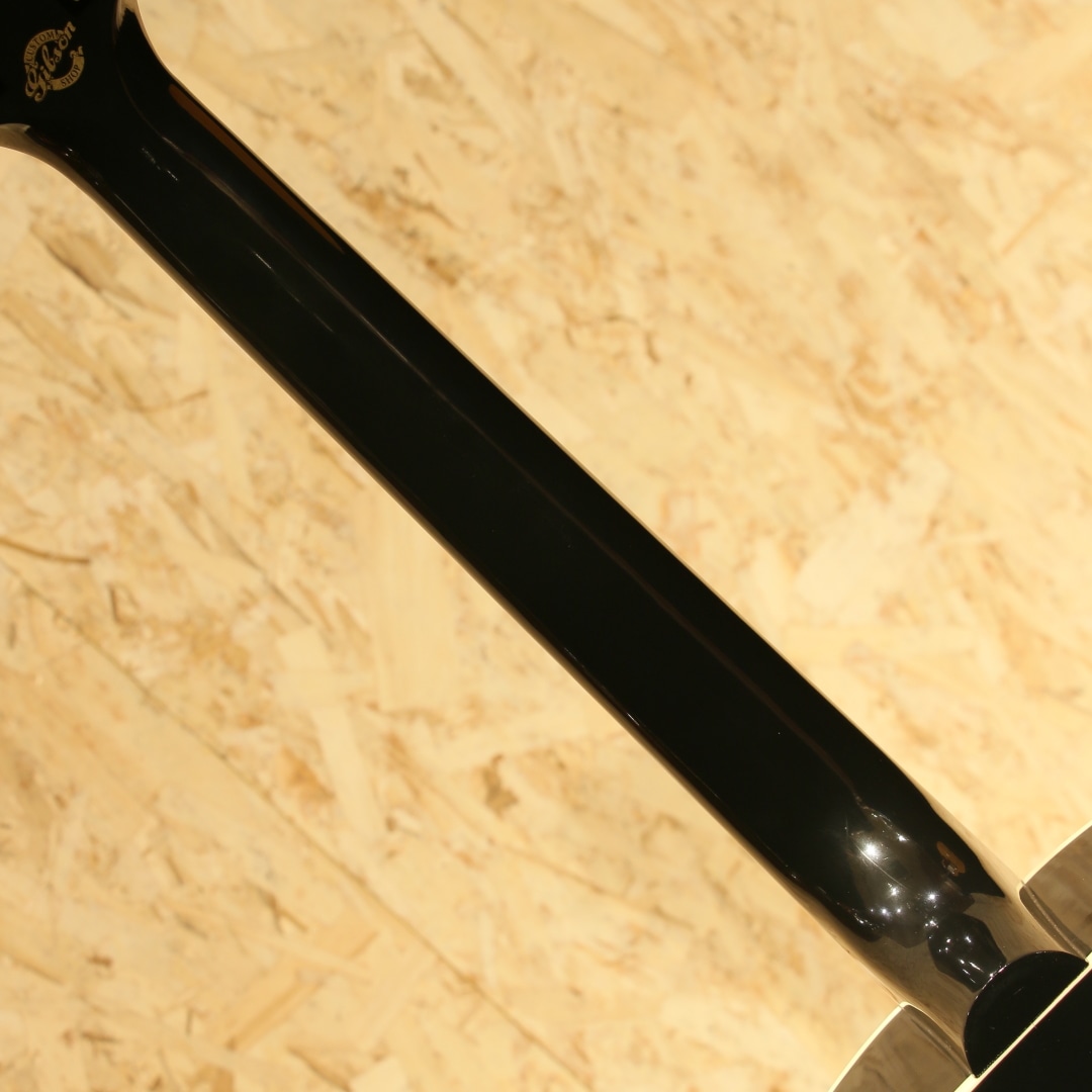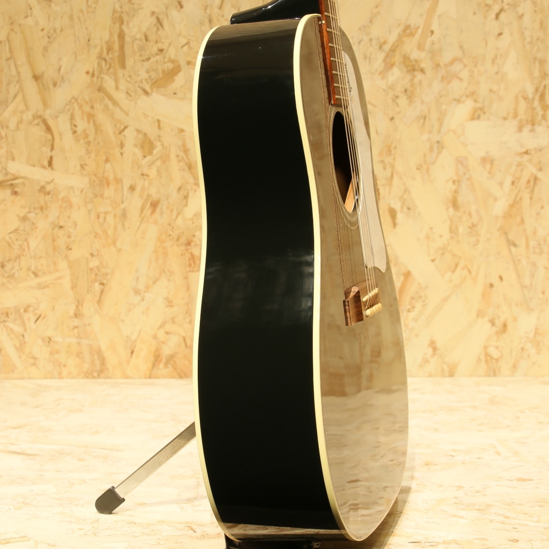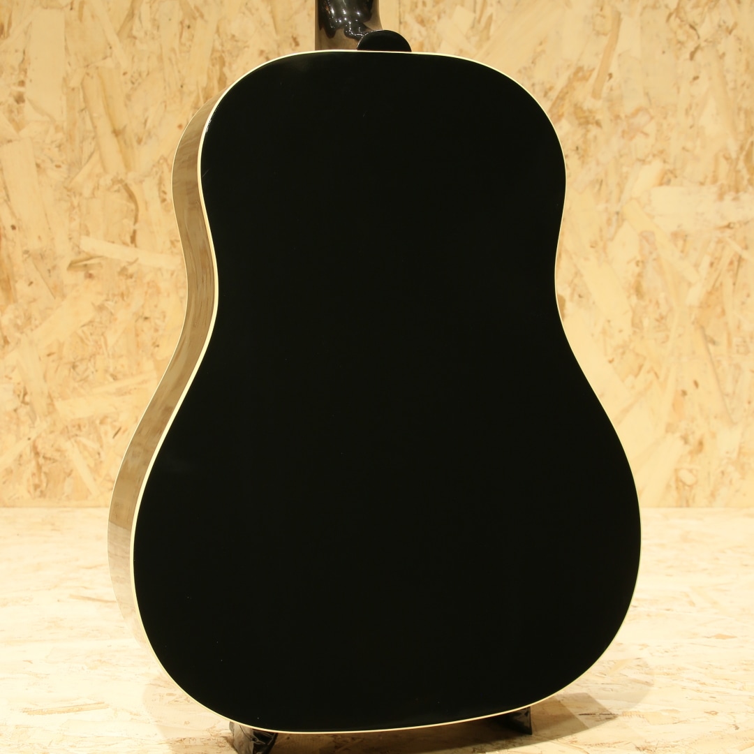1942年にギブソンが発売を開始したJ-45。通称ワーキング・ホース、ライバルであるマーチン社のドレッドノートモデルに対抗すべく製造開始されたラウンドショルダー型ジャンボシリーズのひとつで、ギブソン製のアコースティックギターのなかではもっとも有名で広く使われるモデルです。本器は1960年代製のJ-45のイメージから製作された当時のマンスリーリミテッドモデル"1960's J-45”。人気の高い67-69年期に少数実在したエボニーブラックカラーにて仕上げられた2016年製USED品です。シトカスプルーストップ、マホガニーサイド&バック、マホガニーネック、ローズウッド指板&ブリッジ、オリジナルクルーソンタイプ3連ペグ、パール指板ドット、オリジナルロゴ入りホワイトラージガード、ダブルリングロゼッタ、スキャロップドXブレイシング、ノーマルサドル。43mmナット幅に程よく薄いネックシェイプで比較的馴染みの良いネックグリップ。60年代復刻モデルは最大の特徴であるアジャスタブルサドルにて製作されることが多いですが、本器はノーマルサドルとなっております。しっかりとブリッジに密着されいるからこそのコシのある野太いトーン。ラウンドショルダーらしい和音のまとまりはザクザクと刻むストロークプレイに最適です。ローミッドの響く箱鳴り、小気味よい倍音を響かすハイトーンはジャンル問わず幅広く応えてくれるオールラウンドな1本です。搭載されているL.R.Baggs社製Elementピックアップは、アンダーサドルピエゾピックアップで音の芯をキレイに拾い上げアコースティック感のある柔らかい響きを出力してくれます。配信や宅録からステージまで、幅広い用途でそのポテンシャルの高さを存分に発揮できます。トップ面6弦側くびれ付近に大き目な打痕、ヘッド裏シリアル下部にシールがはがされた跡が確認できますが、どちらも使用上への影響はございません。ブラックカラーの為、擦り傷や小傷などは否めませんが大きく雰囲気を損ねるようなものは無くグッドコンディションを保った1本です。現ラインナップとは異なる人気のブラックカラーのエレアコ仕様!オリジナルハードケースが付属します。