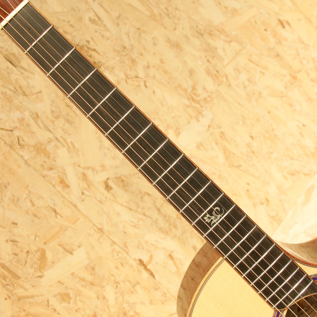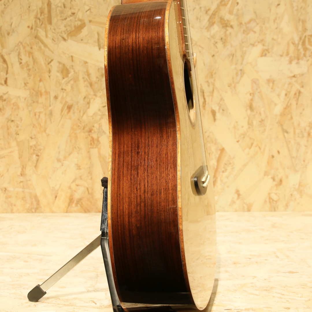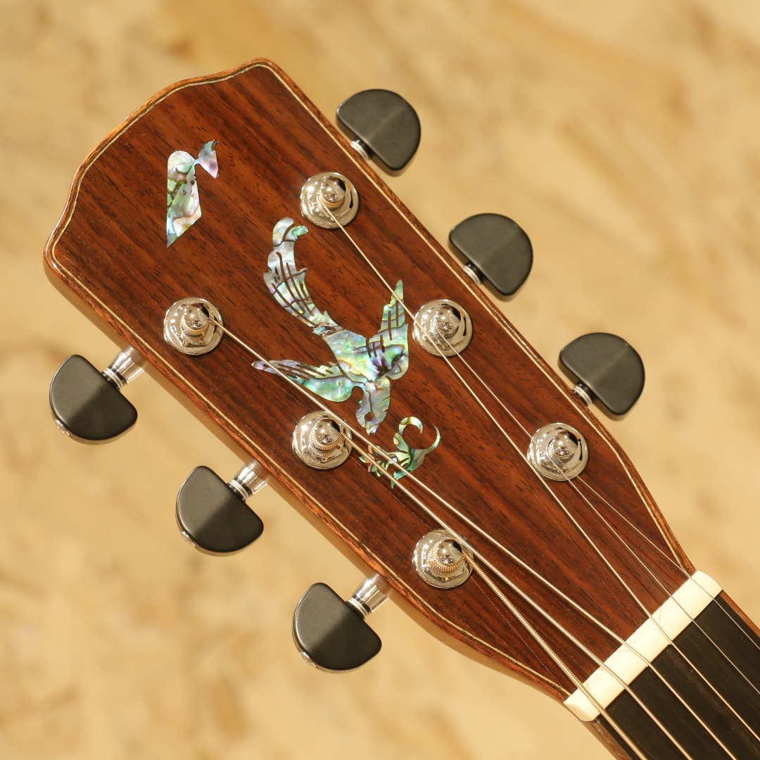 以前はフォークブームの一翼を担っていた国産ブランド”Morris”、2000年代初頭頃より大量生産から半手工品へというキャッチフレーズを掲げ、シフトチェンジ。現在ではフィンガーピッキング用ギターの顔と言えるファクトリーブランドとして長野県松本で良質なギターを生産しています。本器は、長野県に構える純国産工場で手掛けられるフィンガーピッカー御用達モデル"Sシリーズ"。そのフラッグシップモデルの"S-106"です。スプルーストップ、ローズウッドサイド&バック、マホガニーネック、エボニー指板&ブリッジ、モーリスロゴ入りゴトーぺグ、アバロンヘッドインレイ、ウッドバインディング、フローレンカッタウェイ、スキャロップドダブルXブレイシング、B-Bandアンダーサドルピックアップ搭載。少し胴の深めなオーディトリアムボディは、抱えやすさと音量感の絶妙なバランスを持っています。Sシリーズのネックにはプログレッシブ・シンネックが採用されておりナット位置で44mmの幅。ネックの厚みは1フレット位置で21mm、10フレット位置で22mmと、厚みの変化の少なく様々なポジションを演奏することの多いフィンガースタイルプレイヤーにとって嬉しいストレートタイプの薄型ネックです。6弦は親指で抑えやすく1弦は弦落ちしにくい左右非対称の弦間ピッチでテクニカルなフレーズにも対応してくれるオールマイティな1本です。肝心のサウンドは立ち上がりが良く、繊細なタッチからパワー感のあるストロークまでしっかりと対応してくれるレスポンスの良さが魅力的。ディープラウンドバックにより倍音成分が強調され低音域にボリューム感のあるサウンドを、中高音域は繊細で煌びやか。透き通る様なサスティーンは聞き手だけではなく弾き手までをも虜にします。初登場からこれまでに3度の仕様変更を経て、"III"が現代の最新仕様。フィンガースタイルプレイヤーにはありがたいニーズの詰まった国産フィンガースタイルギターのスタンダードの呼び声も高い間違いの無い1本。オリジナルハードケースが付属します。