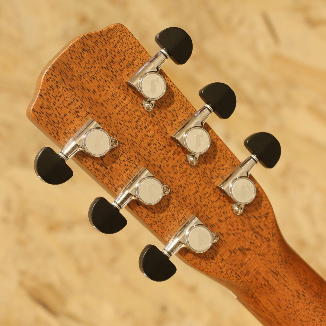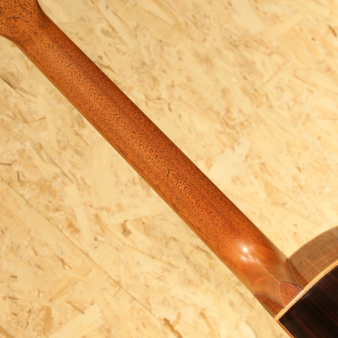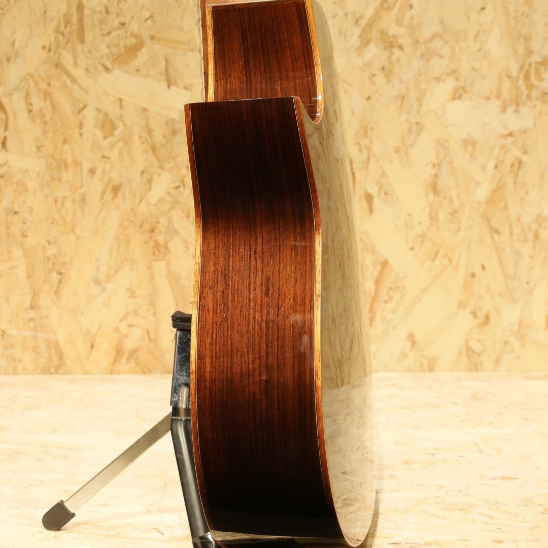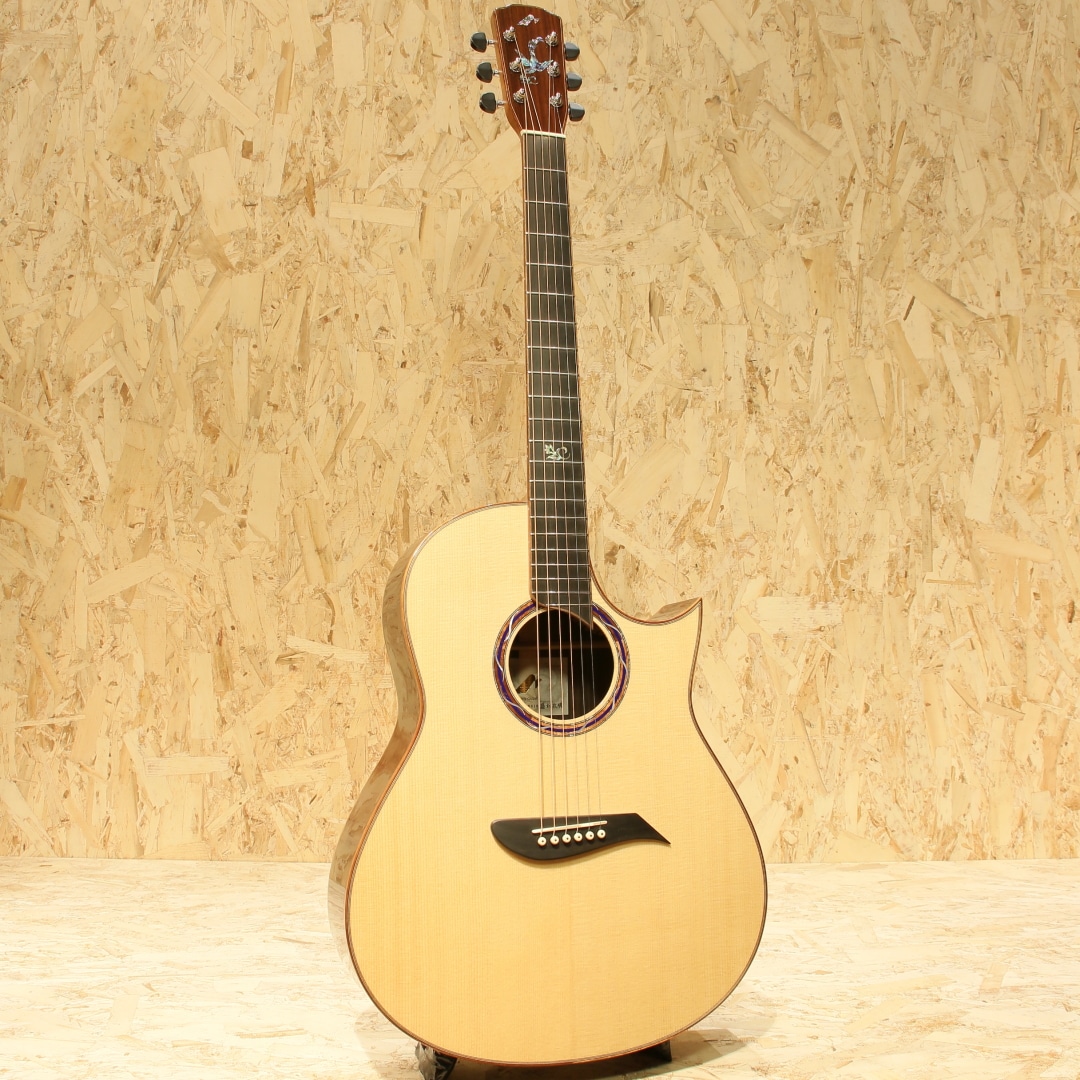 以前はフォークブームの一翼を担っていた国産ブランド”Morris”、2000年代初頭頃より大量生産から半手工品へというキャッチフレーズを掲げ、シフトチェンジ。現在ではフィンガーピッキング用ギターの顔と言えるファクトリーブランドとして長野県松本で良質なギターを生産しています。本器は、長野県に構える純国産工場で手掛けられるフィンガーピッカー御用達モデル"Sシリーズ"。そのフラッグシップモデルの"S-106"です。スプルーストップ、ローズウッドサイド&バック、マホガニーネック、エボニー指板&ブリッジ、モーリスロゴ入りゴトーぺグ、アバロンヘッドインレイ、ウッドバインディング、フローレンカッタウェイ、スキャロップドダブルXブレイシング、B-Bandアンダーサドルピックアップ搭載。少し胴の深めなオーディトリアムボディは、抱えやすさと音量感の絶妙なバランスを持っています。Sシリーズのネックにはプログレッシブ・シンネックが採用されておりナット位置で44mmの幅。ネックの厚みは1フレット位置で21mm、10フレット位置で22mmと、厚みの変化の少なく様々なポジションを演奏することの多いフィンガースタイルプレイヤーにとって嬉しいストレートタイプの薄型ネックです。6弦は親指で抑えやすく1弦は弦落ちしにくい左右非対称の弦間ピッチでテクニカルなフレーズにも対応してくれるオールマイティな1本です。肝心のサウンドは立ち上がりが良く、繊細なタッチからパワー感のあるストロークまでしっかりと対応してくれるレスポンスの良さが魅力的。ディープラウンドバックにより倍音成分が強調され低音域にボリューム感のあるサウンドを、中高音域は繊細で煌びやか。透き通る様なサスティーンは聞き手だけではなく弾き手までをも虜にします。初登場からこれまでに3度の仕様変更を経て、"III"が現代の最新仕様。フィンガースタイルプレイヤーにはありがたいニーズの詰まった国産フィンガースタイルギターのスタンダードの呼び声も高い間違いの無い1本。オリジナルハードケースが付属します。