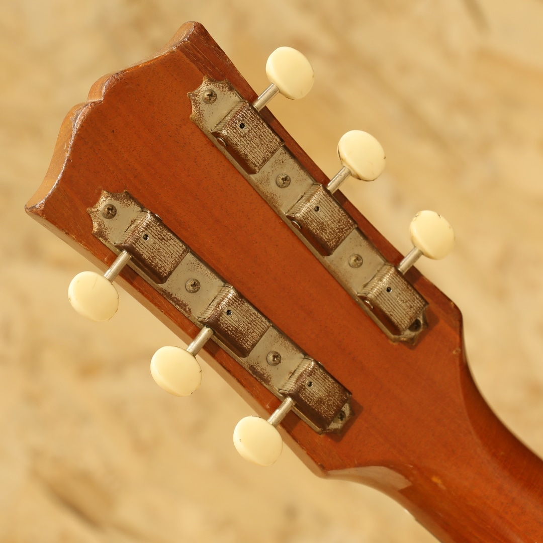 J-45のナチュラルカラーバージョンとして発売開始されたロングセラーモデル。ワーキングホースの名で親しまれてきた"J-50"。1960年製Vintage品。スプルーストップ、マホガニーサイド&バック、マホガニーネック、ハカランダ指板&ブリッジ、ノーマルスロットサドル、オリジナル塗り込みラージピックガード、シングルリングロゼッタ、オリジナル3連クルーソン1ラインペグ、ノンスキャロップドXブレイシング。1956年からオプションにてADJサドルが登場し、1961年頃から標準仕様となりましたが本器はその直前期のノーマルスロット仕様。1960年になるとグリップは薄く現代的な印象になりますが、本器は59年の肉厚感を残した個体。握り込んだ際の握り応えやフィット感、太いサウンドから非常に人気の高いグリップ形状です。ノンスキャロップブレイシングらしい骨太なサウンドや芯の強さ、ノーマルスロットらしいダイレクトな手ごたえや音の厚みなど過渡期である故の魅力を持っています。ドライブ感のあるサウンド、やや重さのある響き、中域の美味しいところを存分に出してくれるのは嬉しいところ。ヴィンテージ品でよく見られるピックガードクラックがボディトップ1弦側くびれ付近や指板1弦側横に見られますが、これは致し方ないものと言えるでしょう。両者とも補修が施されており、使用上問題ない状態に整えられています。その他には1弦側サウンドホール縁の削れ、ネックの6弦側指板サイドに塗装剥がれや細やかな当てキズ、全体的なラッカーチェック等見られますが60年ほど経過したことを感じさせないコンディションをキープされている本器。演奏面も現代的な演奏性に整えられ、この時期のファットなサウンドを存分に楽しめるプレイコンディションをキープされた大変良好な1本です。ガランとしたヴィンテージギブソンならではの響きを小気味よく堪能できるJ50です。