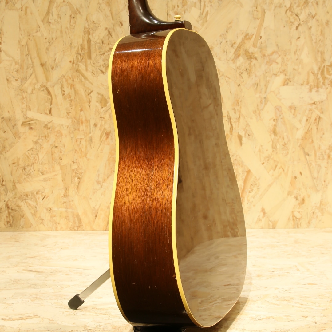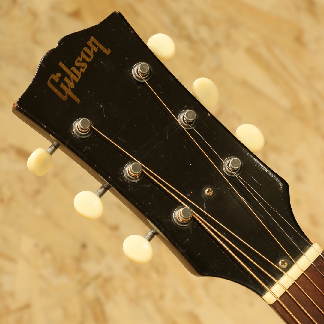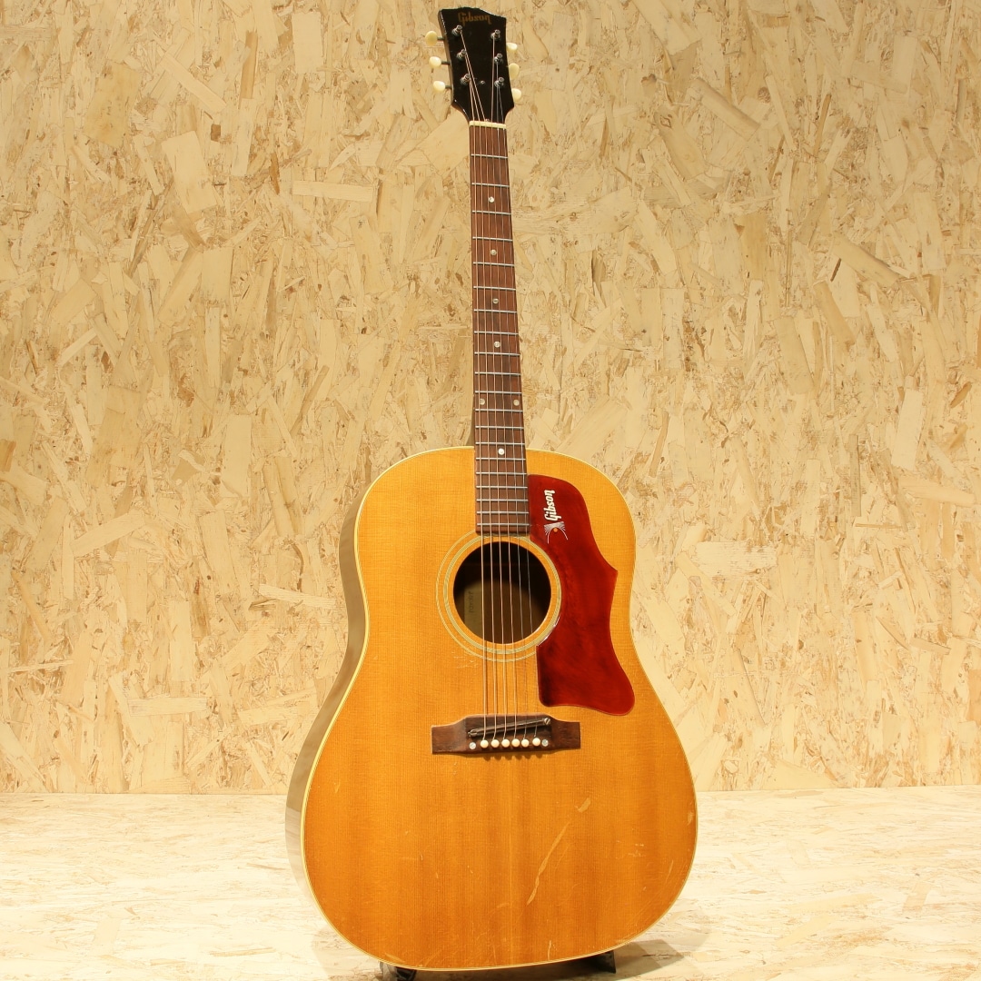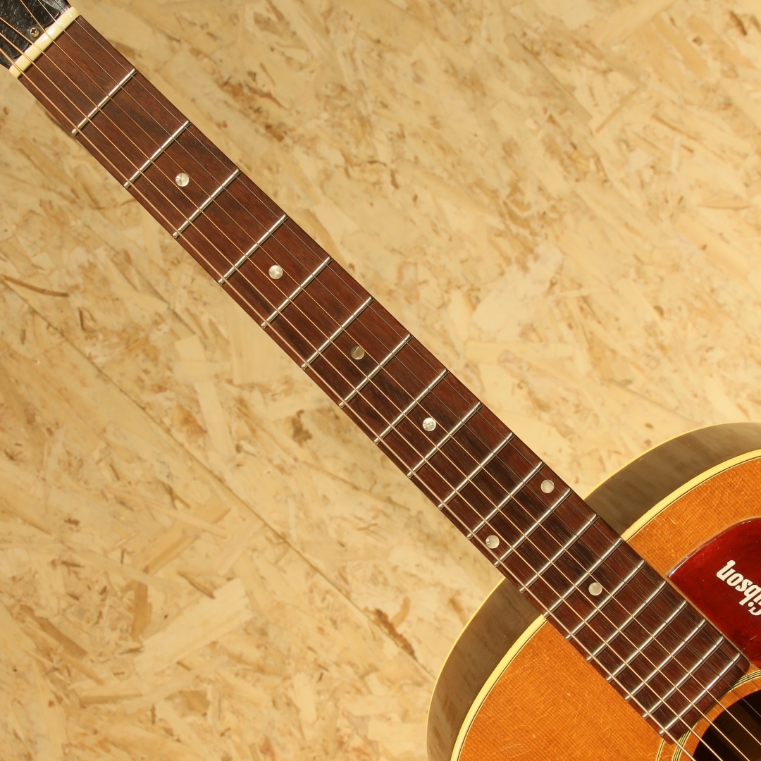 1947年にJ-45のカラーバリエーションモデルとして登場した定番のギター。数々の著名なアーティストが名盤を残してきた傑作です。本器は1968年製、この年代のみ見られる人気のホットスタンプロゴ入りピックガードがマウントされています。1965年中期より1969年後期まで採用されるナローネック、14度ヘッド角スペックの個体。ストロークでは軽快でタイトなキレキレのサウンドとフィンガリングでは独特の味わいを持ったノスタルジックで素朴なサウンドを持ち合わせる事から特に歌モノをメインとするアーティストとの相性が抜群で第一線で活躍するアーティストも数多く愛用するアイテムです。スプルーストップ、マホガニーサイド&バック、マホガニーネック、ハカランダ指板、ハカランダブリッジ、アジャスタブルサドル、チューナーはオリジナルよりエイジングされた新しいものに交換、オリジナルホットスタンプロゴ入りベッコウ柄セルロイドピックガード、ダブルリングロゼッタ、ノンスキャロップド・エックスブレイシング。ナット幅約40ミリ、ヘッド角14度の一台となります。このスペックのギブソンギターは押し弦感がしなやかで、ネックもエレキユーザや女性にも塩梅の良い極細の形です。ブリッジピンは牛骨ピンに交換、消耗パーツ部分は交換されています。ネックヒール部にストラップピンマウント。ヘッド裏に2(セカンド)スタンプ、トップ正面に割れではないやや大きめの傷、バック両端に2か所マイナークラックのタッチアップ跡、バックに薄く違和感の無いオーバースプレーと経年を踏まえて想定内の小キズはありますがしっかりと修正されており安心です。ネックも比較的ストレートで良い状態をキープしており、演奏面も安心。エンドピン部分はジャックサイズに拡張、ダミージャックがエンドピン替わりにマウントされています。ある程度の手入れを加味したプライスながら、実践的に使用する方には願ったり叶ったりでしょう。汎用ハードケース付属。その他の詳細もお気軽にお問い合わせ下さい。