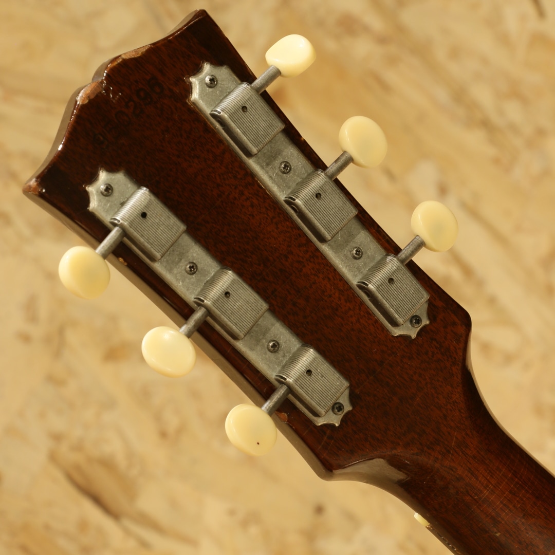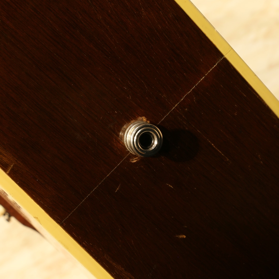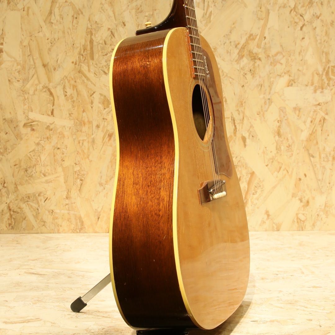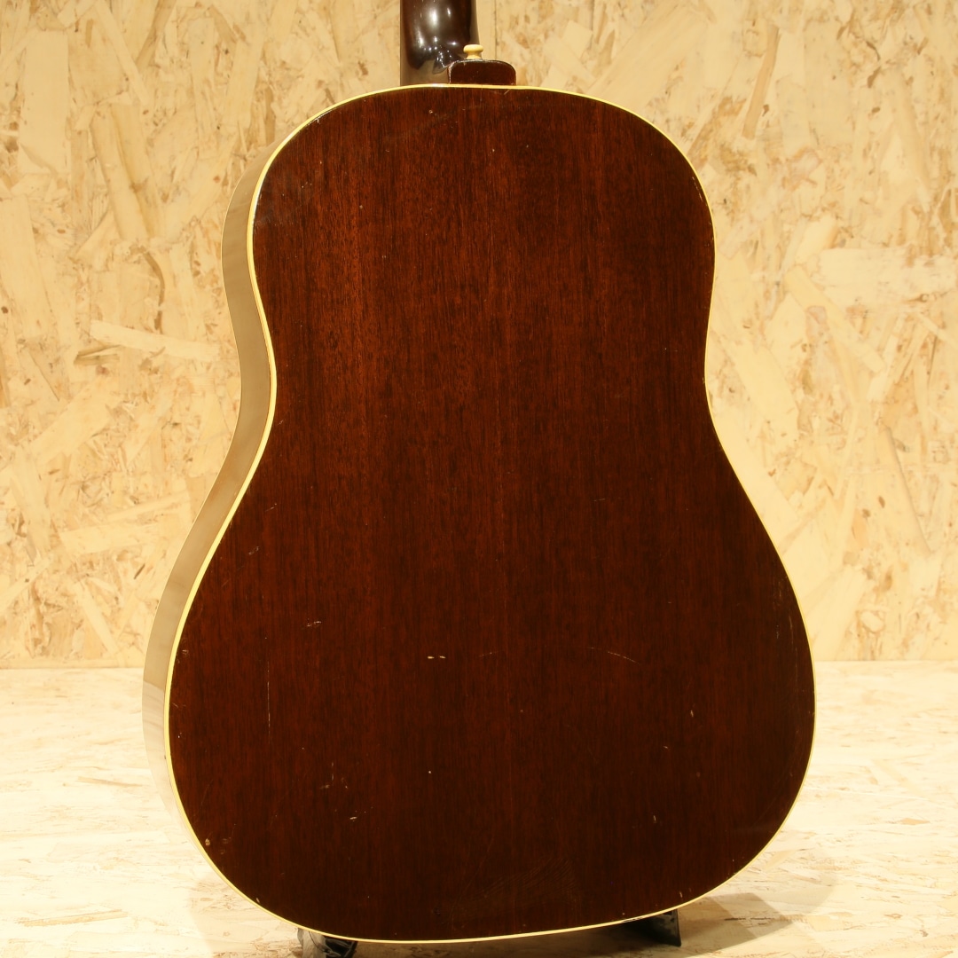 1947年にJ-45のカラーバリエーションモデルとして登場した定番のギター。数々の著名なアーティストが名盤を残してきた傑作です。本器は1968年製、この年代のみ見られる人気のホットスタンプロゴ入りピックガードがマウントされています。1965年中期より1969年後期まで採用されるナローネック、14度ヘッド角スペックの個体。ストロークでは軽快でタイトなキレキレのサウンドとフィンガリングでは独特の味わいを持ったノスタルジックで素朴なサウンドを持ち合わせる事から特に歌モノをメインとするアーティストとの相性が抜群で第一線で活躍するアーティストも数多く愛用するアイテムです。スプルーストップ、マホガニーサイド&バック、マホガニーネック、ハカランダ指板、ハカランダブリッジ、アジャスタブルサドル、チューナーはオリジナルよりエイジングされた新しいものに交換、オリジナルホットスタンプロゴ入りベッコウ柄セルロイドピックガード、ダブルリングロゼッタ、ノンスキャロップド・エックスブレイシング。ナット幅約40ミリ、ヘッド角14度の一台となります。このスペックのギブソンギターは押し弦感がしなやかで、ネックもエレキユーザや女性にも塩梅の良い極細の形です。ブリッジピンは牛骨ピンに交換、消耗パーツ部分は交換されています。ネックヒール部にストラップピンマウント。ヘッド裏に2(セカンド)スタンプ、トップ正面に割れではないやや大きめの傷、バック両端に2か所マイナークラックのタッチアップ跡、バックに薄く違和感の無いオーバースプレーと経年を踏まえて想定内の小キズはありますがしっかりと修正されており安心です。ネックも比較的ストレートで良い状態をキープしており、演奏面も安心。エンドピン部分はジャックサイズに拡張、ダミージャックがエンドピン替わりにマウントされています。ある程度の手入れを加味したプライスながら、実践的に使用する方には願ったり叶ったりでしょう。汎用ハードケース付属。その他の詳細もお気軽にお問い合わせ下さい。