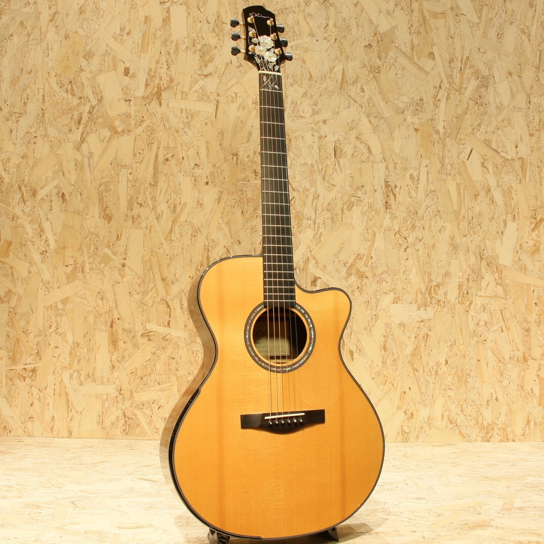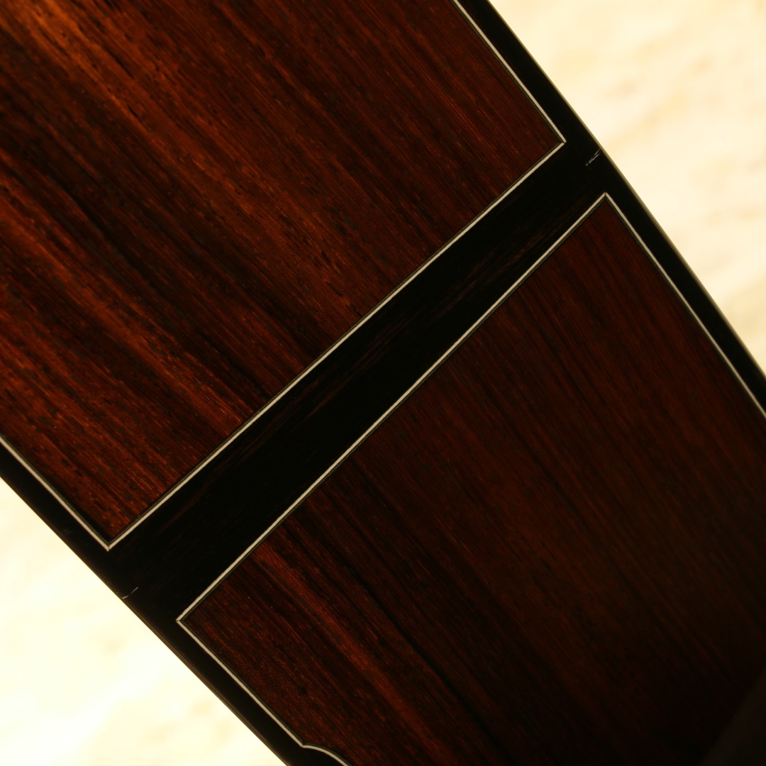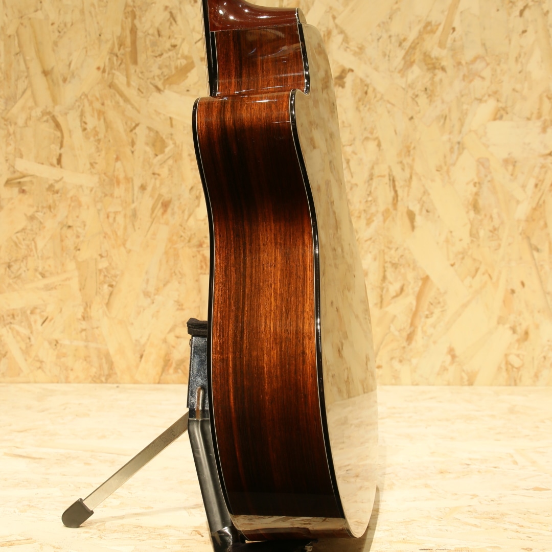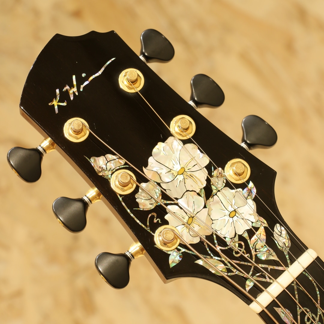 ロサンゼルス近郊に工房を開く女性ルシアー"Kathy Wingert(キャシー・ウィンガート)"。スタイルを選ばない16インチ幅グランドオーディトリアムタイプの一本です。ヨーロピアンスプルーストップ、柾目マダガスカルローズウッドサイド&バック、最高級の材料です。エボニー指板&ブリッジ、ゴトー510ペグ、透明ピックガード、アバロンロゼッタ、コンターベベル入りエボニーバインディング、ベネチアンカッタウェイ、側板ダブルレイヤー、オリジナルスキャロップブレイシング、"THE ROSE"アバロンインレイ。取り扱いディーラーは世界でも米国に一店舗しかありませんので日本国内で彼女の作ったギターに触れられる機会も稀なのですが、アメリカのギターショウでは常連のベテラン製作家。出来の良い楽器に共通する目立つところの少ない、静かでエレガントな音色。わざとらしさがまったく無く、とても自然です。音場感が広く見晴らしの良いウッディなトーン。曇りのない締まった低音、スムースな中音、鮮明な高音。右手のタッチに対して表情豊かに立ち上がり、この上ないバランス感で極上のカルフォルニアルシアーサウンドとも言うべき豊潤な響きを体いっぱいに楽しんでいただけそうです。愛娘のジミーさんが一貫して施すインレイワークの緻密さも魅力のひとつ(色とりどりの貝が使われています)。ネックと指板を繋ぐラインを帯びた塗装引け、ブリッジ縁サウンドホール側にブリッジに押されてほんの僅か塗装の剥離、写真にうつりにくいレベルの細かい擦り傷などは見られますが使用感の薄い、大変綺麗なコンディションをキープ。ネックもストレートでやや低めの弦高セットアップ、とても弾きやすい状態をキープしています。キャシーウィンガードのギターも年々高騰を見せています。大変貴重なUSEDアイテム。HOFFEE製高級ハードケース付属。ぜひお見逃しなく。