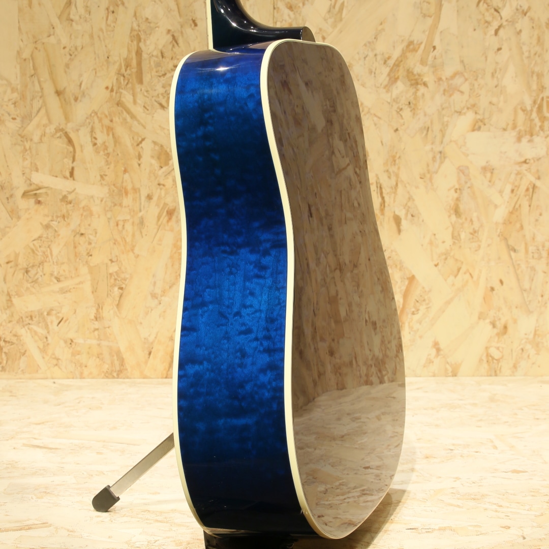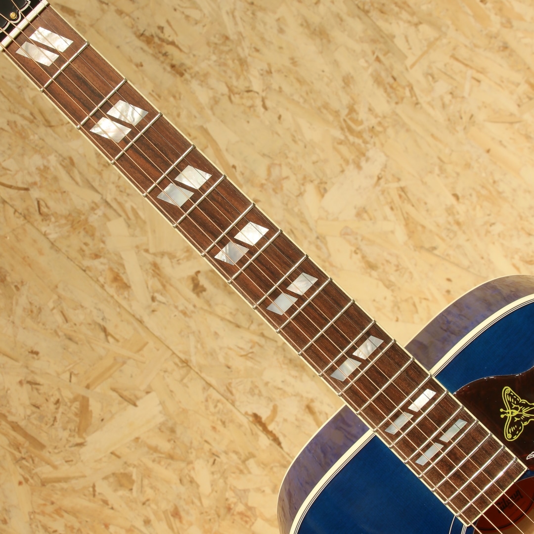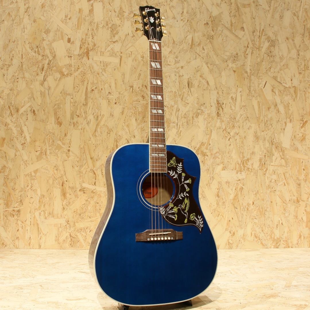 1960年の発売以来、ギブソンスクエアショルダーボディの定番モデルとして人気を博しているハミングバード。ハチドリを象ったピックガードを始め個性的なルックスを持ったモデルです。本器はギブソンファクトリーツアー買い付け品、”Hummingbird Quilt Viper Blue”。シトカスプルーストップ、キルトメイプルサイド&バック、マホガニーネック、ローズウッド指板&ブリッジ、ダブルパラレログラムパール指板インレイ、オリジナルピックガード、グローバーキーストーンゴールドペグ、バイパーブルーカラーフィニッシュ、L.R Baggs Element VTC搭載。今回GIBSONファクトリーツアーにて弊社スタッフが選定した本器。通常のスタンダードから材の変更、ペグ形状の変更、カラーの変更が行われた1本です。ギブソンスクエアショルダーの代表的な機種として挙げられることも多いハミングバード。丸みを帯びた演奏性の高いラウンドネックシェイプ、パールのダブルパラレログラムインレイやクラウンインレイにピックガードなどの個性的なルックスが光るモデルです。更にキルトメイプルによる華やかさ、バイパーブルーカラーによるシースルーな風合いで杢目が際立つ外観に仕上がりました。カラーのおかげでキルトの杢目が波のようにも見え、水面のような深海のような自然の美しさを感じさせる幻想的なルックス。詩や歌を紡ぐのにこんなにロマンチックで似合うギターも多くないでしょう。スクエアショルダーらしくやや広がりのあるエアリーな響き、通常のマホガニーと異なりメイプルが持つ厚みのあるサウンドやクリアな響きは他の同モデルにはない特徴です。甘さが増しメロウなトーンでの表現、かと思えば明朗とした快活なサウンド、そこに反してややダークな響きと演奏のタッチに応じて様々な顔を覗かせる演技派。表現幅の広さから使用用途の多いハミングバードと言えるでしょう。ピックアップにはL.R Baggs Element VTCを搭載。アンダーサドルで音の芯を拾い、柔らかさのある低音から伸びやかな高音域まで幅広くピックアップ。コントローラーもボリューム、トーンのみと非常にシンプルな構成でセッティングに迷うことも少ないです。ライブや宅録、配信まで対応できる即戦力の1本。伝統的なモデルハミングバードの現代仕様、且つカスタムが施された特別版。元々シンガーソングライターの為に生まれたと言われるハミングバード、新たなインスピレーションへと誘ってくれるポテンシャルを持っています。新たな歌を紡ぐ相棒として、是非お手元にいかがでしょうか。