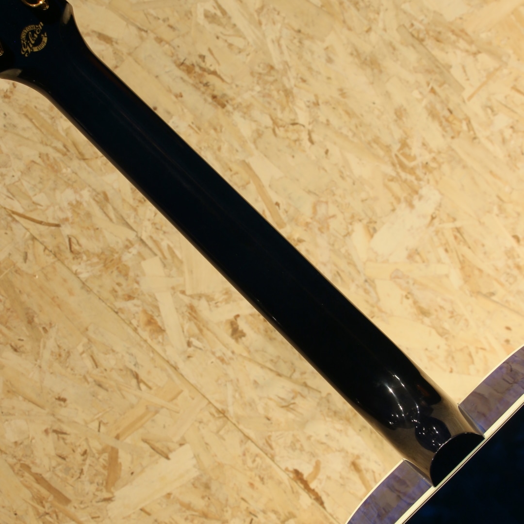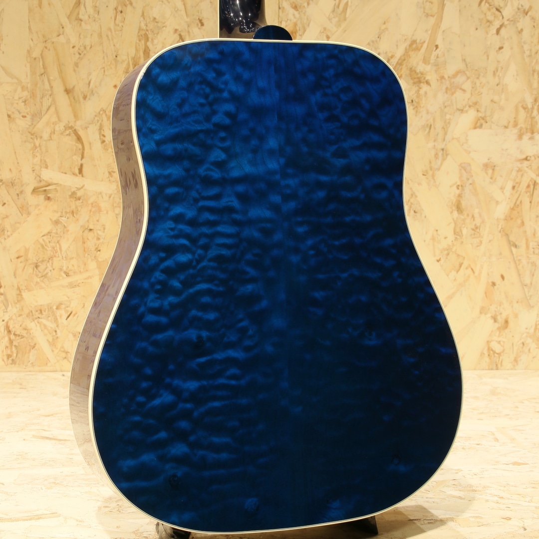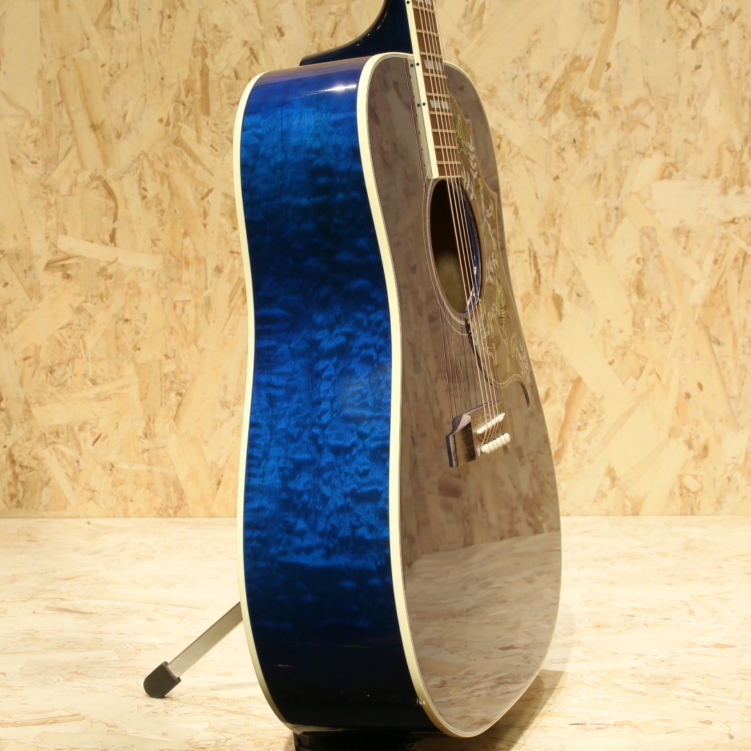 1960年の発売以来、ギブソンスクエアショルダーボディの定番モデルとして人気を博しているハミングバード。ハチドリを象ったピックガードを始め個性的なルックスを持ったモデルです。本器はギブソンファクトリーツアー買い付け品、”Hummingbird Quilt Viper Blue”。シトカスプルーストップ、キルトメイプルサイド&バック、マホガニーネック、ローズウッド指板&ブリッジ、ダブルパラレログラムパール指板インレイ、オリジナルピックガード、グローバーキーストーンゴールドペグ、バイパーブルーカラーフィニッシュ、L.R Baggs Element VTC搭載。今回GIBSONファクトリーツアーにて弊社スタッフが選定した本器。通常のスタンダードから材の変更、ペグ形状の変更、カラーの変更が行われた1本です。ギブソンスクエアショルダーの代表的な機種として挙げられることも多いハミングバード。丸みを帯びた演奏性の高いラウンドネックシェイプ、パールのダブルパラレログラムインレイやクラウンインレイにピックガードなどの個性的なルックスが光るモデルです。更にキルトメイプルによる華やかさ、バイパーブルーカラーによるシースルーな風合いで杢目が際立つ外観に仕上がりました。カラーのおかげでキルトの杢目が波のようにも見え、水面のような深海のような自然の美しさを感じさせる幻想的なルックス。詩や歌を紡ぐのにこんなにロマンチックで似合うギターも多くないでしょう。スクエアショルダーらしくやや広がりのあるエアリーな響き、通常のマホガニーと異なりメイプルが持つ厚みのあるサウンドやクリアな響きは他の同モデルにはない特徴です。甘さが増しメロウなトーンでの表現、かと思えば明朗とした快活なサウンド、そこに反してややダークな響きと演奏のタッチに応じて様々な顔を覗かせる演技派。表現幅の広さから使用用途の多いハミングバードと言えるでしょう。ピックアップにはL.R Baggs Element VTCを搭載。アンダーサドルで音の芯を拾い、柔らかさのある低音から伸びやかな高音域まで幅広くピックアップ。コントローラーもボリューム、トーンのみと非常にシンプルな構成でセッティングに迷うことも少ないです。ライブや宅録、配信まで対応できる即戦力の1本。伝統的なモデルハミングバードの現代仕様、且つカスタムが施された特別版。元々シンガーソングライターの為に生まれたと言われるハミングバード、新たなインスピレーションへと誘ってくれるポテンシャルを持っています。新たな歌を紡ぐ相棒として、是非お手元にいかがでしょうか。