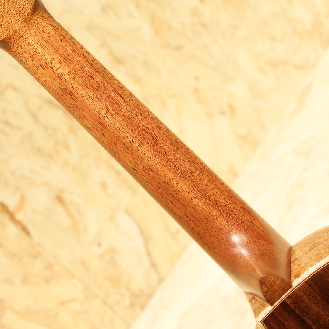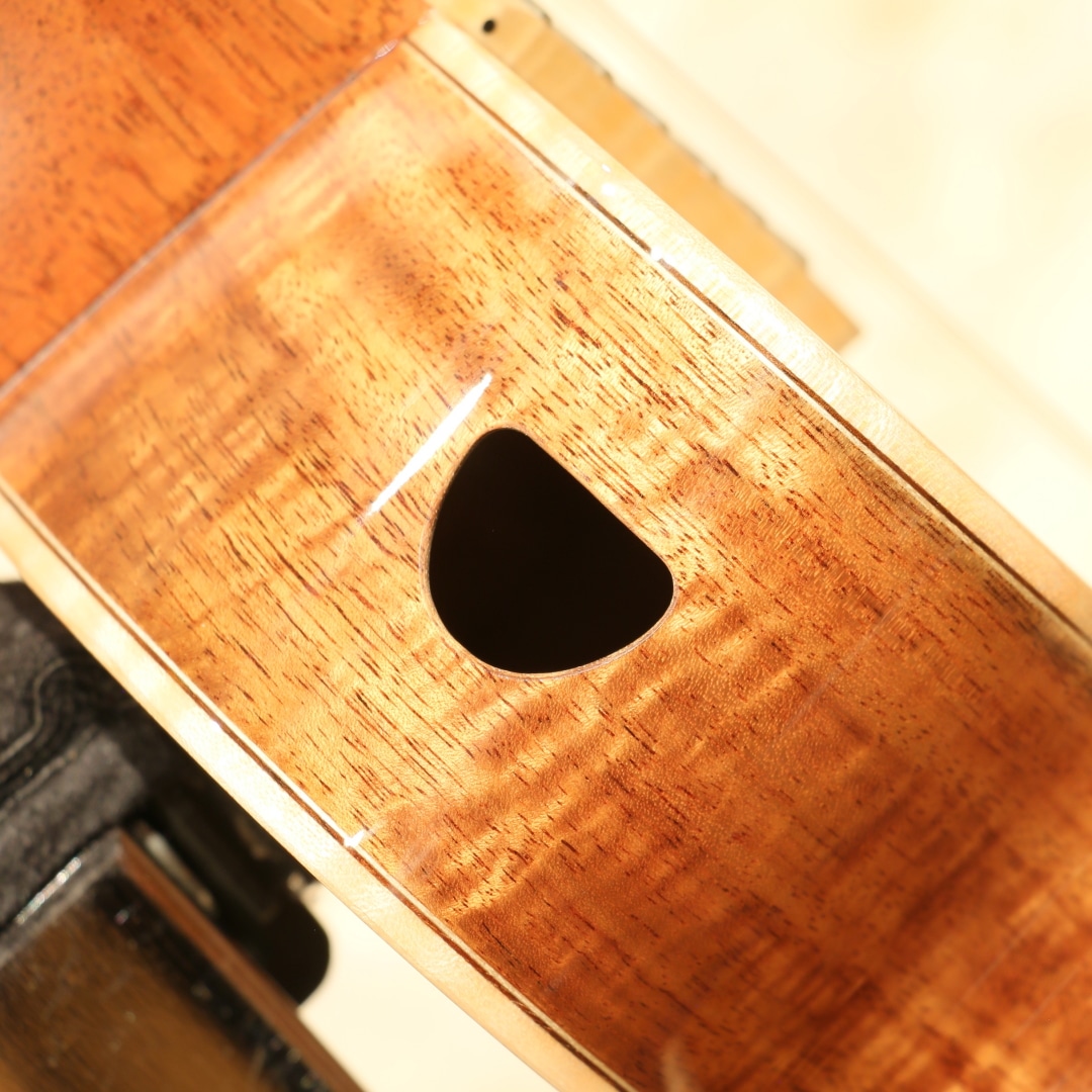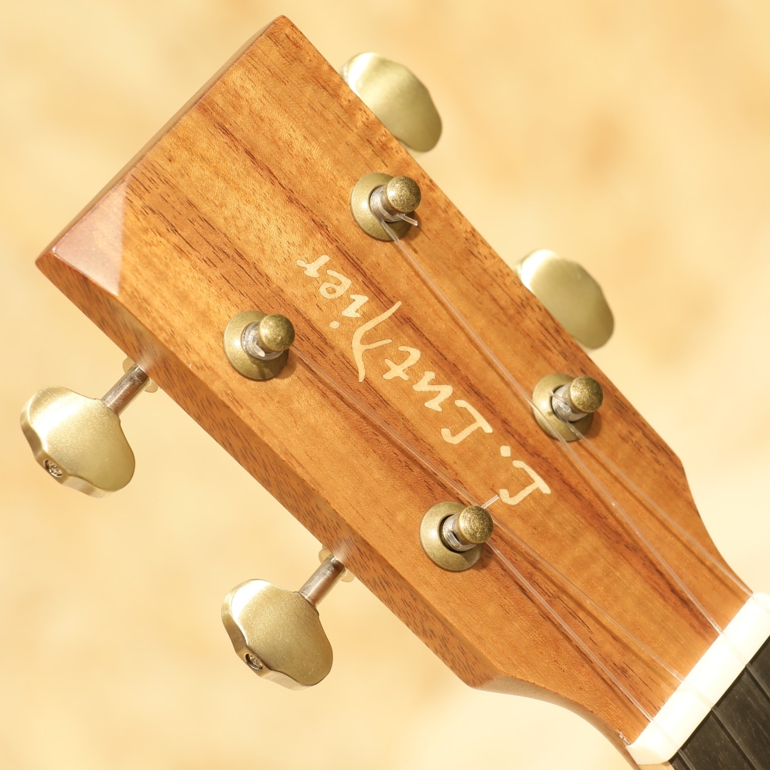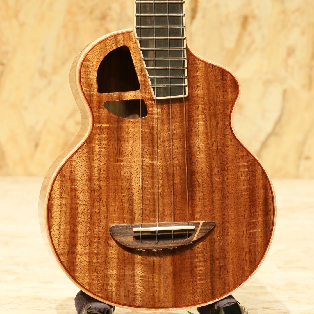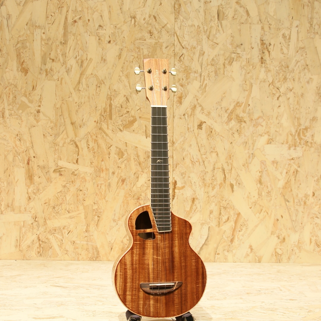 L.Luthierは2009年マレーシアの創業者Adwin Lai(アドウィン・ライ)によって生まれた新進気鋭のアジアンギターブランド。10代でギターと作曲を始め、大学ではギターと声楽を専門に勉強、実際にシングルをリリースするなどミュージシャンとしての知識を持ち合わせており、独自の考察から生み出される楽器達は内部の構造のみならず、オリジナリティー溢れるデザインにも反映されています。本器はオールコアボディーを採用したソプラノロングネック仕様のウクレレ、”Le Mini Koa”。ギターのLEシリーズ同様、トップ低音側上部に配置された独自のサウンドホールとサイド側にマウントされたサウンドポートはパフォーマンス中に高い感度を実現。演奏者自身が聞くサウンドと聴衆へ届けるサウンドをセパレートしモニタリングすることを考えている所が特徴です。オールコアボディー、マホガニーネック、エボニー指板、ローズウッドメイプルラインデザイン入りのブリッジ、オープンゴールドギヤペグ、緩やかにラウンドされたベネチアンカッタウェイ、バインディングセルは杢入りのメイプルにカラー、レッドカラーに着色されたウッドライントリムがアクセントになっており、モダンなデザインのアクセントになっています。これまでテナーサイズとコンサートサイズのみのラインナップでしたが、今回新たにソプラノサイズが仲間入りしました。ソプラノサイズですがロングネック仕様とすることで張りのある響きを奏でてくれます。ソプラノサイズとは思えないほどのボリューム感、やや広めのレンジ感を持っており扱いやすいウクレレです。コアらしく艶やかで甘いサウンドを響かせてくれます。同じサイズでも芯のあるパワフルな響き、立ち上がりが早いというのもジャンルを選ばないポテンシャルを持った優秀な1本。小柄で抱えやすく運びやすいというのも大きな魅力です。ワンランク上のコストパフォーマンス抜群の1本、ぜひお試しください。