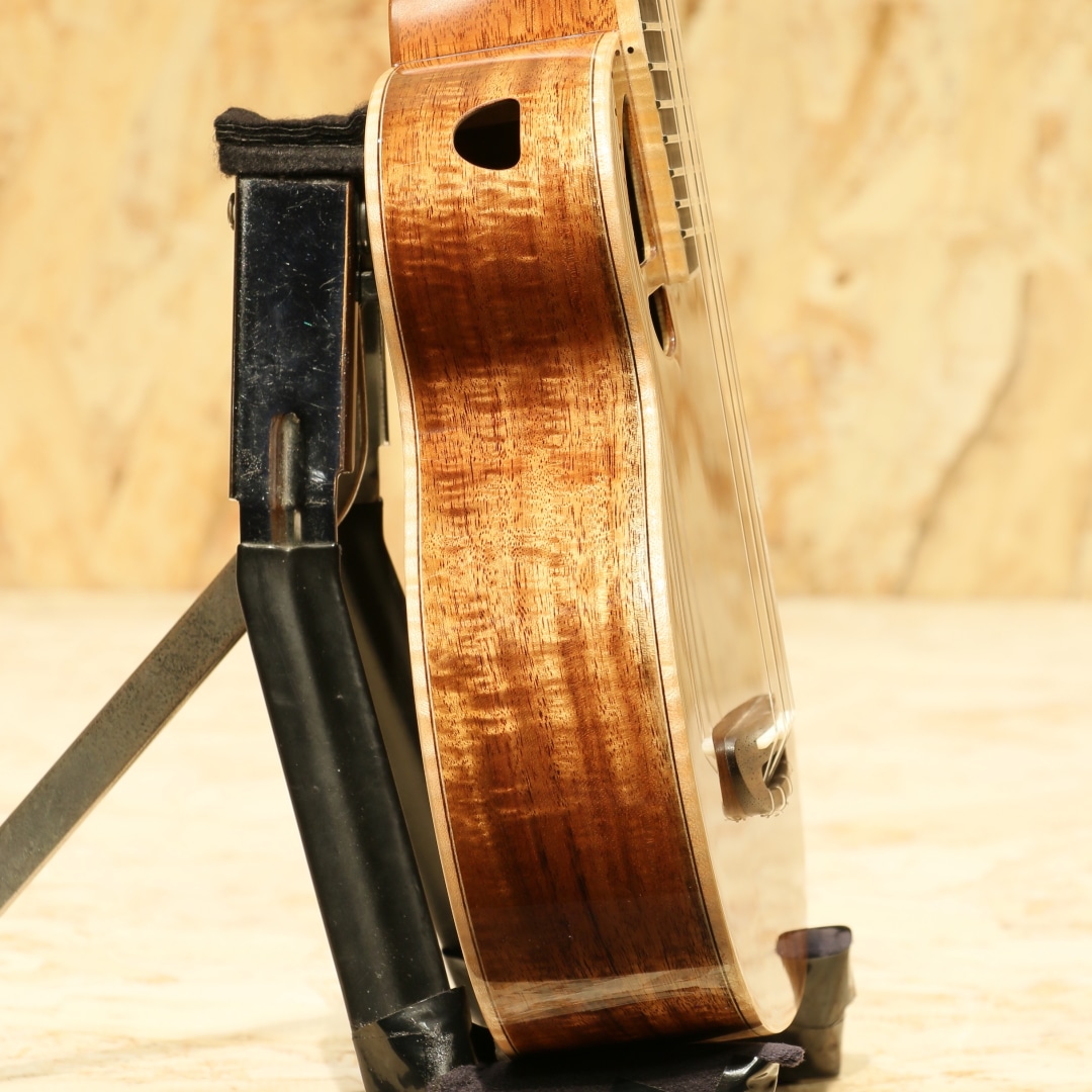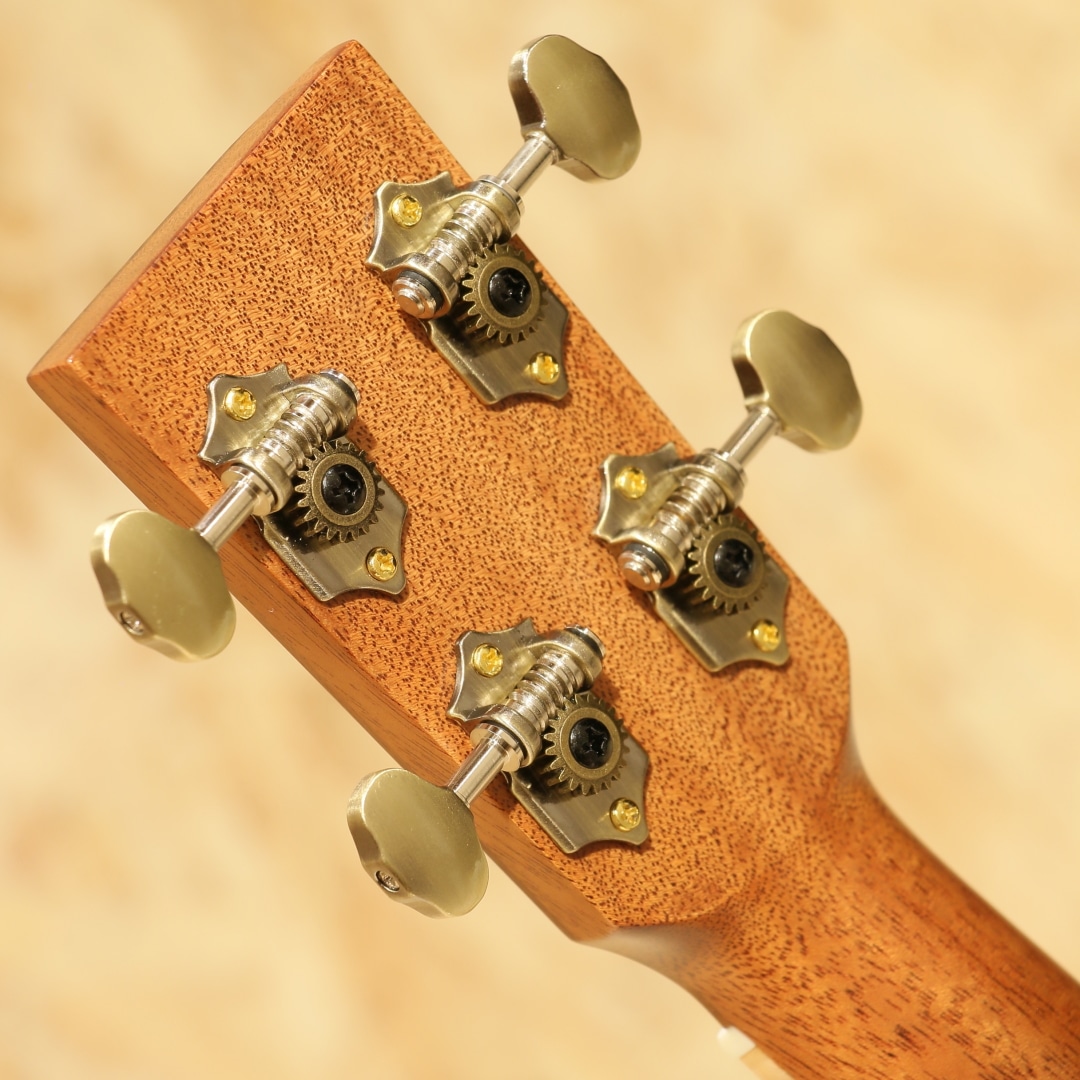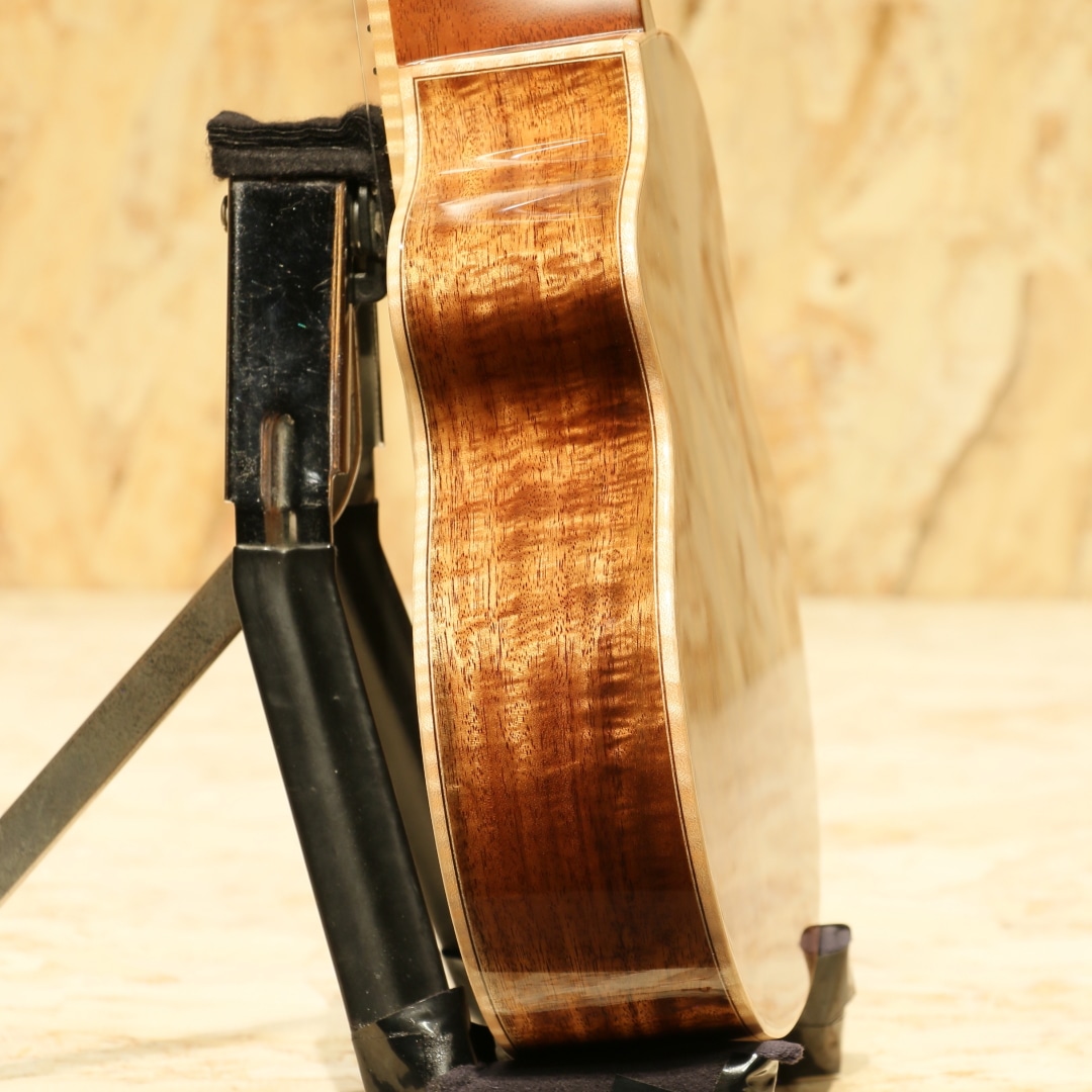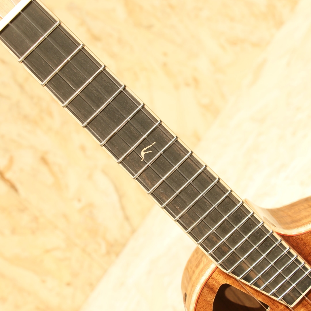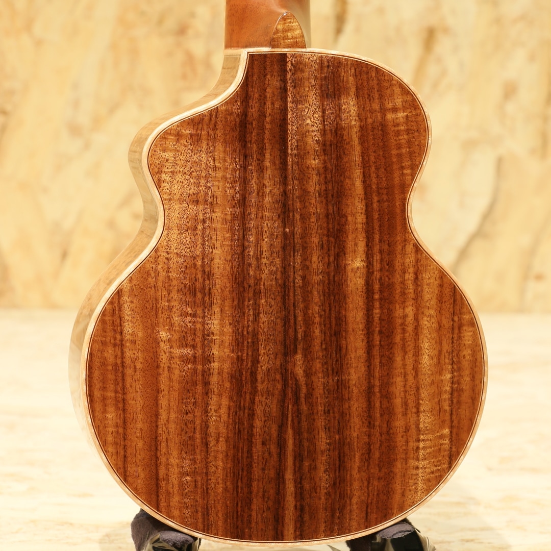 L.Luthierは2009年マレーシアの創業者Adwin Lai(アドウィン・ライ)によって生まれた新進気鋭のアジアンギターブランド。10代でギターと作曲を始め、大学ではギターと声楽を専門に勉強、実際にシングルをリリースするなどミュージシャンとしての知識を持ち合わせており、独自の考察から生み出される楽器達は内部の構造のみならず、オリジナリティー溢れるデザインにも反映されています。本器はオールコアボディーを採用したソプラノロングネック仕様のウクレレ、”Le Mini Koa”。ギターのLEシリーズ同様、トップ低音側上部に配置された独自のサウンドホールとサイド側にマウントされたサウンドポートはパフォーマンス中に高い感度を実現。演奏者自身が聞くサウンドと聴衆へ届けるサウンドをセパレートしモニタリングすることを考えている所が特徴です。オールコアボディー、マホガニーネック、エボニー指板、ローズウッドメイプルラインデザイン入りのブリッジ、オープンゴールドギヤペグ、緩やかにラウンドされたベネチアンカッタウェイ、バインディングセルは杢入りのメイプルにカラー、レッドカラーに着色されたウッドライントリムがアクセントになっており、モダンなデザインのアクセントになっています。これまでテナーサイズとコンサートサイズのみのラインナップでしたが、今回新たにソプラノサイズが仲間入りしました。ソプラノサイズですがロングネック仕様とすることで張りのある響きを奏でてくれます。ソプラノサイズとは思えないほどのボリューム感、やや広めのレンジ感を持っており扱いやすいウクレレです。コアらしく艶やかで甘いサウンドを響かせてくれます。同じサイズでも芯のあるパワフルな響き、立ち上がりが早いというのもジャンルを選ばないポテンシャルを持った優秀な1本。小柄で抱えやすく運びやすいというのも大きな魅力です。ワンランク上のコストパフォーマンス抜群の1本、ぜひお試しください。