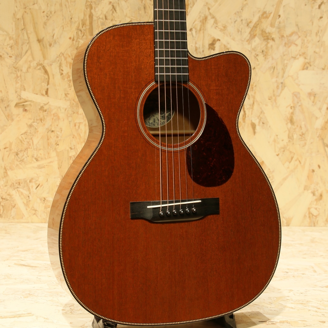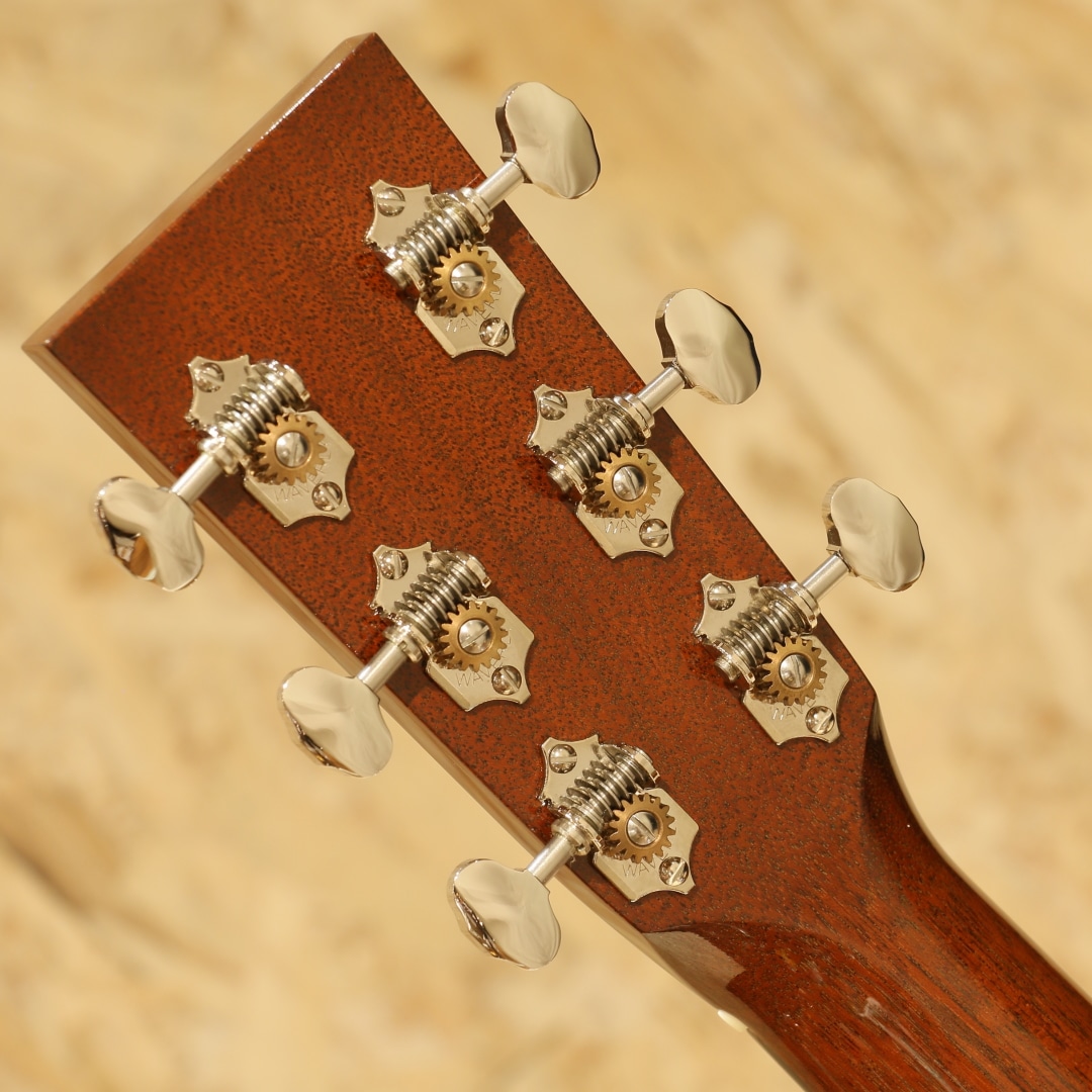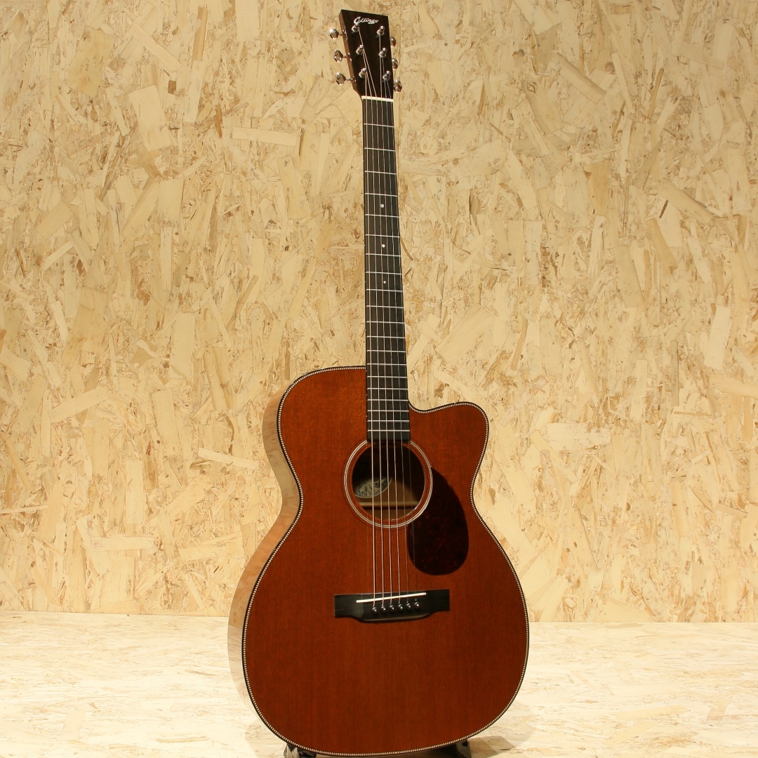 戦前トラディショナルスタイルを軸に独自のアイデンティティを確立した世界的にもっとも高い評価を得ているブランドの一つであるコリングスギター。他を凌駕したその完成度の高さ故、評価は同業製作家や一級のプロアーティスト、プレイヤーなど目が高い層に特に一目置かれた存在です。プレイヤーの憧れのブランドと言えます。本器はとりわけコリングスが得意とするマーチンOMスタイル、オールマホガニーカッタウェイ仕様”OM1H Mh Cutaway Herringborn”。2018年製USED品。ホンジュラスマホガニーボディ、ホンジュラスマホガニーネック、エボニー指板&ブリッジ、ロングサドル、トートイズ柄ボディーバインディング、ヘリンボーントリム、スモールトートイズ柄ピックガード、MOPドット指板ポジション、ウェーバリー製オープンペグ、プリウォースタイルのオリジナルアドバンスドスキャロップドXブレイシング。OMオールマホガニーという渋いチョイス、そこにカッタウェイを付けてモダンな演奏性をミックスしたハイセンスな1本。ヘリンボーンやロングサドルといったトラッドなスタイルをベースとしている点も判っているなと思わざるを得ません。コリングスが体現してきた、プリウォーを踏まえて改善するというスタイルに沿ったギターです。マホガニー自体スプルースよりも硬質な材、その特性からやや音の腰が高くなった中高音にピークを持つ材となります。サイドバックとしてはレンジ感はそこまで広くありませんが、温かみのある中低域や明るい中高域が特徴的。弦の輪郭が出やすくバチっとインパクトのあるサウンドが似合う響きを生み出します。何よりギターとして美味しい中域が充実しているのは、演奏する上で弾きごたえがあると言えるでしょう。オープンなトーン、ドライな音色を響かせてくれる1本です。ネックヒールサイドにウェバリー社のべっ甲柄ストラップピンが装着されています。ピックガードに薄い弾きキズこそみられるものの非常に使用感が少なく、クロスで拭いたような拭きキズが僅か見られる程度の非常にキレイな個体。ネックコンディションもベスト、高い演奏性のポテンシャルを遺憾なく発揮してくれる1本です。トラッドを押さえ、且つモダンな演奏性まで与えられた欲張り仕様。実用度の高いコリングス故に鬼に金棒とも言える贅沢仕様の個体です。是非お手元でご体感下さいませ。