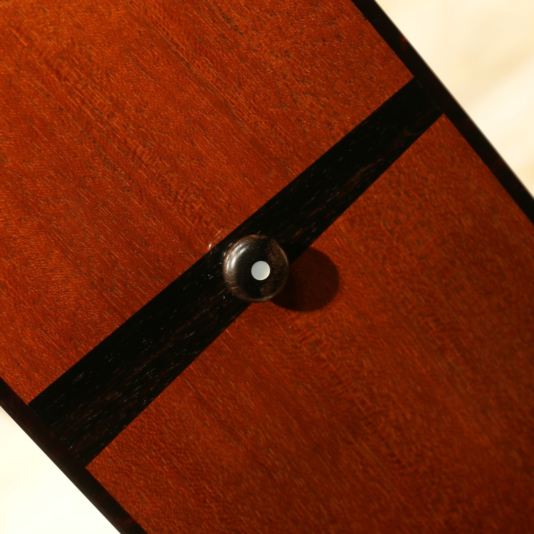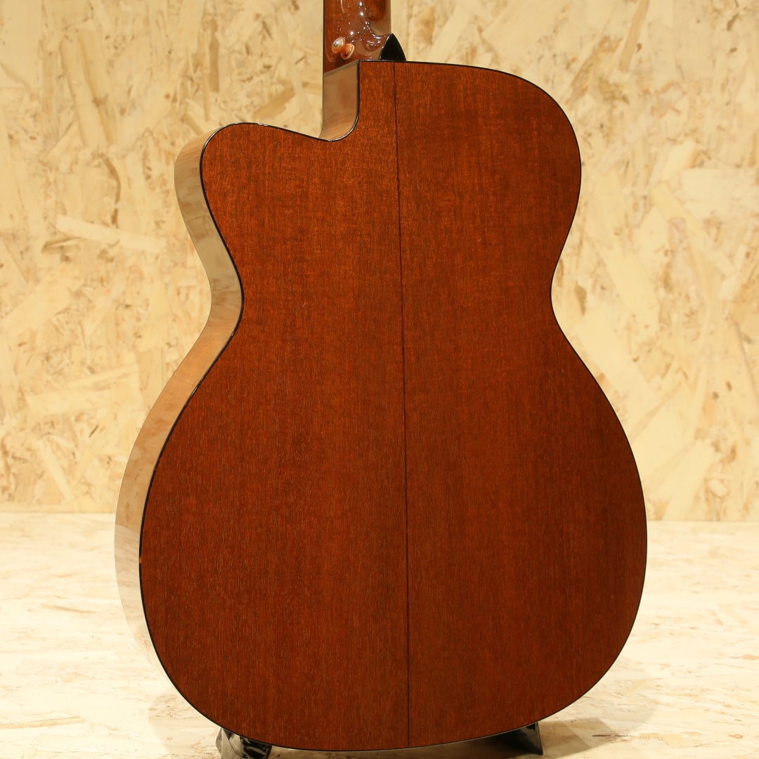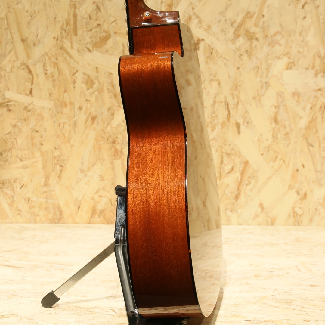 戦前トラディショナルスタイルを軸に独自のアイデンティティを確立した世界的にもっとも高い評価を得ているブランドの一つであるコリングスギター。他を凌駕したその完成度の高さ故、評価は同業製作家や一級のプロアーティスト、プレイヤーなど目が高い層に特に一目置かれた存在です。プレイヤーの憧れのブランドと言えます。本器はとりわけコリングスが得意とするマーチンOMスタイル、オールマホガニーカッタウェイ仕様”OM1H Mh Cutaway Herringborn”。2018年製USED品。ホンジュラスマホガニーボディ、ホンジュラスマホガニーネック、エボニー指板&ブリッジ、ロングサドル、トートイズ柄ボディーバインディング、ヘリンボーントリム、スモールトートイズ柄ピックガード、MOPドット指板ポジション、ウェーバリー製オープンペグ、プリウォースタイルのオリジナルアドバンスドスキャロップドXブレイシング。OMオールマホガニーという渋いチョイス、そこにカッタウェイを付けてモダンな演奏性をミックスしたハイセンスな1本。ヘリンボーンやロングサドルといったトラッドなスタイルをベースとしている点も判っているなと思わざるを得ません。コリングスが体現してきた、プリウォーを踏まえて改善するというスタイルに沿ったギターです。マホガニー自体スプルースよりも硬質な材、その特性からやや音の腰が高くなった中高音にピークを持つ材となります。サイドバックとしてはレンジ感はそこまで広くありませんが、温かみのある中低域や明るい中高域が特徴的。弦の輪郭が出やすくバチっとインパクトのあるサウンドが似合う響きを生み出します。何よりギターとして美味しい中域が充実しているのは、演奏する上で弾きごたえがあると言えるでしょう。オープンなトーン、ドライな音色を響かせてくれる1本です。ネックヒールサイドにウェバリー社のべっ甲柄ストラップピンが装着されています。ピックガードに薄い弾きキズこそみられるものの非常に使用感が少なく、クロスで拭いたような拭きキズが僅か見られる程度の非常にキレイな個体。ネックコンディションもベスト、高い演奏性のポテンシャルを遺憾なく発揮してくれる1本です。トラッドを押さえ、且つモダンな演奏性まで与えられた欲張り仕様。実用度の高いコリングス故に鬼に金棒とも言える贅沢仕様の個体です。是非お手元でご体感下さいませ。