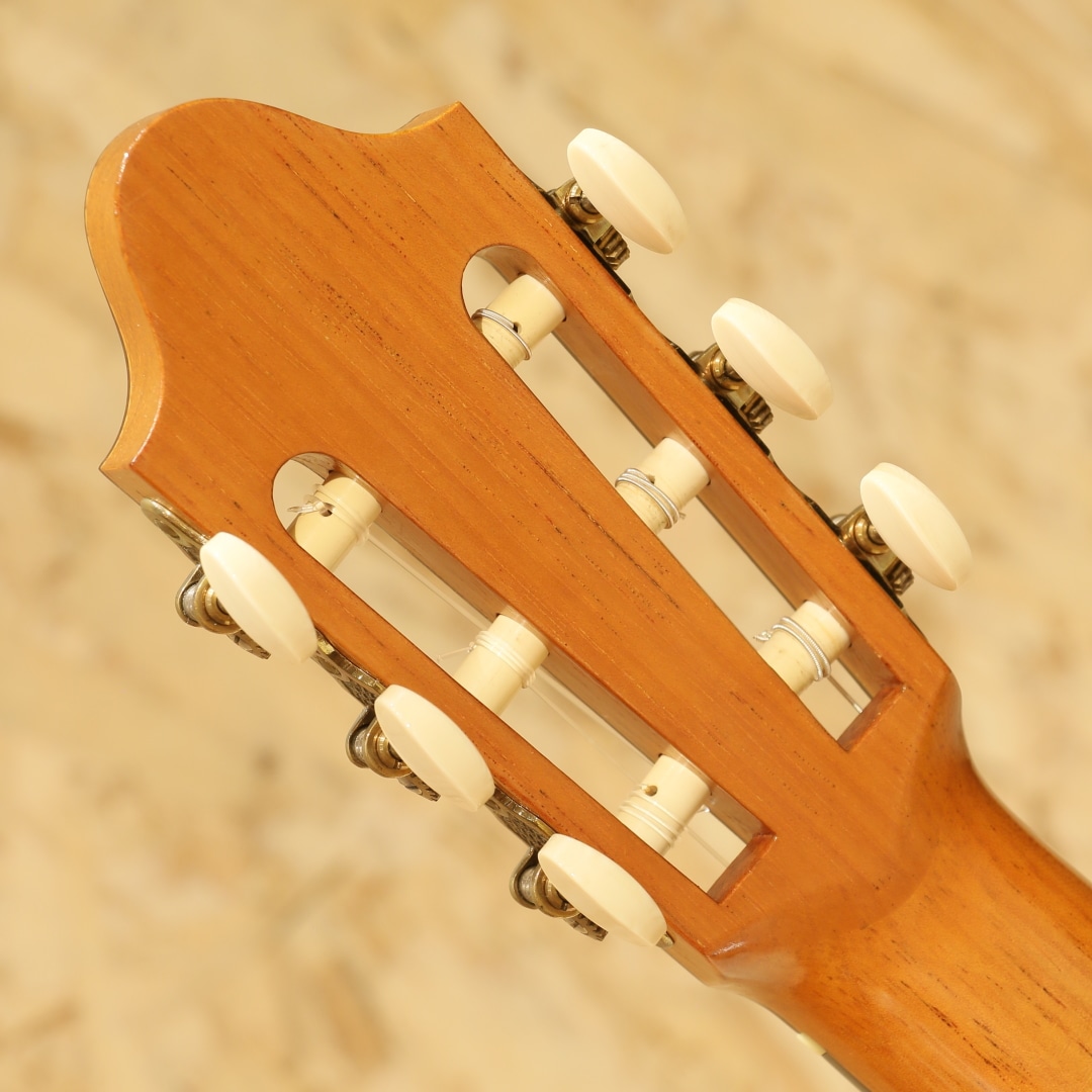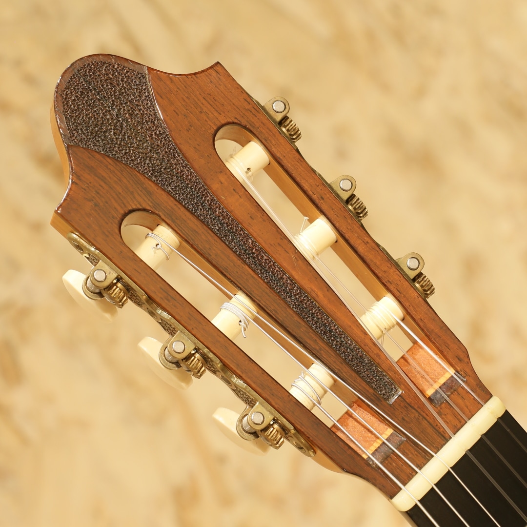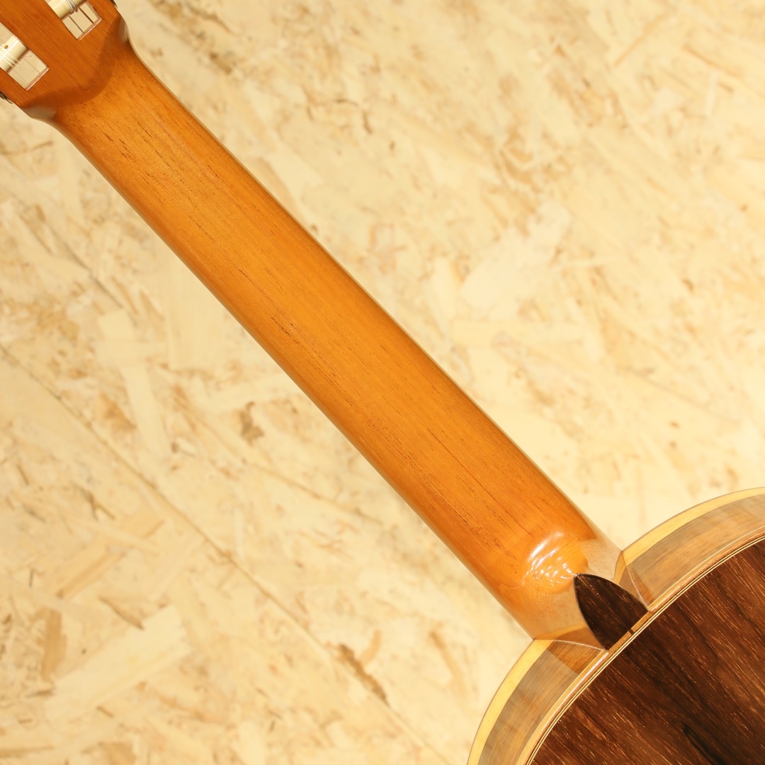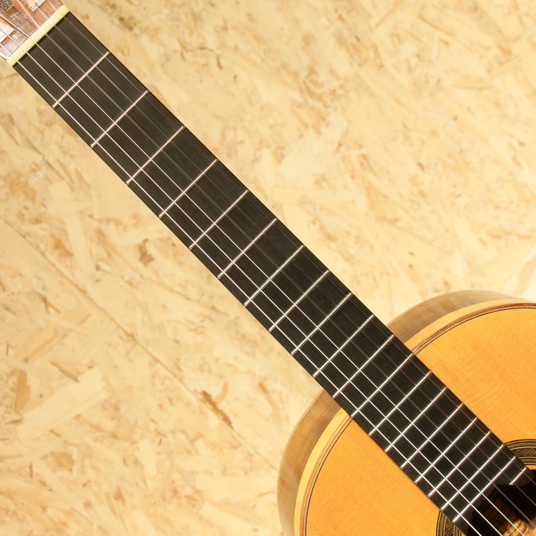 仙台に工房を構える約50年の製作キャリアを持つベテランルシアー"三浦隆志"。1973年札幌にてギター製作を開始、その後スペイン/グラナダにて世界的巨匠、アントニオ・マリン・モンテーロ氏に師事。氏の元でスペインの伝統製法やセラックニス塗装など技術を磨き、帰国後は仙台に工房を設け製作を開始しました。三浦氏の製作するギターは伝統的な手法に加え、独自のブリッジ構造やセラック塗装による仕上げなど革新的な製法を織り交ぜ、多くのギタリストに愛用されています。本器は2012年製の"SJ-1"、630mmスケールにて製作された1本。スプルーストップ、サップの入ったハカランダサイド&バック、シダーネック、エボニー指板、ローズウッドブリッジ、アイボロイドボタンスローンペグ、パイプ式ダブルホールブリッジ、630mmスケール。その名の通り、パイプを弦穴に取り付けた構造。ややサドル側に伸びたパイプからサドルへと延びる弦は通常モデルより角度がつき圧が強い為、余分な振動を抑えダイレクトな弦振動をブリッジを通して伝達します。また、渡欧の際に学んだ伝統的なセラックニス塗装を独自製造による添加剤を調合したセラックにて行い、セラック塗装の難点ともいえる湿気によるベタつきや水分反応による白化現象を抑制します。表面板には一部にハニカムコアを内包。現代音楽に求められる音量や抑揚の幅を得ることが出来るダブルトップ仕様です。(Honeycomb仕様器はハニカムコアがブリッジにモールドされています)630mmスケールにて仕上げられた本器、弱すぎず程良いテンション感は押弦時のストレスを軽減。ショートスケールながら安定した撥音、ハカランダらしい密度の高い艶やかな鳴り。程よくリバーブ感を含んだ奥深く豊潤なサウンド、堅実なトーンは程よいサスティンもありながら直線状に伸びていき、上質な音色を奏でます。サイドのくびれやボトムにうっすらとした擦り傷、ブリッジ下部に弦飛び跡が見られますがさほど目立たず、よく見てわかる程度のものです。演奏性を含めたネックコンディションは非常に良好。やや低めな弦高セッティングで扱いやすいアクションです。中古市場でも出物の少ない製作家の作品。是非、お手元でご体感ください。汎用ハードケースが付属します。