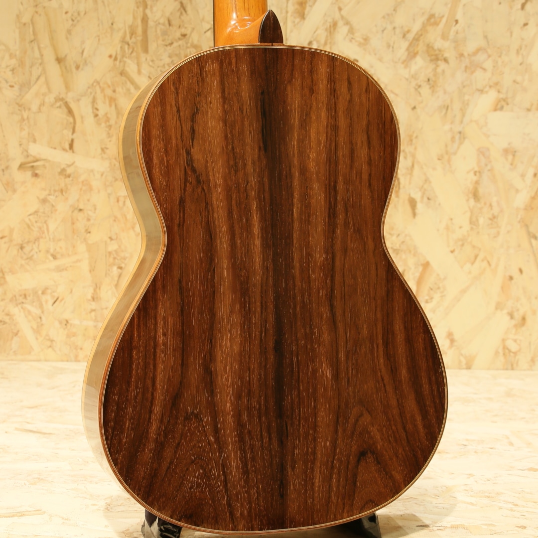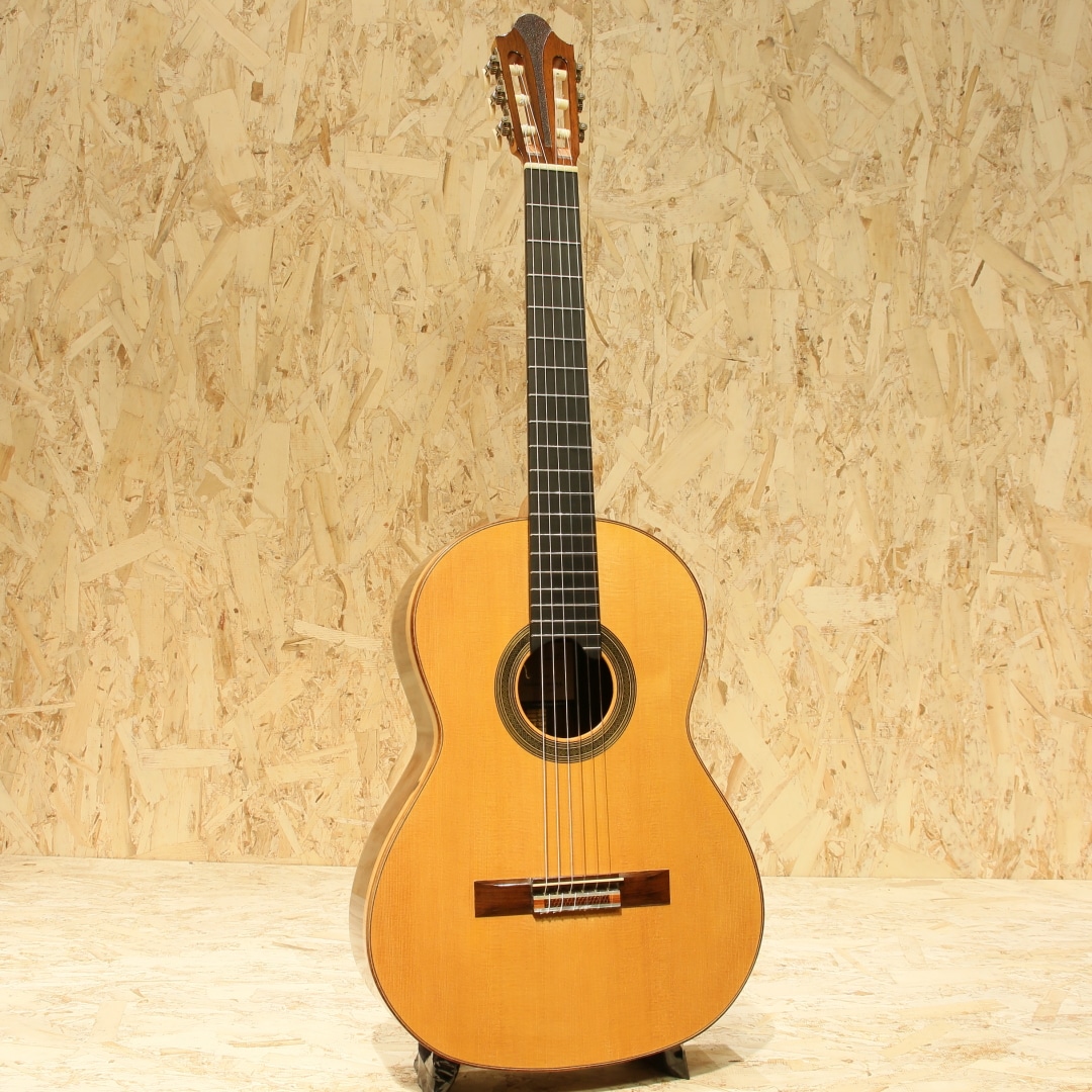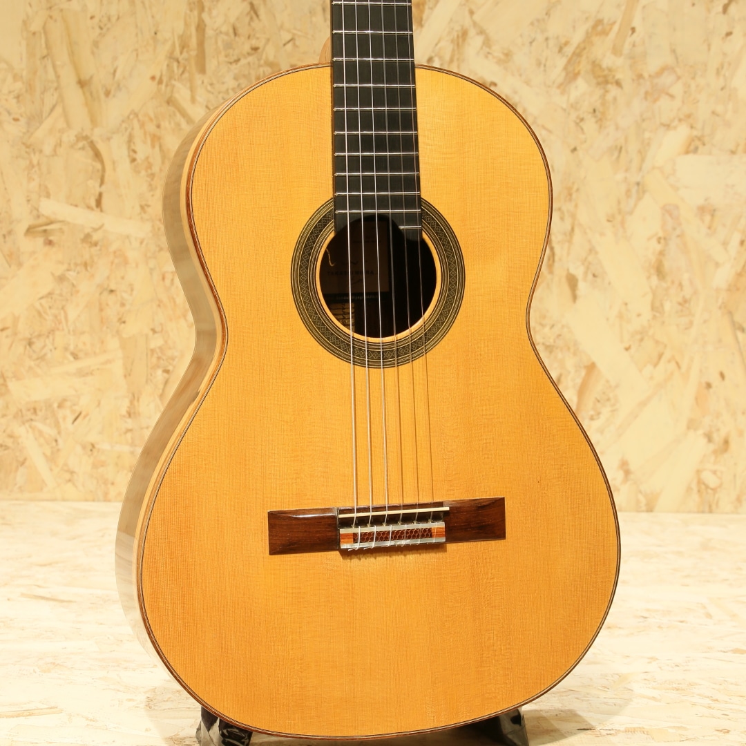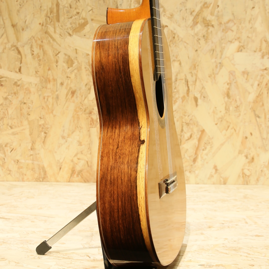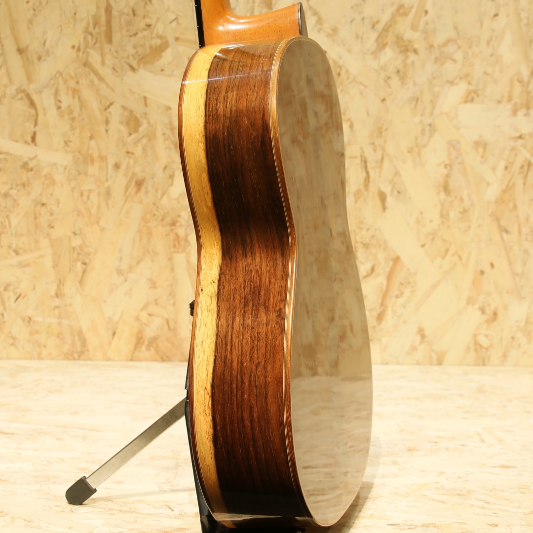 仙台に工房を構える約50年の製作キャリアを持つベテランルシアー"三浦隆志"。1973年札幌にてギター製作を開始、その後スペイン/グラナダにて世界的巨匠、アントニオ・マリン・モンテーロ氏に師事。氏の元でスペインの伝統製法やセラックニス塗装など技術を磨き、帰国後は仙台に工房を設け製作を開始しました。三浦氏の製作するギターは伝統的な手法に加え、独自のブリッジ構造やセラック塗装による仕上げなど革新的な製法を織り交ぜ、多くのギタリストに愛用されています。本器は2012年製の"SJ-1"、630mmスケールにて製作された1本。スプルーストップ、サップの入ったハカランダサイド&バック、シダーネック、エボニー指板、ローズウッドブリッジ、アイボロイドボタンスローンペグ、パイプ式ダブルホールブリッジ、630mmスケール。その名の通り、パイプを弦穴に取り付けた構造。ややサドル側に伸びたパイプからサドルへと延びる弦は通常モデルより角度がつき圧が強い為、余分な振動を抑えダイレクトな弦振動をブリッジを通して伝達します。また、渡欧の際に学んだ伝統的なセラックニス塗装を独自製造による添加剤を調合したセラックにて行い、セラック塗装の難点ともいえる湿気によるベタつきや水分反応による白化現象を抑制します。表面板には一部にハニカムコアを内包。現代音楽に求められる音量や抑揚の幅を得ることが出来るダブルトップ仕様です。(Honeycomb仕様器はハニカムコアがブリッジにモールドされています)630mmスケールにて仕上げられた本器、弱すぎず程良いテンション感は押弦時のストレスを軽減。ショートスケールながら安定した撥音、ハカランダらしい密度の高い艶やかな鳴り。程よくリバーブ感を含んだ奥深く豊潤なサウンド、堅実なトーンは程よいサスティンもありながら直線状に伸びていき、上質な音色を奏でます。サイドのくびれやボトムにうっすらとした擦り傷、ブリッジ下部に弦飛び跡が見られますがさほど目立たず、よく見てわかる程度のものです。演奏性を含めたネックコンディションは非常に良好。やや低めな弦高セッティングで扱いやすいアクションです。中古市場でも出物の少ない製作家の作品。是非、お手元でご体感ください。汎用ハードケースが付属します。