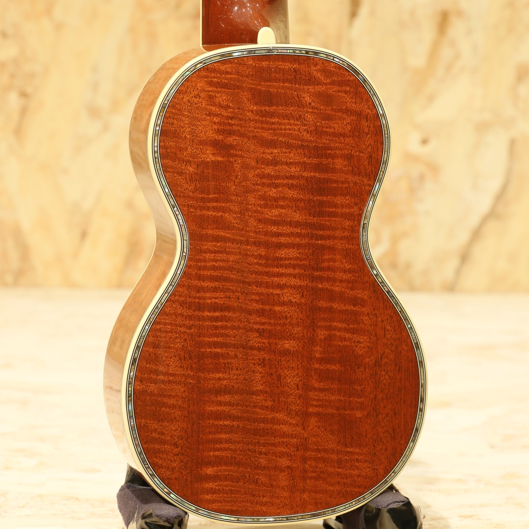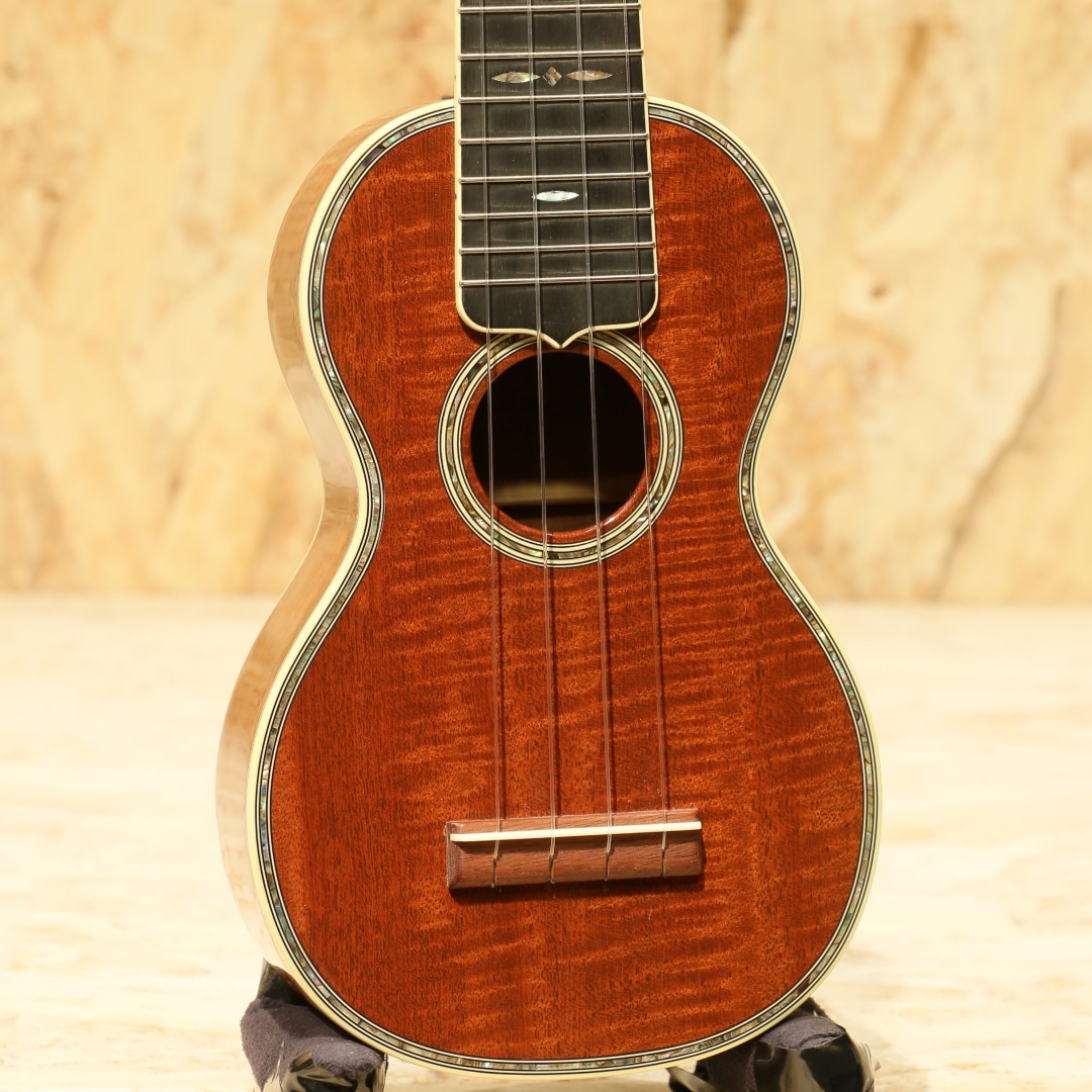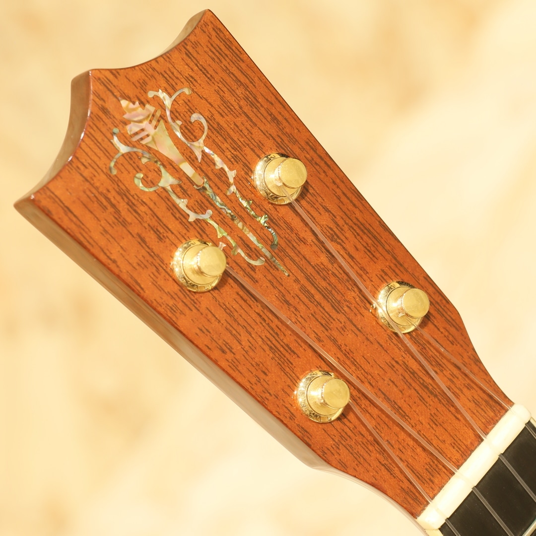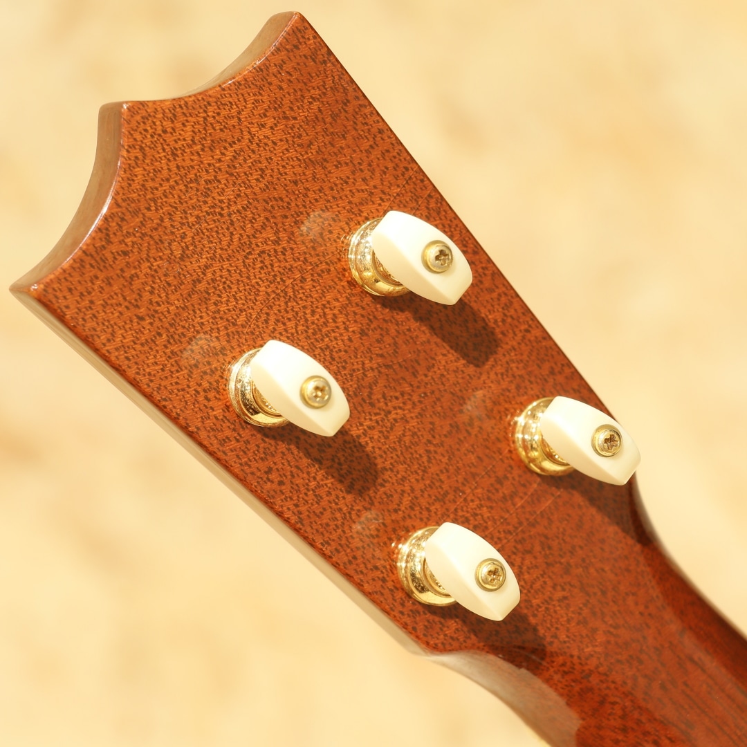 100年を超える歴史を持つマーチンウクレレ。ギターだけでなく、ウクレレにもファンの多いブランドです。本器は1930年代マーティン三世が妻のデイジーのために特別に最高級キューバンマホガニーボディでつくった"オリジナル・デイジー"を再現した特別なウクレレの精巧な復刻版。”5 Daisy”2007年製USED品です。ボディにはフレイムマホガニーが採用されていますが、特別なモデルに相応しい見事な素材でトップとバックはワンピース材です。エボニー指板、マホガニーブリッジ、オリジナルゴトーフリクションペグ(アイボロイドノブ)、フレイムマホガニー化粧板、フラワーポッドヘッドインレイ、スノーフレークス指板インレイ、アバロンロゼッタ&トリム、アイボロイドバインディング、グロスフィニッシュ。良質の素材が生み出す品のある音色に、スタイル5の飾りを踏襲した豪奢なルックスの限定生産品。ボディの中にはこのモデルのためのモデルシリアル入りインナーラベルがあります。ソプラノサイズの小さなボディからは想像できないボリューム、あたたかな響きのマホガニーサウンド。明瞭で艶のあるトーンながら心地よく耳に馴染む優しい響きと、ソプラノらしいコロンと軽やかな雰囲気も持ち合わせずっと鳴らしていたくなるような気持ちの良い音色です。ヘッド裏ペグ間にウェザーチェックと呼ばれるヒビが入っておりますが、このひび割れは気温や湿度の変化による木材と塗装面の伸縮率の違いにより生じるものであくまで塗装面がひび割れているだけで、木材は無傷です。その他には光にかざせば視認できる擦れキズがある程度。ネックの状態含めプレイコンディションも良好です。2007年に限定100本(SN:44/100)製作されたなかなか市場に出回らない希少なウクレレ。お探しだった方はどうぞご検討下さい。オリジナルハードケースが付属します。