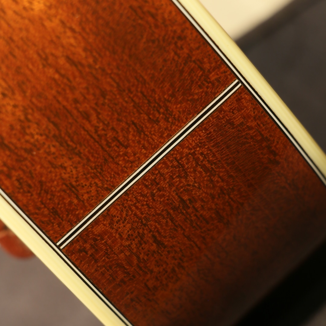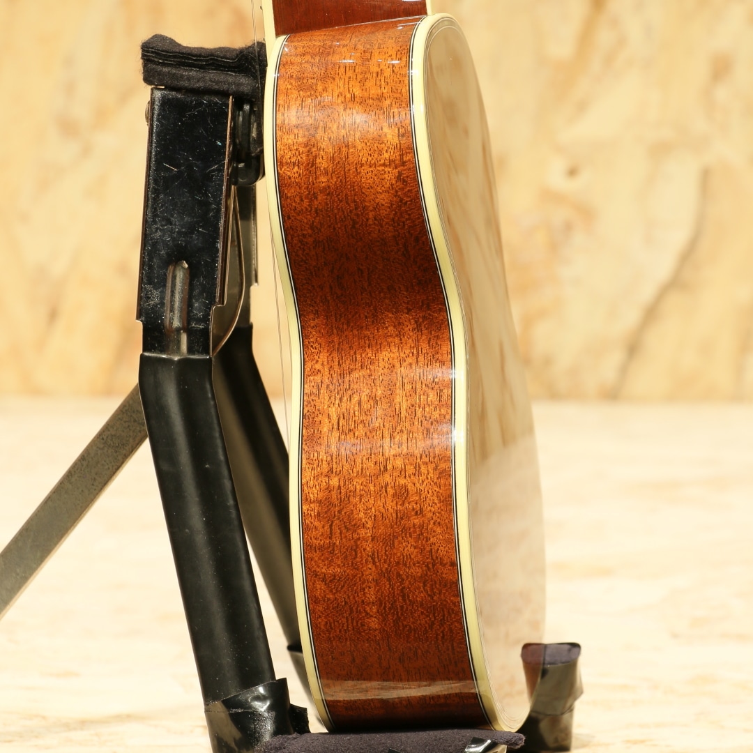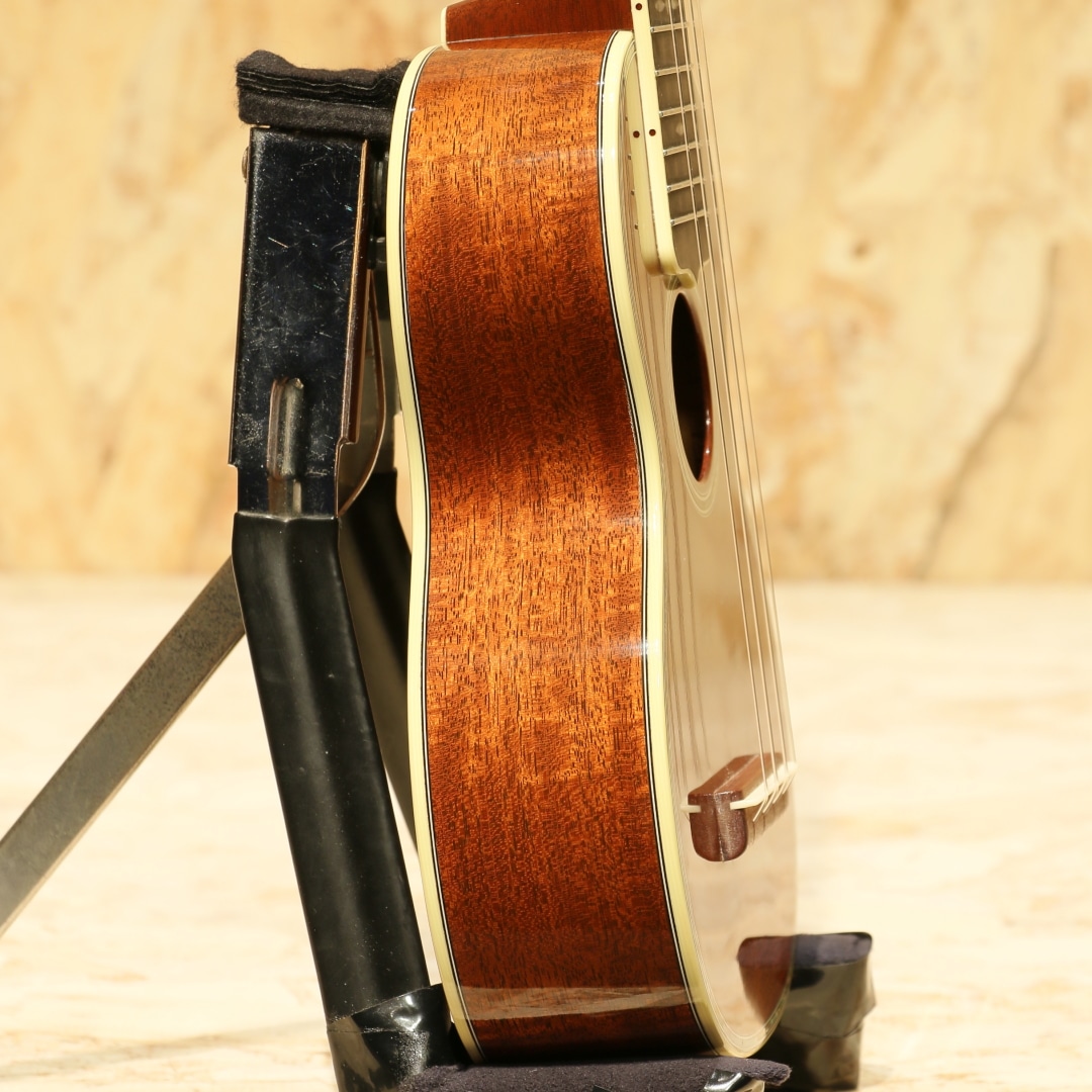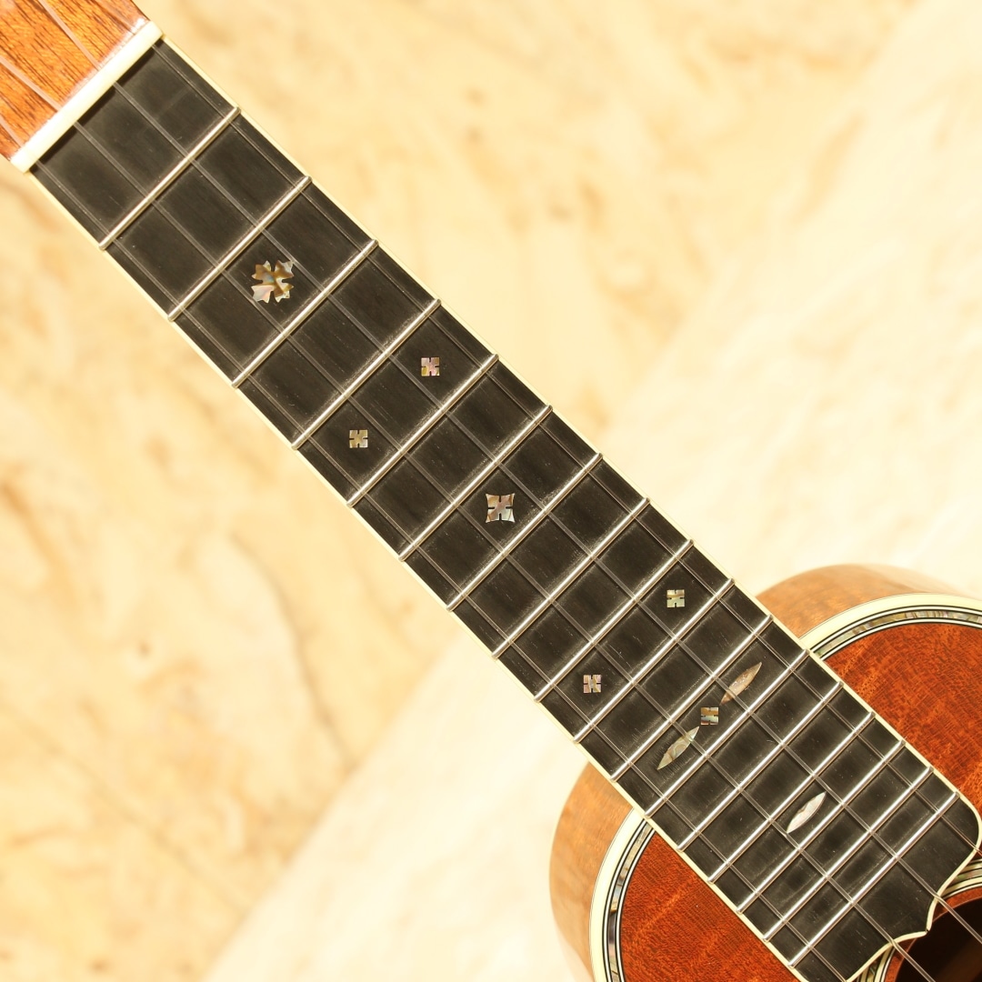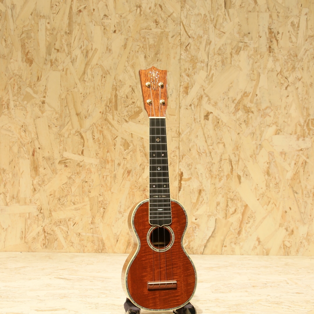 100年を超える歴史を持つマーチンウクレレ。ギターだけでなく、ウクレレにもファンの多いブランドです。本器は1930年代マーティン三世が妻のデイジーのために特別に最高級キューバンマホガニーボディでつくった"オリジナル・デイジー"を再現した特別なウクレレの精巧な復刻版。”5 Daisy”2007年製USED品です。ボディにはフレイムマホガニーが採用されていますが、特別なモデルに相応しい見事な素材でトップとバックはワンピース材です。エボニー指板、マホガニーブリッジ、オリジナルゴトーフリクションペグ(アイボロイドノブ)、フレイムマホガニー化粧板、フラワーポッドヘッドインレイ、スノーフレークス指板インレイ、アバロンロゼッタ&トリム、アイボロイドバインディング、グロスフィニッシュ。良質の素材が生み出す品のある音色に、スタイル5の飾りを踏襲した豪奢なルックスの限定生産品。ボディの中にはこのモデルのためのモデルシリアル入りインナーラベルがあります。ソプラノサイズの小さなボディからは想像できないボリューム、あたたかな響きのマホガニーサウンド。明瞭で艶のあるトーンながら心地よく耳に馴染む優しい響きと、ソプラノらしいコロンと軽やかな雰囲気も持ち合わせずっと鳴らしていたくなるような気持ちの良い音色です。ヘッド裏ペグ間にウェザーチェックと呼ばれるヒビが入っておりますが、このひび割れは気温や湿度の変化による木材と塗装面の伸縮率の違いにより生じるものであくまで塗装面がひび割れているだけで、木材は無傷です。その他には光にかざせば視認できる擦れキズがある程度。ネックの状態含めプレイコンディションも良好です。2007年に限定100本(SN:44/100)製作されたなかなか市場に出回らない希少なウクレレ。お探しだった方はどうぞご検討下さい。オリジナルハードケースが付属します。