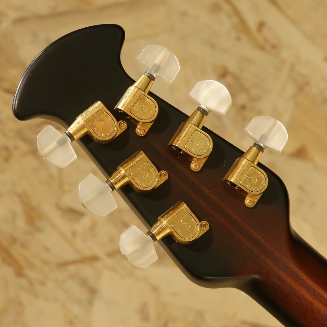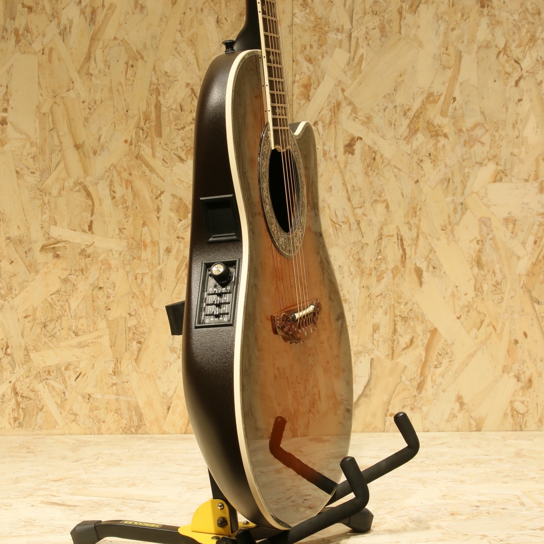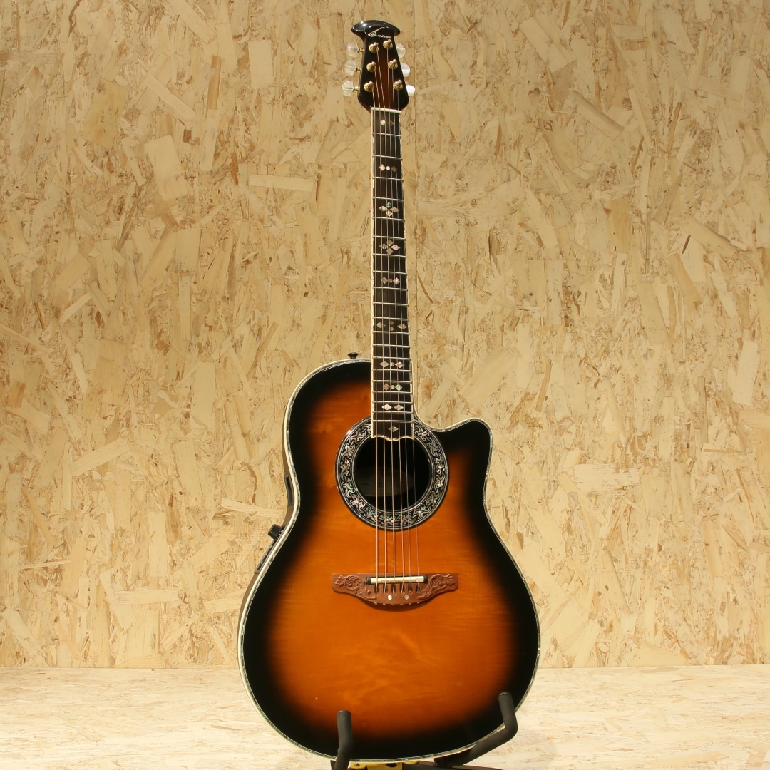 1966年、ヘリコプターの製造会社の社長であり、有名なギタリストでもあったチャールズ・カーマンによって設立されたオベーションは航空機の技術をギターに活かしたエレクトリックアコースティックギターを発売。保守的なミュージシャンにも受け入れられ、エレアコの代名詞的ブランドへと成長します。本機は当時の日本代理店だった中尾貿易による特別オーダー品、ボディサイズ違いの2種類で合計120本だけ作られた内の1種類”N869S”。1993年製USED品です。フレイムメイプルトップ、リラコード樹脂製ディープボウルカッタウェイ、マホガニーネック、エボニー指板、ウォルナットブリッジ、パーロイドボタンのオリジナルシャーラーペグ、OP24プリアンプ内蔵。当時N869シャローボールとN869スーパーシャローの2種類で合計120本製造、1993-1994年にかけて製造された日本代理店特別オーダー品です。カスタムレジェンドと同じくエポレットのロゼッタ、ゴールドのペグ、装飾入りのブリッジ、アバロントリムと特別感のある仕様。ボディサイズはスーパーシャロ―、ボディ厚が一番薄いタイプになります。抱えた際の圧迫感は無く、音の立ち上がりにも優れたサイズ。細やかなフレーズにも追従しやすいポテンシャルを備えたモデルです。ピックアップシステムにはOP24プリアンプを搭載。3BAND EQ,Volとシンプルな構成、操作性も容易で直感的に操作が出来るシステムです。ウォームで暖かいサウンドからブライトなサウンドまで幅広いサウンドメイクが可能。扱いやすさを備えたシステムです。ロゼッタのエポレットに僅かヒビが入っているのが見られる点や僅か弾きキズが見られる点、ペグのくすみが見られる点、サドル(P.U)の出し代こそやや少なめではあるものの全体的に使用感は薄く良好な状態をキープされている本器。ネックコンディションも整えられ演奏性の高い個体です。数の少ない代理店オーダーのOvation。豪華さを備えた状態の良い1本。ご検討の方は是非お早めに。