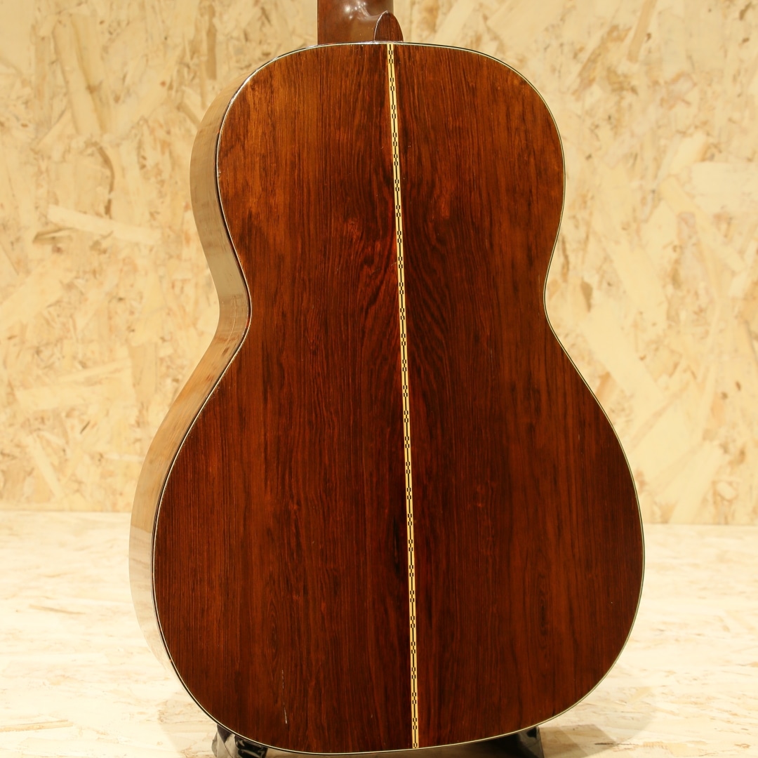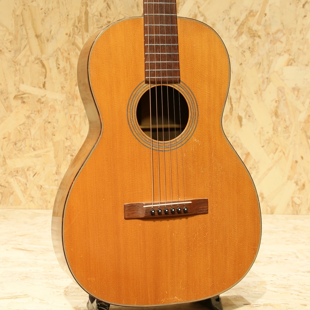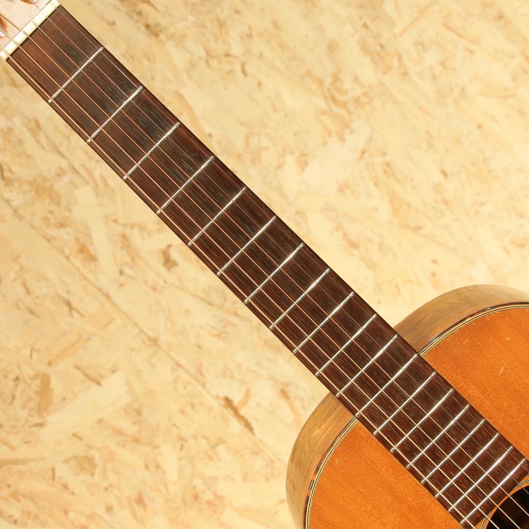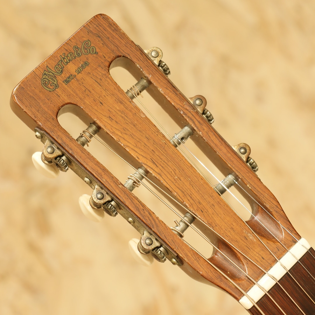 十九世紀からラインナップされていた由緒正しい機種"00-21"、1965年製ビンテージ品。定着している18や28スタイルと比べれば幾分生産規模が小さい為、あまり出回りません。本器はとりわけマニアックなファンから人気の高い21スタイルダブルオーサイズです。ハカランダサイドバックを配した貴重な時期ものになります。スプルーストップ、ハカランダサイド&バック、マホガニーネック、ハカランダ指板&ブリッジ、T-Barロッド、チェッカーバックストリップ、ハカランダ化粧板、オリジナルペグ、ノンスキャロップドXブレイシング。ノンピックガード。綺麗なハカランダが使われた見栄えの良いギターで、当時売れ線だったモデルと比べれば生産規模は非常に小さなものとなります。通りの良いブライトなトーンが売りで、コンパクトなサイズ感とは裏腹に大きな音で鳴るギターです。1弦側サイドくびれ部分2箇所クラック修正跡あり、バック下部クラック修正跡がありますがしっかり補正されています。トップにはクラックもなく、フィニッシュもオリジナルをキープ。トップの膨らみもなく良い状態がキープされています。ネックの状態も比較的ストレートでよい状態をキープ。サドルの残りマージンが低めですが、ブリッジが削られていない証拠で当時のセットアップと言える状態です。無理のないフィット感と耳ざわりの良い涼しい音色の一台です。オリジナルハードケース付属。