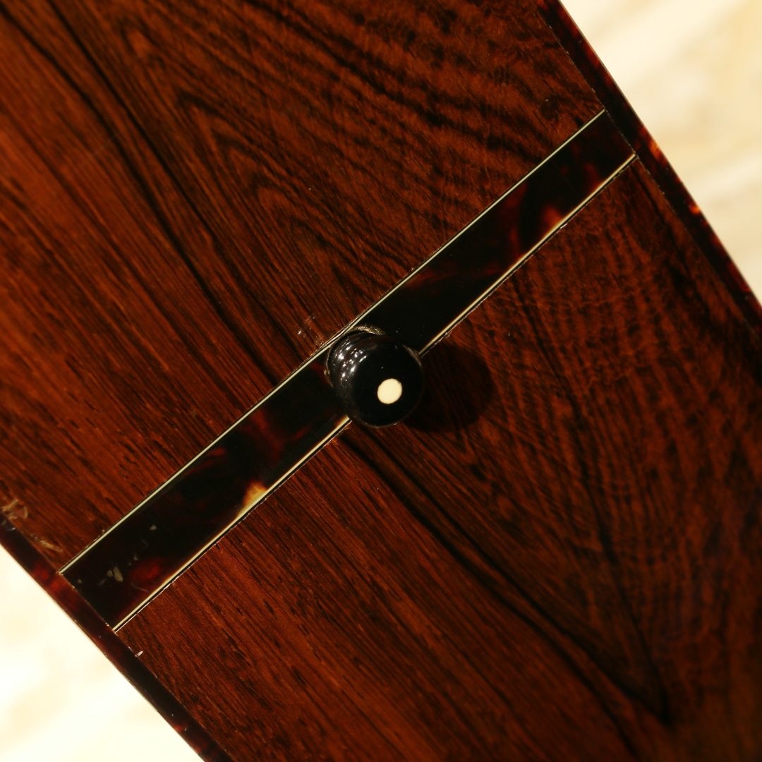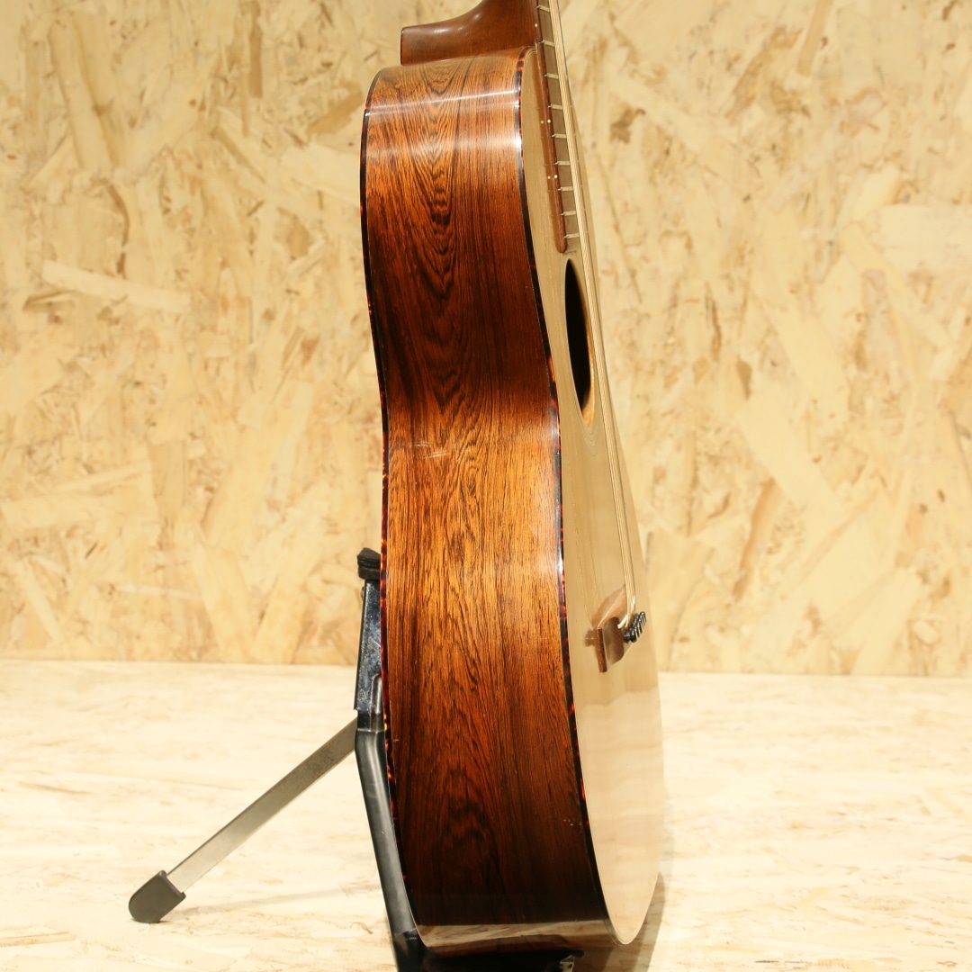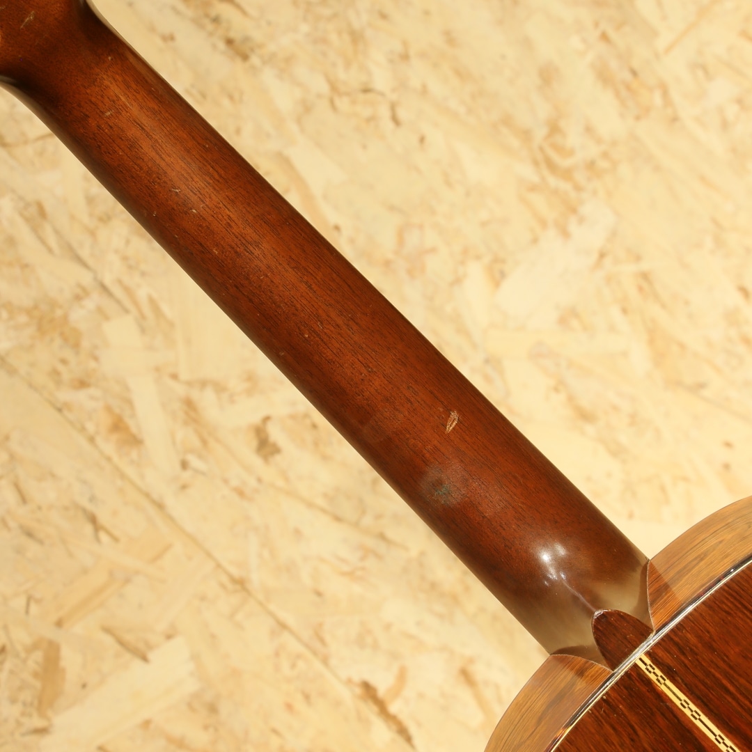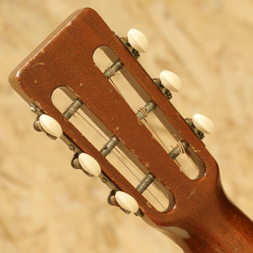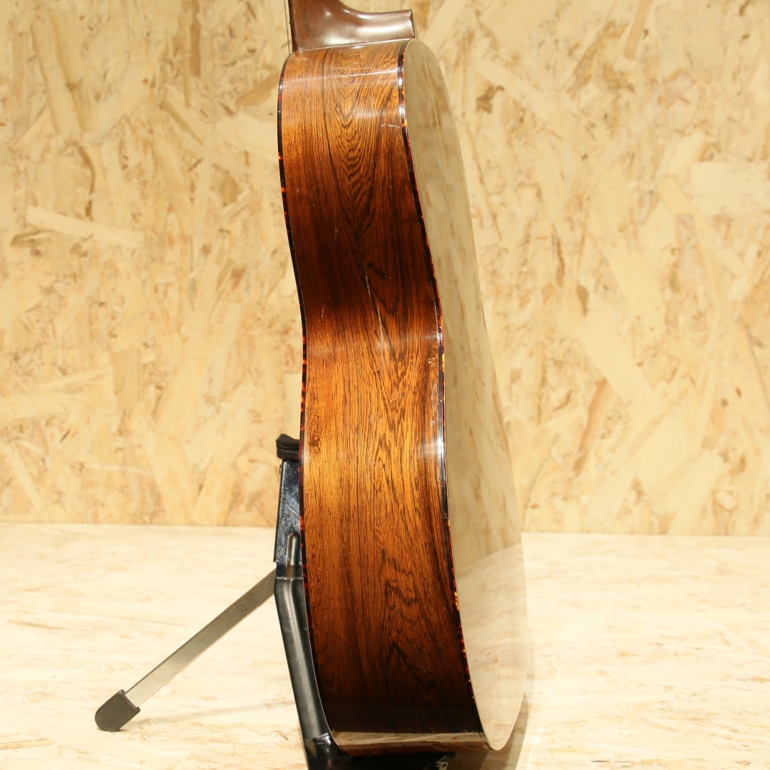 十九世紀からラインナップされていた由緒正しい機種"00-21"、1965年製ビンテージ品。定着している18や28スタイルと比べれば幾分生産規模が小さい為、あまり出回りません。本器はとりわけマニアックなファンから人気の高い21スタイルダブルオーサイズです。ハカランダサイドバックを配した貴重な時期ものになります。スプルーストップ、ハカランダサイド&バック、マホガニーネック、ハカランダ指板&ブリッジ、T-Barロッド、チェッカーバックストリップ、ハカランダ化粧板、オリジナルペグ、ノンスキャロップドXブレイシング。ノンピックガード。綺麗なハカランダが使われた見栄えの良いギターで、当時売れ線だったモデルと比べれば生産規模は非常に小さなものとなります。通りの良いブライトなトーンが売りで、コンパクトなサイズ感とは裏腹に大きな音で鳴るギターです。1弦側サイドくびれ部分2箇所クラック修正跡あり、バック下部クラック修正跡がありますがしっかり補正されています。トップにはクラックもなく、フィニッシュもオリジナルをキープ。トップの膨らみもなく良い状態がキープされています。ネックの状態も比較的ストレートでよい状態をキープ。サドルの残りマージンが低めですが、ブリッジが削られていない証拠で当時のセットアップと言える状態です。無理のないフィット感と耳ざわりの良い涼しい音色の一台です。オリジナルハードケース付属。