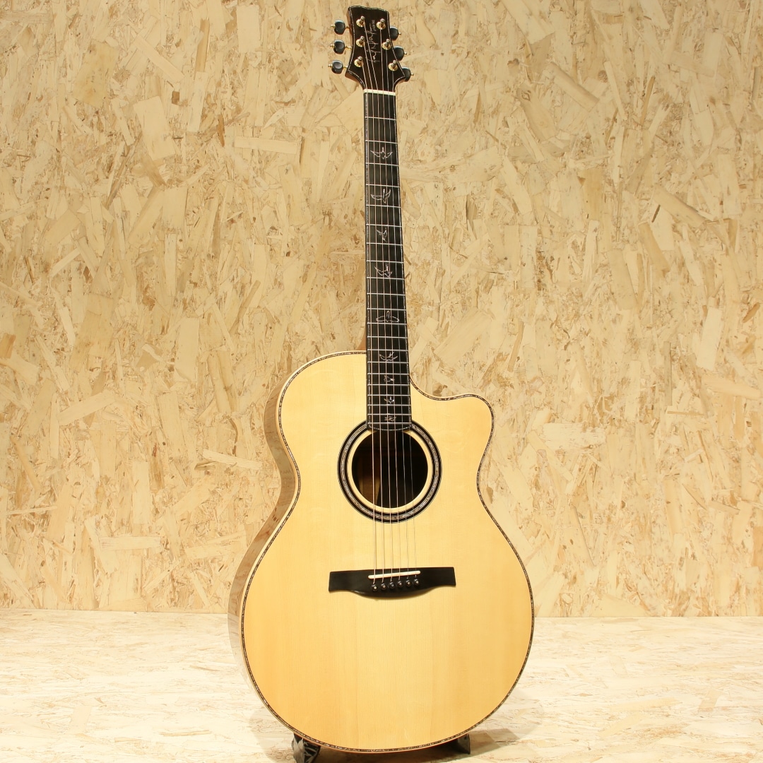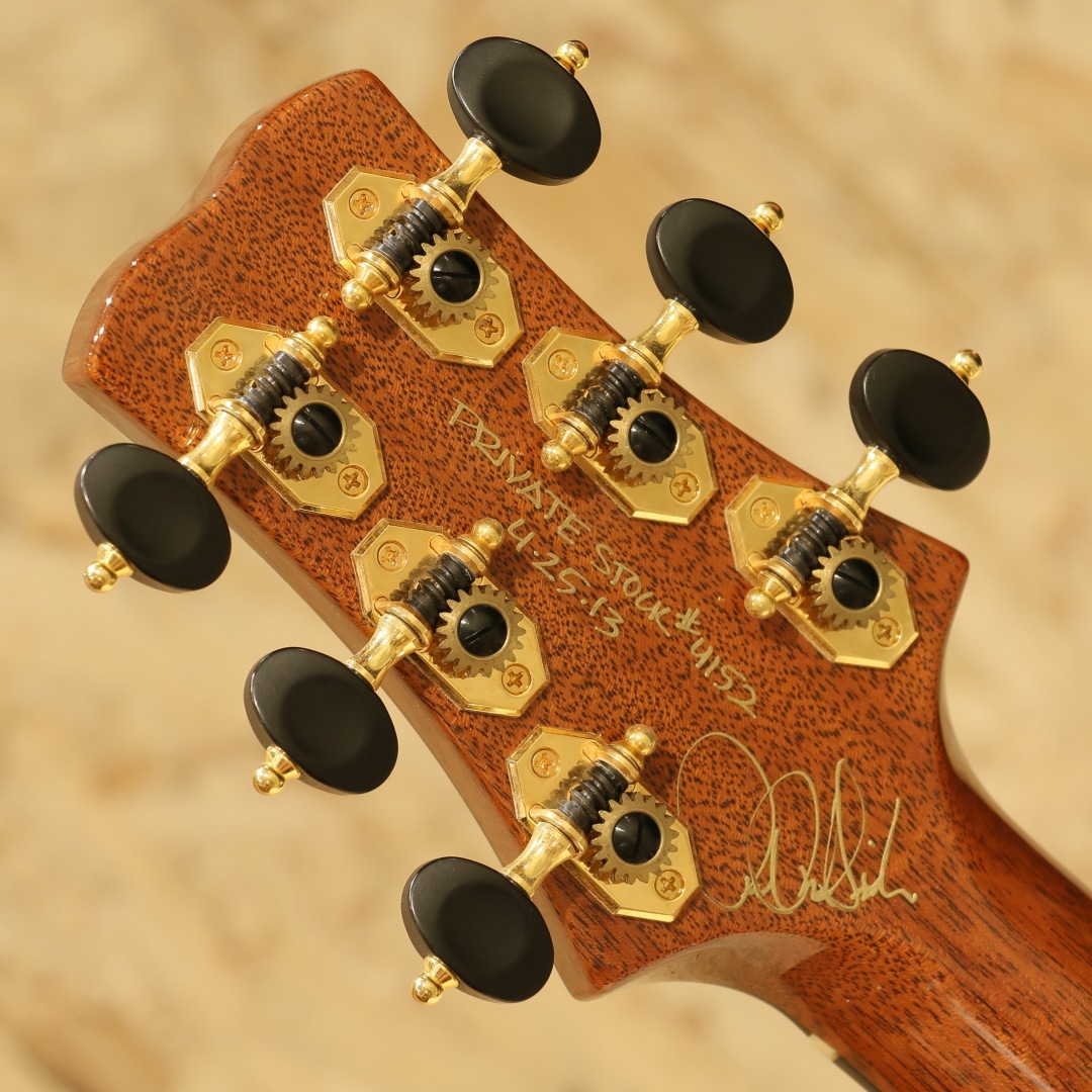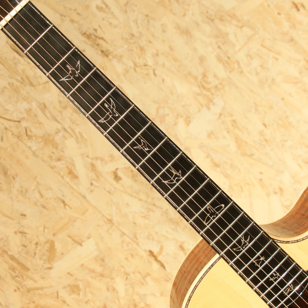 エレキギターシーンでは確固たるブランドイメージを持つ、ポール・リード・スミスが開発に四年以上も費やしたというアコースティックライン。中でもプライベートストックモデルは別格の作りと価格で取引されていました。プライベートストックラインは秘蔵の材を贅沢に使用し、各工程の精鋭達を結集させたスペシャルチームが製作を担うカスタムオーダーラインです。本器は2013年のWinter NAMW showでお披露目となった本ブランドアコースティックの定番機種アンジェラスをベースに製作されたスコットランド出身のフィンガーギタリスト"トニー・マクマナス"シグネイチャーモデル。アンジェラスは約16インチのグランドオーディトリアムシェイプです。トップに細かくびっしりとベアクロウの入ったヨーロピアンベアクロウスプルース、サイド&バックはエキゾチックな杢目が目を惹くサップ入りココボロ材が使われています。昨今、入荷困難といわれているぺルビアンマホガニーネック、エボニー指板&ブリッジ、ゴトー製エボニーノブゴールドペグ、カーリーメイプルバインディング、オリジナル18V駆動ピックアップシステム内蔵(コンタクトピエゾタイプ)。ロゼッタやパフリング、指板インレイやヘッドストックインレイはエボニー&パウアハートで装飾されており豪華ながら統一感のある仕上がりです。ブレイシングはエックスとファンのハイブリッドタイプ、鉄弦を留めるトップ強度と繊細な音色のニュアンスを表現する豊かさを実現させたPRSオリジナル構造です。製作はプライベートストックの職人が担当し、ポール・リード・スミス氏自らも材の選定から各工程に至るまで携わります。腕利きの職人数名が通常のラインとは別テイクで小規模に製作する、プレミアム指向のPRSです。とにかくウッディで、音の一粒が分厚くパワーがあり、並外れた重厚な音色が持ち味。密度が高く質量の感じられるトーンですが、反応自体は重たくなくスピードのあるテクニカルなプレイスタイルにも対応します。また、重厚さからなる美しく伸びるサスティンもサウンドも魅力の1つです。コンタクトP.U.による18V駆動のオリジナルプリアンプ搭載、ボディタップの再現も高く、1チャンネルながらナチュラルなラインサウンドをお楽しみいただけます。1弦側サイド面くびれ箇所と6弦側サイド面上肩部の塗装内部に指紋跡のようなものが確認できますが、恐らく製造時からのものかと思われます。その他僅かな塗装の曇りが見られますがよく見て分かる程度のもので全体的に風合いを損ねるレベルではなくとても良いコンディションをキープしています。ネック&プレイコンディションも良好、希少価値の高いハイクオリティーな木材、贅の限りを尽くしたインレイなどはまさに工芸品の域に達しています。芸術的な美しさはもちろん、サウンド、プレイアビリティに至るすべてにおいて拘り抜かれたギターです。オリジナルのアメリテイジハードケースが付属します。 Condition:EX+++ Top:Solid European Bearclow Spruce Side:Solid Cocobolo Back:Solid Cocobolo Neck:Peruvian Mahogany Fingerboard:Ebony Bridge:Ebony Machine Head:Gotoh Gold Ebony knob Fingerboard Inlay:Paua Heart Birds Rosette:Ebony&Paua Heart Binding:Curly Maple Pick Guard:none Pick up:PRS Acoustic Pickup System(Contact Piezo) Nut width:45mm Scale:640mm Case:Original Ameritage Hard Case
