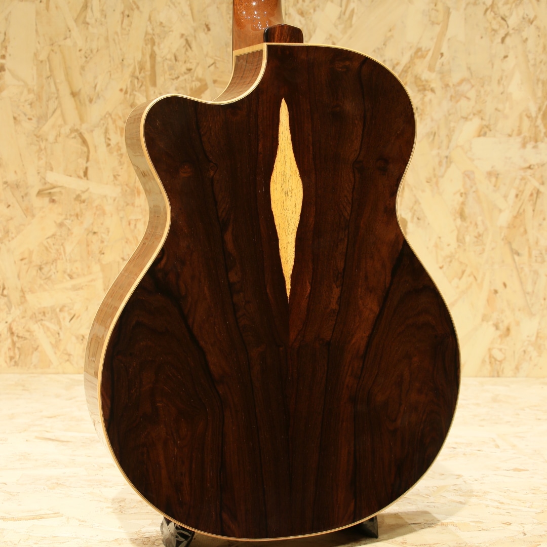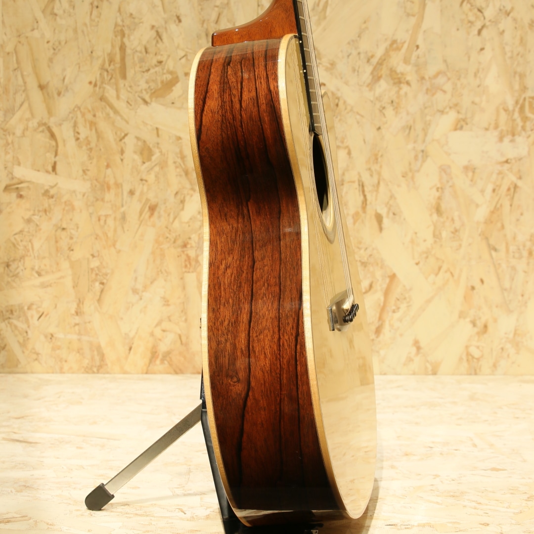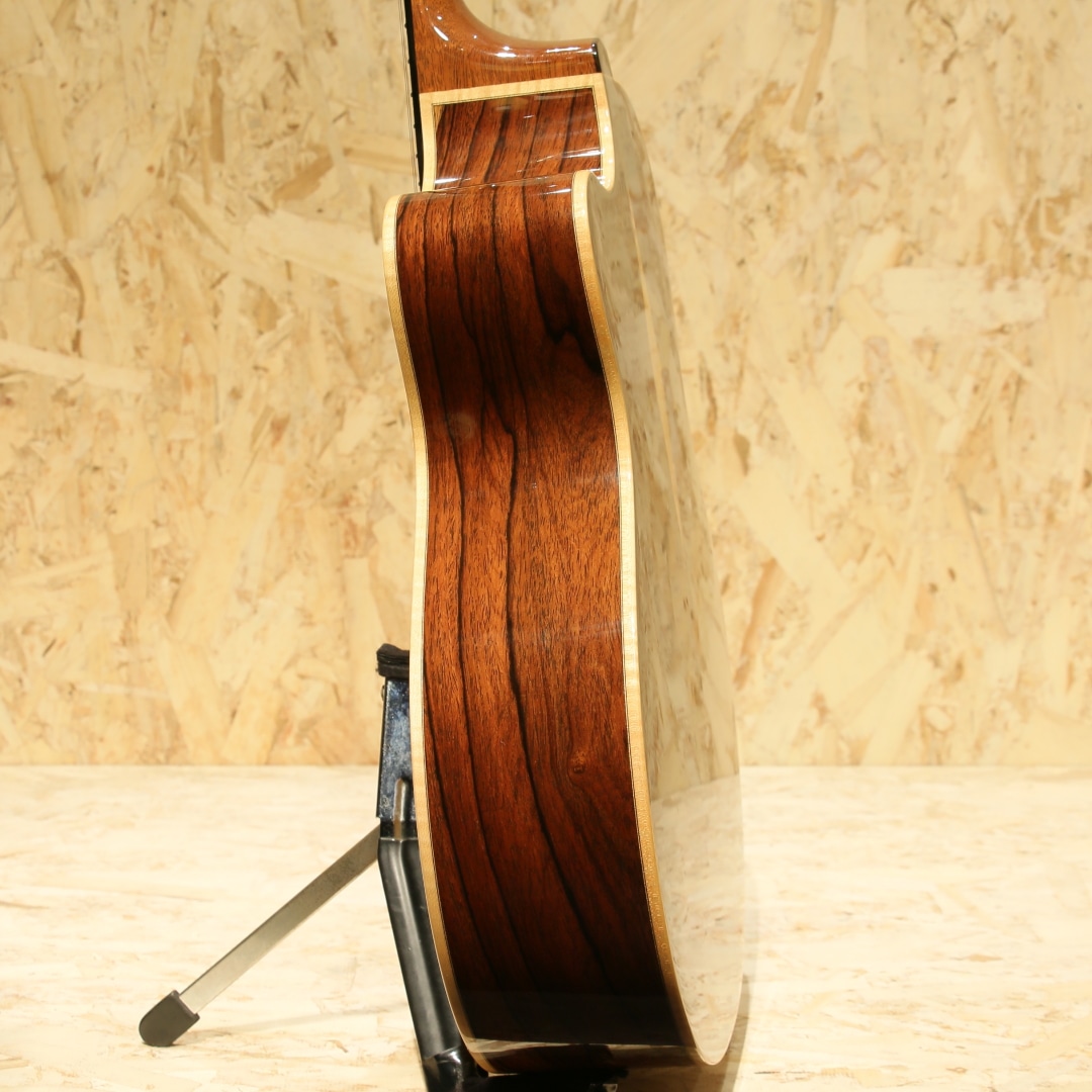 エレキギターシーンでは確固たるブランドイメージを持つ、ポール・リード・スミスが開発に四年以上も費やしたというアコースティックライン。中でもプライベートストックモデルは別格の作りと価格で取引されていました。プライベートストックラインは秘蔵の材を贅沢に使用し、各工程の精鋭達を結集させたスペシャルチームが製作を担うカスタムオーダーラインです。本器は2013年のWinter NAMW showでお披露目となった本ブランドアコースティックの定番機種アンジェラスをベースに製作されたスコットランド出身のフィンガーギタリスト"トニー・マクマナス"シグネイチャーモデル。アンジェラスは約16インチのグランドオーディトリアムシェイプです。トップに細かくびっしりとベアクロウの入ったヨーロピアンベアクロウスプルース、サイド&バックはエキゾチックな杢目が目を惹くサップ入りココボロ材が使われています。昨今、入荷困難といわれているぺルビアンマホガニーネック、エボニー指板&ブリッジ、ゴトー製エボニーノブゴールドペグ、カーリーメイプルバインディング、オリジナル18V駆動ピックアップシステム内蔵(コンタクトピエゾタイプ)。ロゼッタやパフリング、指板インレイやヘッドストックインレイはエボニー&パウアハートで装飾されており豪華ながら統一感のある仕上がりです。ブレイシングはエックスとファンのハイブリッドタイプ、鉄弦を留めるトップ強度と繊細な音色のニュアンスを表現する豊かさを実現させたPRSオリジナル構造です。製作はプライベートストックの職人が担当し、ポール・リード・スミス氏自らも材の選定から各工程に至るまで携わります。腕利きの職人数名が通常のラインとは別テイクで小規模に製作する、プレミアム指向のPRSです。とにかくウッディで、音の一粒が分厚くパワーがあり、並外れた重厚な音色が持ち味。密度が高く質量の感じられるトーンですが、反応自体は重たくなくスピードのあるテクニカルなプレイスタイルにも対応します。また、重厚さからなる美しく伸びるサスティンもサウンドも魅力の1つです。コンタクトP.U.による18V駆動のオリジナルプリアンプ搭載、ボディタップの再現も高く、1チャンネルながらナチュラルなラインサウンドをお楽しみいただけます。1弦側サイド面くびれ箇所と6弦側サイド面上肩部の塗装内部に指紋跡のようなものが確認できますが、恐らく製造時からのものかと思われます。その他僅かな塗装の曇りが見られますがよく見て分かる程度のもので全体的に風合いを損ねるレベルではなくとても良いコンディションをキープしています。ネック&プレイコンディションも良好、希少価値の高いハイクオリティーな木材、贅の限りを尽くしたインレイなどはまさに工芸品の域に達しています。芸術的な美しさはもちろん、サウンド、プレイアビリティに至るすべてにおいて拘り抜かれたギターです。オリジナルのアメリテイジハードケースが付属します。 Condition:EX+++ Top:Solid European Bearclow Spruce Side:Solid Cocobolo Back:Solid Cocobolo Neck:Peruvian Mahogany Fingerboard:Ebony Bridge:Ebony Machine Head:Gotoh Gold Ebony knob Fingerboard Inlay:Paua Heart Birds Rosette:Ebony&Paua Heart Binding:Curly Maple Pick Guard:none Pick up:PRS Acoustic Pickup System(Contact Piezo) Nut width:45mm Scale:640mm Case:Original Ameritage Hard Case