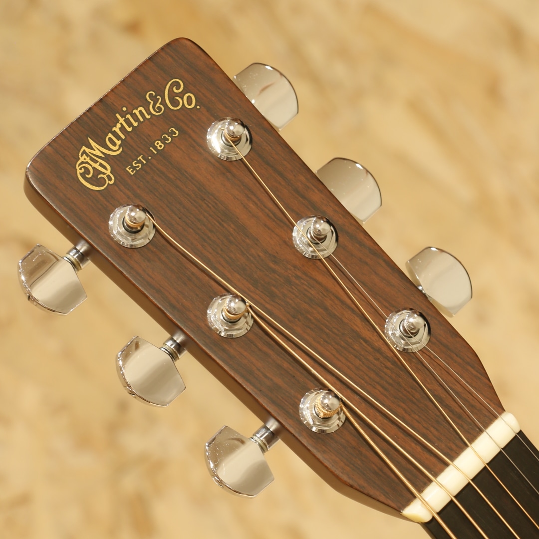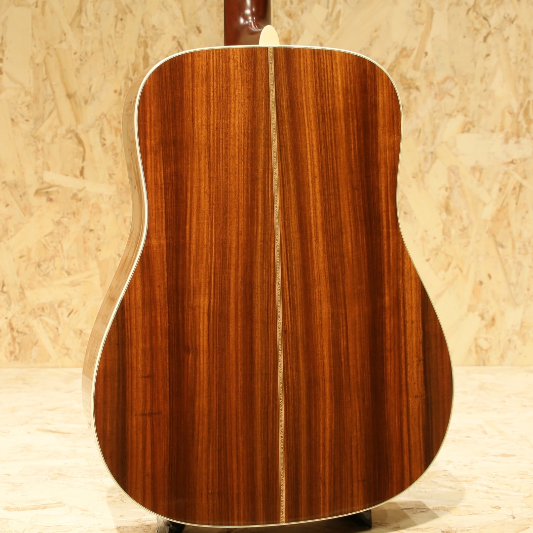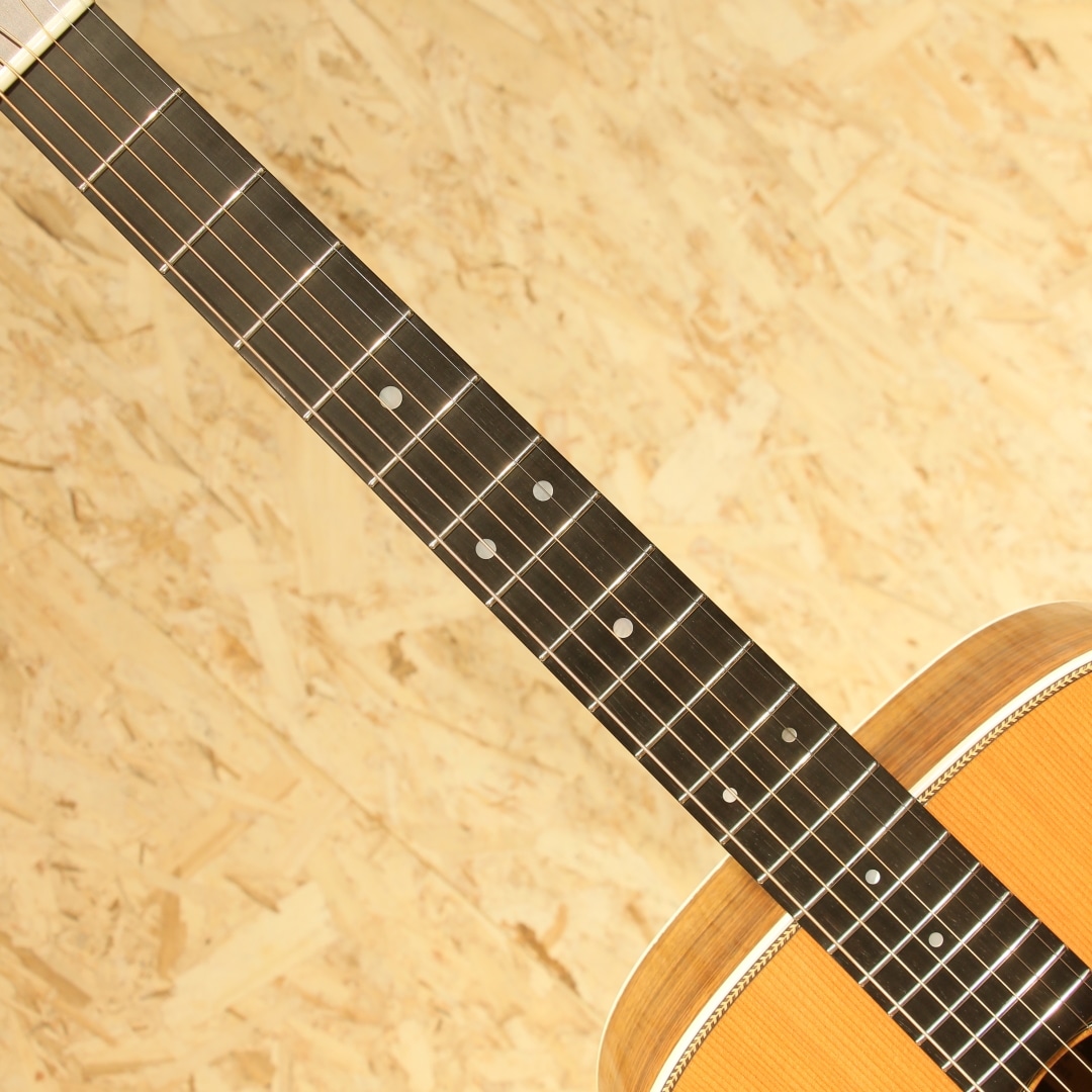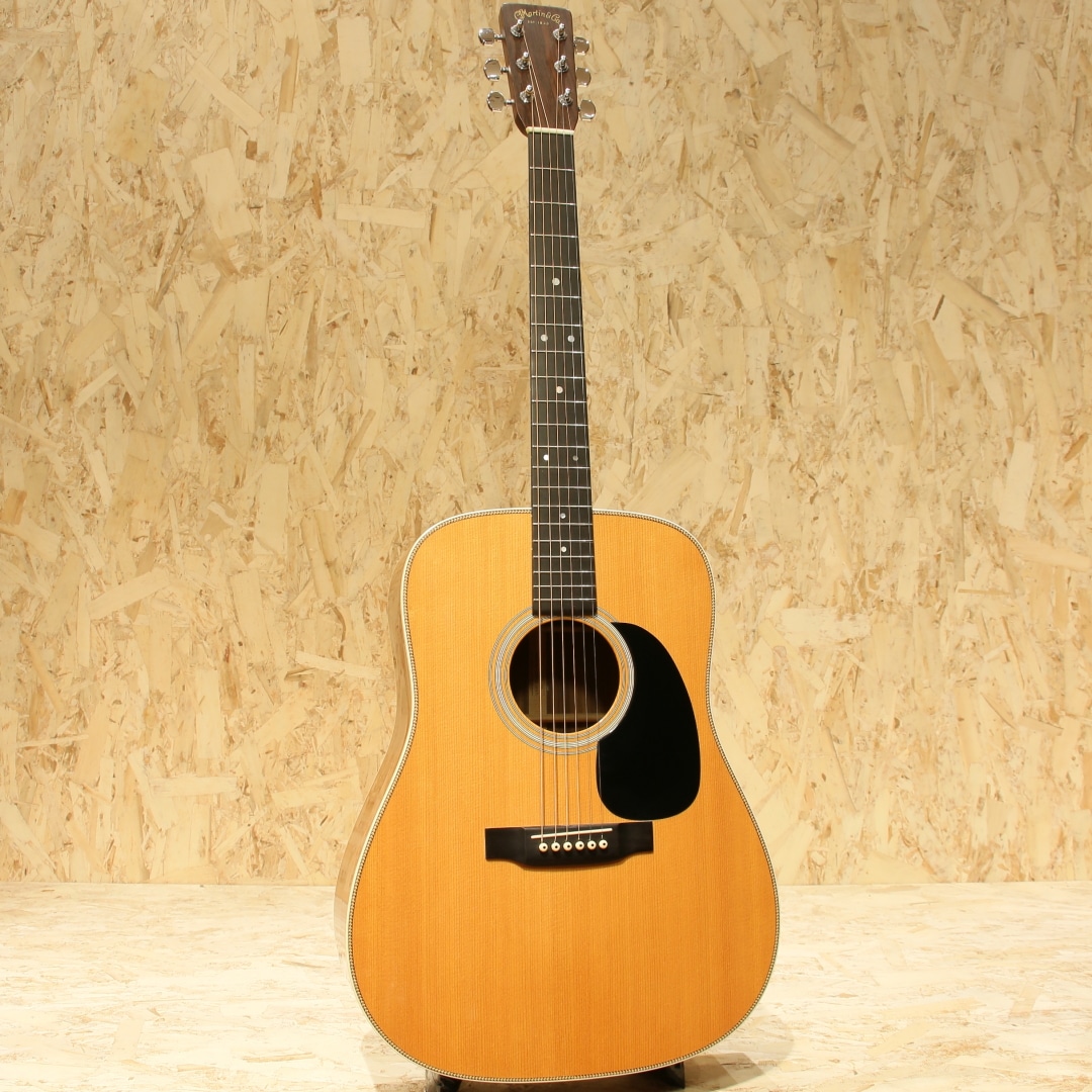 HD-28は1944年まで採用されていた戦前期後半のスキャロップドXブレイシング仕様や1946年までのヘリンボーントリム仕様がデフォルトだった時代のD-28からインスパイアされたモデル。1976年に製造されてからもD-28シリーズの隠れた名器として人気を集め続けている機種です。本器は1990年製のUSED品。1985年でレギュラーでの使用が中止となったスクエアーロッド(SQ)を採用した1990年のUSEDアイテムです。スプルーストップ、ローズウッドサイド&バック、マホガニーネック、エボニー指板&ブリッジ、オリジナルシャーラーペグ、オールドタイプヘッドロゴ、ピックガードはややオーバーサイズの面取りされた風合いの良いブラックガードに交換されています。ヘリンボーントリム、スモールメイプルブリッジプレート、ジグザグバックストリップ、スクエア(SQ)ロッド、スキャロップドXブレイシング。ファットで立ち上がりに躍動感があるサウンドで弾けるように膨らむエアリーな音像はHD28ならでは。ネックはSQのため少し丸みを帯びたシェイプですが、それほど厚みはなく安心感のあるグリップです。スクエアロッドでしか出しえない重厚な音色でストローク一振りでこれこれと納得させられてしまいます。ネック裏のわずかな打痕、ボディー全体の薄傷やわずかな打痕、マーティンではまず大体に見られるバインディング剥がれの修正跡などは見られますが極めて良い状態でメンテナンスされており大事に使われてきた個体と一見で頷けます。ネックの状態もストレートで素晴らしく弾きやすくセットアップされており大変良好。オリジナルのハードケースも付属した状態良好品です。