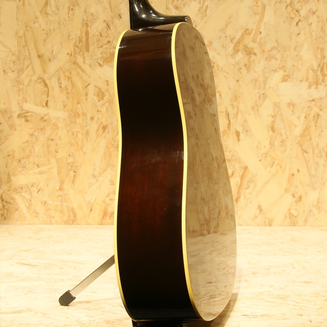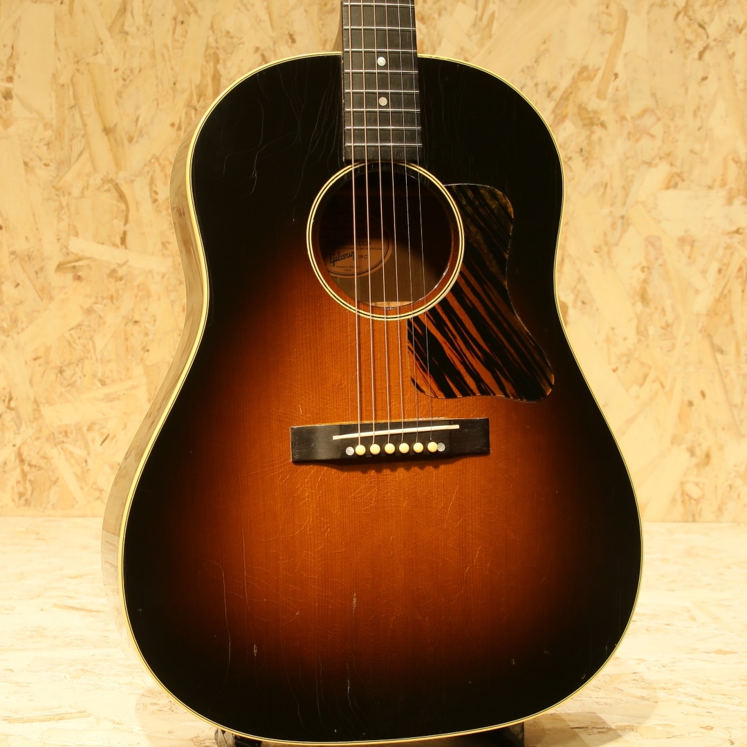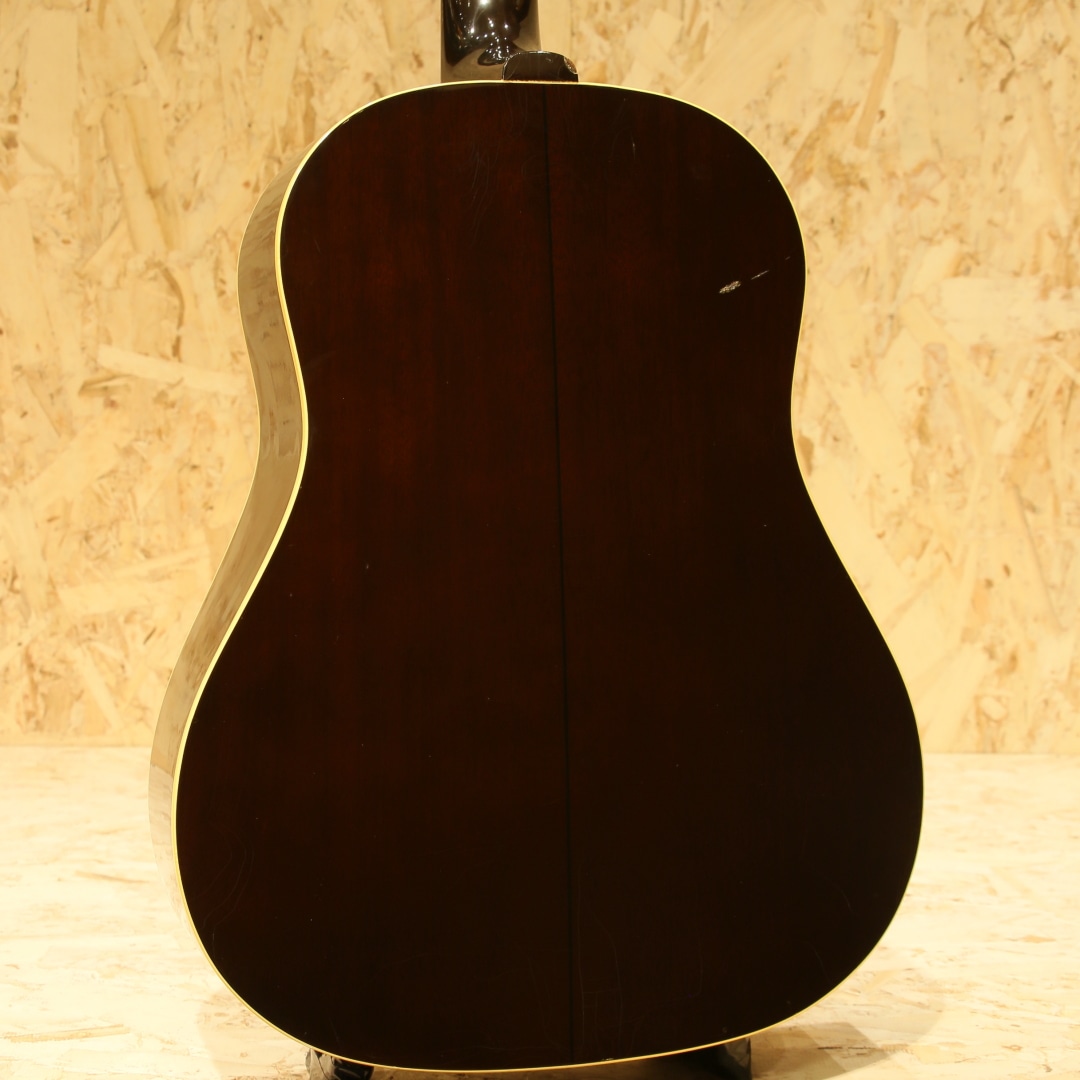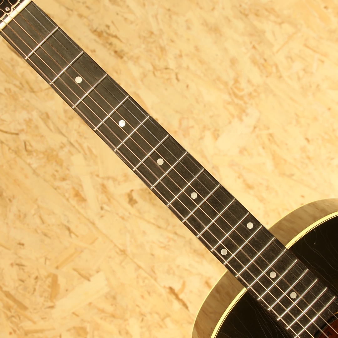 ギブソンJ-35は当時アドバンスドジャンボの下位機種として1936~1942年頃まで発売され、後の"J-45"・"J-50"に繋がる原型となった"J-35"。内部のブレイシングを含め様々なものが存在し、手探りで製作が行われていたことが窺えるモデル。挑戦的なアプローチは後のJ-45にも引き継がれた、歴史的にも重要な機種と言えます。本器は1939年仕様を基に製作が行われた”1939 Style Reissue J-35”。2003年製のUSED品です。スプルーストップ、マホガニーサイド&バック、マホガニーネック、エボニー指板&レクタングルブリッジ、ロングサドル仕様、ゴトー製オープンバッククロームペグ、スクリプトパールロゴ、ファイヤーストライプピックガード。J-35自体はジャンボの後継機種として枝分かれした機種、Advanced Jumboの廉価モデルという立ち位置でした。製作が行われる中でトーンバーが3本と2本の時期があり、更にはスキャロップが入っている入っていない等の細やかな変化がありました。1939年にはネック形状がVから丸みを帯びたUシェイプへと変化し、ネックヒールも尖った形状から丸いモノへと変更されました。仕様としては最終期、その時期をイメージして製作が行われたのが本器となります。30sらしいルックスを多分に含んだ仕様、通な方にも納得して頂けるであろうディティールで製作が行われています。現代の感覚でも馴染みやすい丸みを帯びたグリップ、厚み自体もさほど厚くなく握り応えのあるネックへと成形されています。スキャロップが施されているだけに空気感を含んだトーン、爆発力を伴った響きが魅力。ギブソンらしい太い音色、J-45よりもやや繊細で艶やかなトーンを持ち、透明感のある音色を持ち併せています。ピックでのストローク、ダイナミックなタッチにも対応でき、フィンガーでの繊細なタッチにも追従できるポテンシャルからジャンルやスタイルを問わないオールマイティさを与えられた1本。ボディトップやボディバック、ネックヒール箇所やヘッド先端などのの細やかな当てキズ、ウェザーチェックや細やかな擦りキズ等見られますが、年式を考えると比較的キレイなコンディションをキープ。板の割れなどはなく良好な状態です。ネックのコンディションも整えられ、弾きやすい状態をキープされた良好な演奏性を持つ1本です。30sのルックス、数々の伝説を作り上げてきたJ-45の前日譚に当たるJ-35。この機種が無ければJ-45が生まれることも無かったのではないかと考えられる歴史的に重要な機種です。現代のギターに近い最終期の復刻モデル、是非一度ご体感下さいませ。
