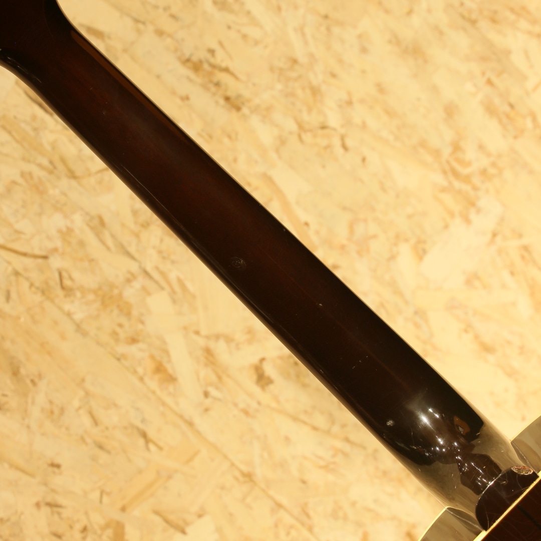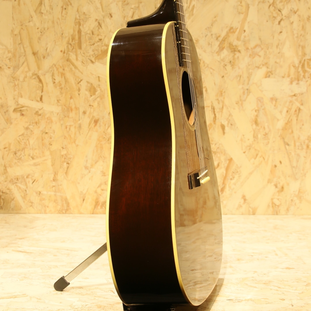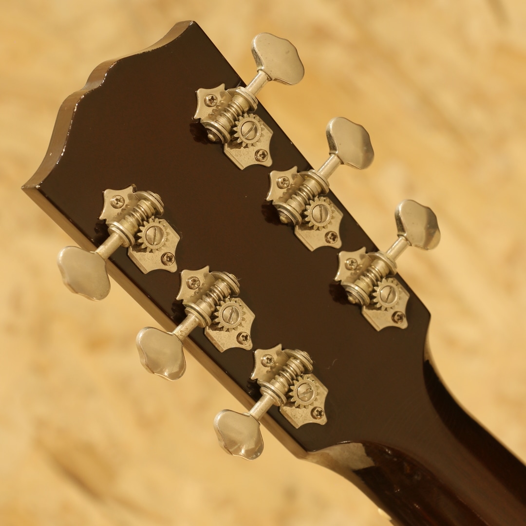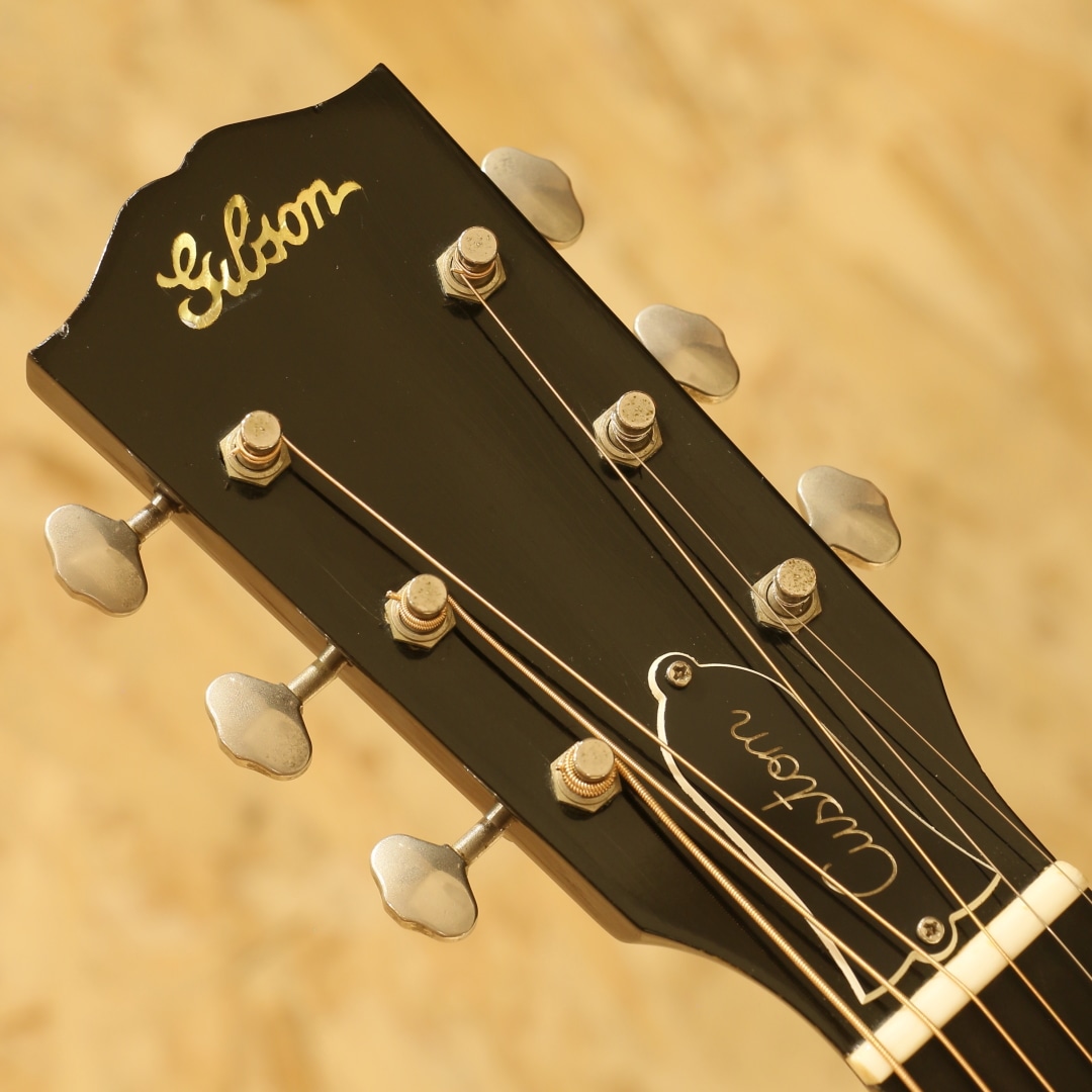 ギブソンJ-35は当時アドバンスドジャンボの下位機種として1936~1942年頃まで発売され、後の"J-45"・"J-50"に繋がる原型となった"J-35"。内部のブレイシングを含め様々なものが存在し、手探りで製作が行われていたことが窺えるモデル。挑戦的なアプローチは後のJ-45にも引き継がれた、歴史的にも重要な機種と言えます。本器は1939年仕様を基に製作が行われた”1939 Style Reissue J-35”。2003年製のUSED品です。スプルーストップ、マホガニーサイド&バック、マホガニーネック、エボニー指板&レクタングルブリッジ、ロングサドル仕様、ゴトー製オープンバッククロームペグ、スクリプトパールロゴ、ファイヤーストライプピックガード。J-35自体はジャンボの後継機種として枝分かれした機種、Advanced Jumboの廉価モデルという立ち位置でした。製作が行われる中でトーンバーが3本と2本の時期があり、更にはスキャロップが入っている入っていない等の細やかな変化がありました。1939年にはネック形状がVから丸みを帯びたUシェイプへと変化し、ネックヒールも尖った形状から丸いモノへと変更されました。仕様としては最終期、その時期をイメージして製作が行われたのが本器となります。30sらしいルックスを多分に含んだ仕様、通な方にも納得して頂けるであろうディティールで製作が行われています。現代の感覚でも馴染みやすい丸みを帯びたグリップ、厚み自体もさほど厚くなく握り応えのあるネックへと成形されています。スキャロップが施されているだけに空気感を含んだトーン、爆発力を伴った響きが魅力。ギブソンらしい太い音色、J-45よりもやや繊細で艶やかなトーンを持ち、透明感のある音色を持ち併せています。ピックでのストローク、ダイナミックなタッチにも対応でき、フィンガーでの繊細なタッチにも追従できるポテンシャルからジャンルやスタイルを問わないオールマイティさを与えられた1本。ボディトップやボディバック、ネックヒール箇所やヘッド先端などのの細やかな当てキズ、ウェザーチェックや細やかな擦りキズ等見られますが、年式を考えると比較的キレイなコンディションをキープ。板の割れなどはなく良好な状態です。ネックのコンディションも整えられ、弾きやすい状態をキープされた良好な演奏性を持つ1本です。30sのルックス、数々の伝説を作り上げてきたJ-45の前日譚に当たるJ-35。この機種が無ければJ-45が生まれることも無かったのではないかと考えられる歴史的に重要な機種です。現代のギターに近い最終期の復刻モデル、是非一度ご体感下さいませ。