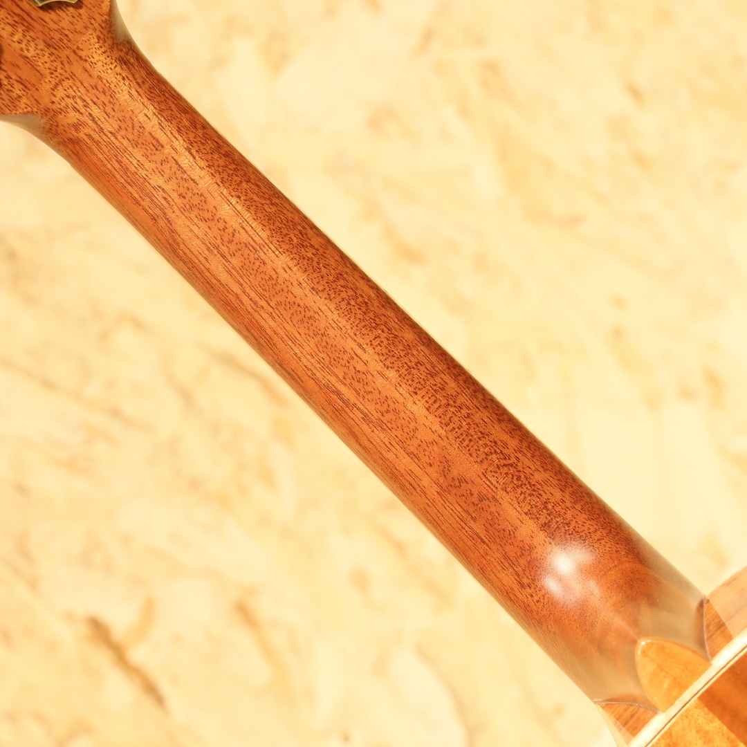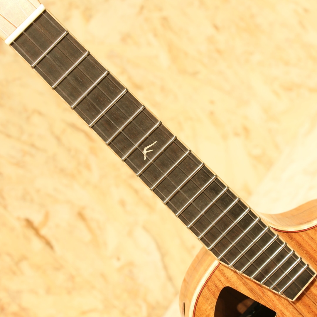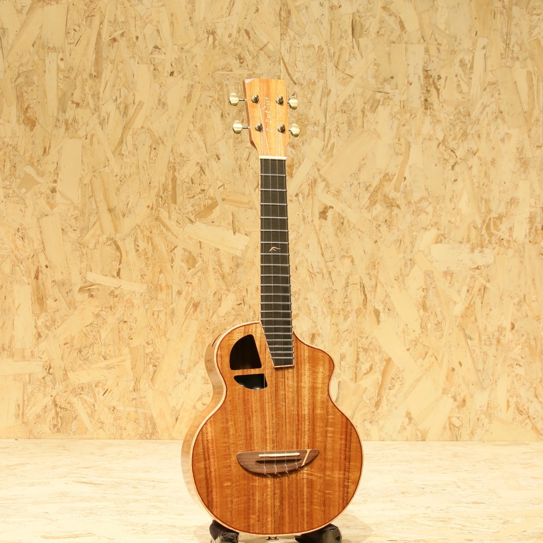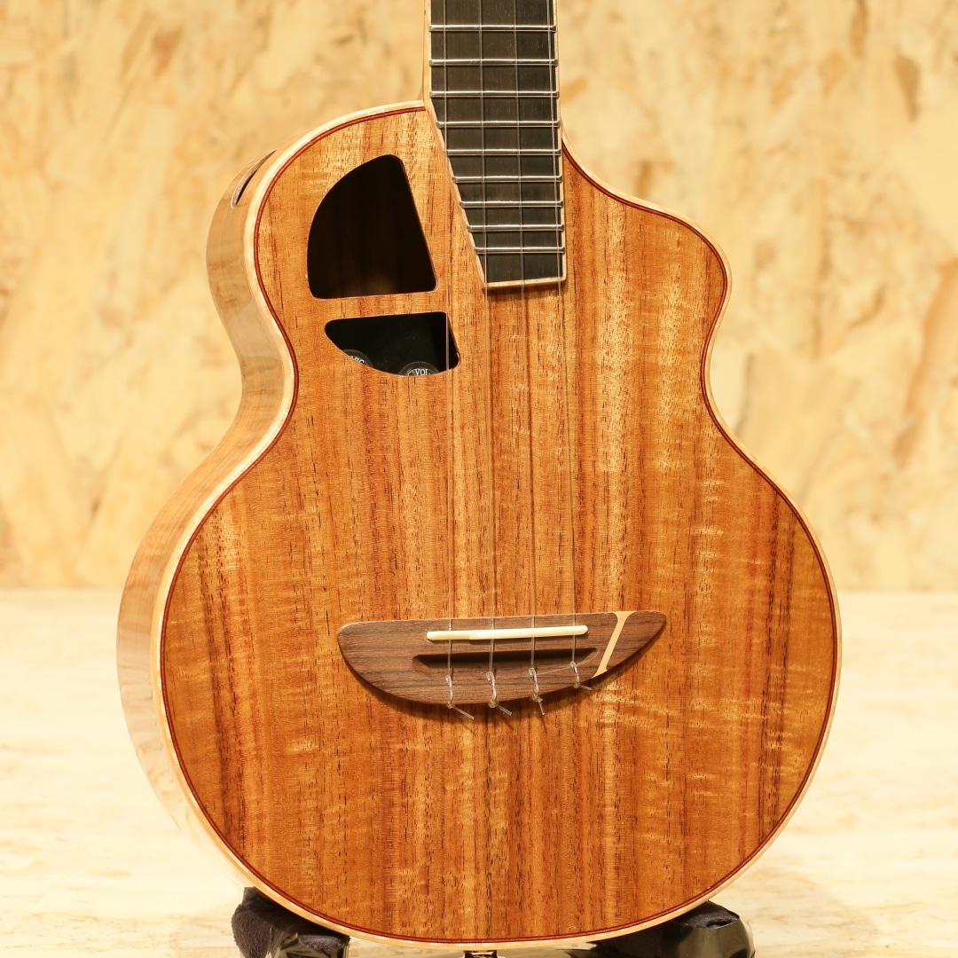 L.Luthierは2009年マレーシアの創業者Adwin Lai(アドウィン・ライ)によって生まれた新進気鋭のアジアンギターブランド。10代でギターと作曲を始め、大学ではギターと声楽を専門に勉強、実際にシングルをリリースするなどミュージシャンとしての知識を持ち合わせており、独自の考察から生み出される楽器達は内部の構造のみならず、オリジナリティー溢れるデザインにも反映されています。本器はオールコアボディーを採用したコンサートウクレレ、Le Light Koa。ギターのLEシリーズ同様、トップ低音側上部に配置された独自のサウンドホールとサイド側にマウントされたサウンドポートはパフォーマンス中に高い感度を実現。演奏者自身が聞くサウンドと聴衆へ届けるサウンドをセパレートしモニタリングすることを考えている所が特徴です。オールコアボディー、マホガニーネック、エボニー指板、ローズウッドメイプルラインデザイン入りのブリッジ、オープンゴールドギヤペグ、緩やかにラウンドされたベネチアンカッタウェイ、バインディングセルは杢入りのメイプルにカラー、レッドカラーに着色されたウッドライントリムがアクセントになっており、モダンなデザインのアクセントになっています。オリジナルのアクティブピックアップはアンダーサドルピエゾとコンデンサーマイクの2WAY構造。トップ側のホール部分に取り付けられたサムホイールでボリューム、マイクバランサーの2つを容易にコントロール出来る優れものです。ライン出力サウンドでバランスが良く、かつナチュラルで表現力の高いサウンドはライブ、生配信などに持ってこいです。音色はコンサートサイズながらもパワフルで芯がありかつ繊細なタッチにもしっかり反応してくれるのでソロウクレレにもオススメ。ワンランク上のコストパフォーマンス抜群の1本、ぜひお試しください。持ち運びに便利なオリジナルのギグケース付属。