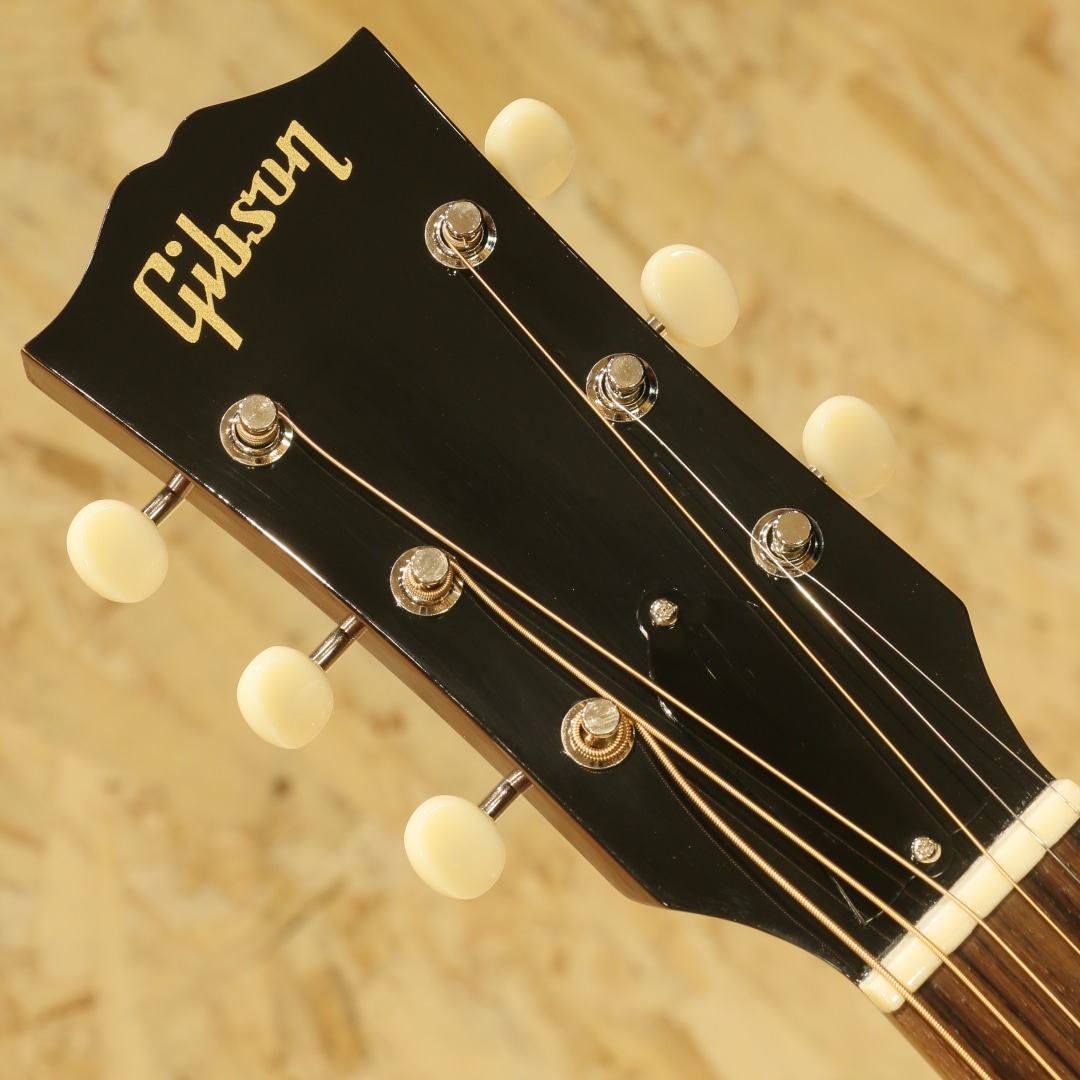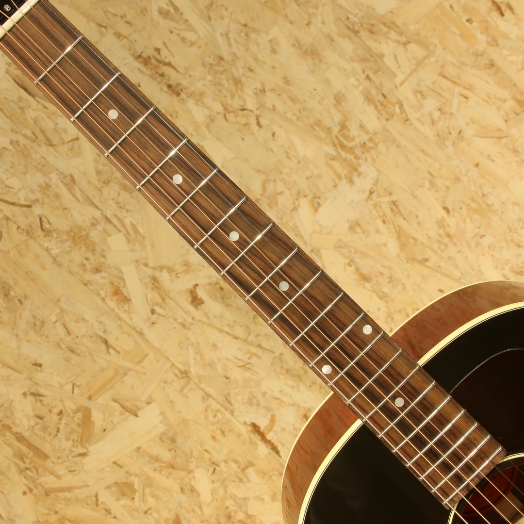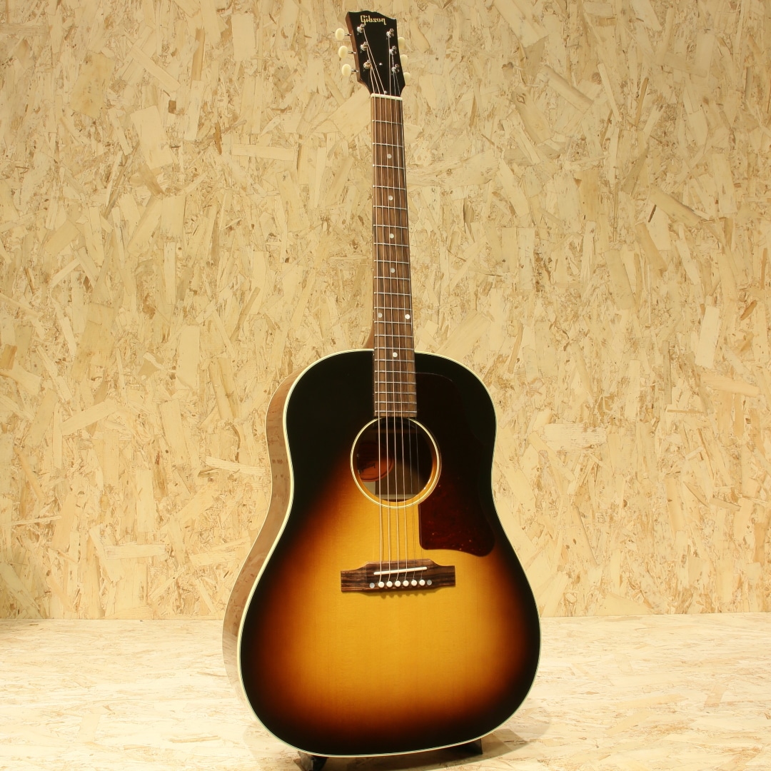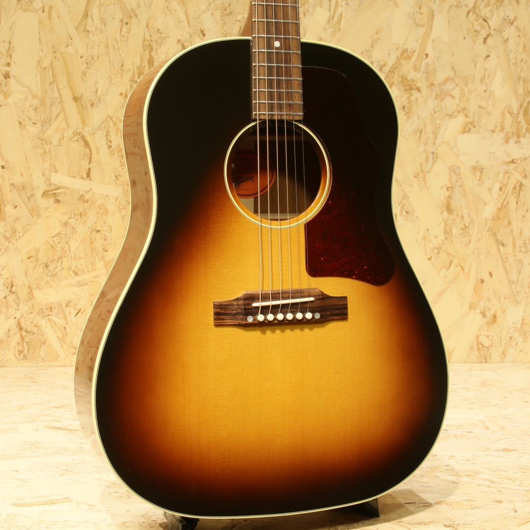 1942年にギブソンが発売を開始したJ-45。通称ワーキング・ホース、ライバルであるマーチン社のドレッドノートモデルに対抗すべく製造開始されたラウンドショルダー型ジャンボシリーズのひとつで、ギブソン製のアコースティックギターのなかではもっとも有名で広く使われるモデルです。本器は50年代のデザインを復刻したオールドファッションなモデル"50's J-45 Original VS"。スプルーストップ、マホガニーサイド&バック、マホガニーネック、ローズウッド指板&ブリッジ、ストレートノーマルスロットサドル、シングルリングロゼッタ、MOP指板ドット、ラージピックガード、トラディショナルハンドスキャロップド・Xブレイシング、ギブソンらしいヴィンテージサンバーストカラー。べっ甲柄ラージピックガード、やや厚みを持たせた太めのラウンドネック、意図的に黄ばみをつけたバインディング、クルーソン白ボタン3連ペグ等々、通常モデルのStandardとは一線を画した仕様。当時のテイストを織り込んだルックスに仕上がっています。やや厚みのある太めのネックらしくファットで太いサウンドを得られるのも魅力の一つ。Standardモデルと比較してもよりラウドなサウンドを響かせてくれます。聞き馴染みのあるハードなストロークから繊細なアルペジオまで、ザラついた個性的な音でありながら幅広くカバーできる1本です。L.R.Baggs社製element VTCピックアップ搭載であらゆるシチュエーションへの対応力も充分。生音でもラインサウンドでも、オールラウンドな1本と言えるでしょう。ワークホース(働き馬)の名の通り様々なタイミングで働かせたくなるようなギターです。ラージガードに憧れのある方、J-45と言えばサンバーストという方には是非オススメの1本。オリジナルハードケースが付属します。